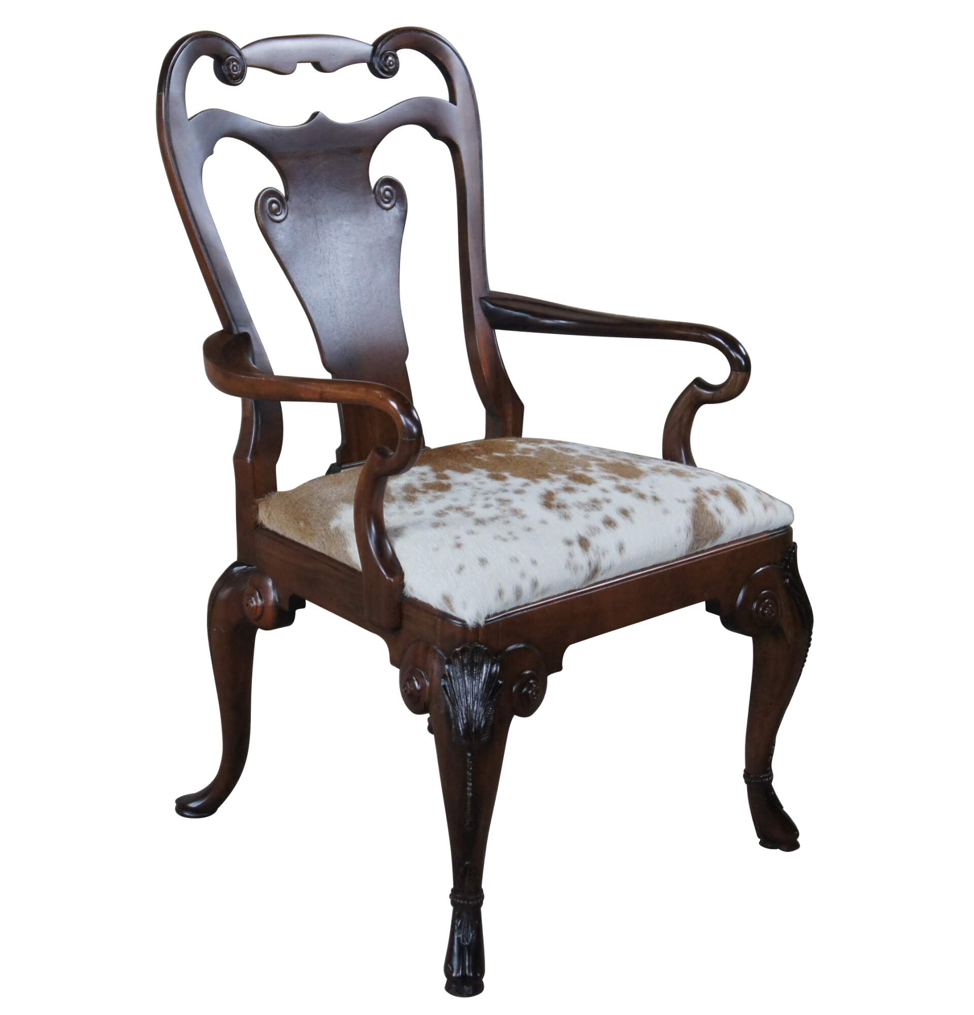 An exceptional pair of Vintage Ralph Lauren Henredon Beekman dining arm chairs. Made from mahogany in George II styling with serpentine pierced shoulder, vase shaped back, legs are crowned with carved shells and rest on hoof feet, while the rear legs posses bun feet acanthus accents. Seats are upholstered in cowhide. 1801-27