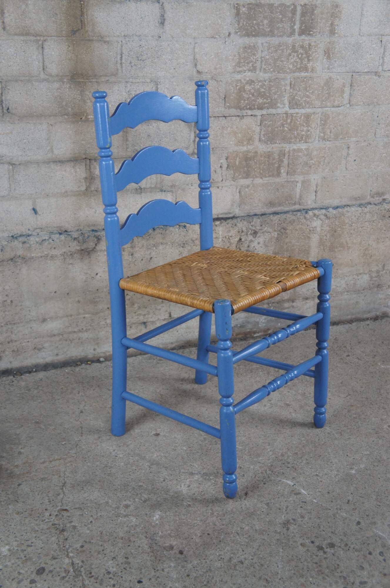 20th Century primitive table and shaker chair. Made from hardwood with a blue painted finish. The table features turned legs and arrow feet. The chair has a ladder back and rush seat.
