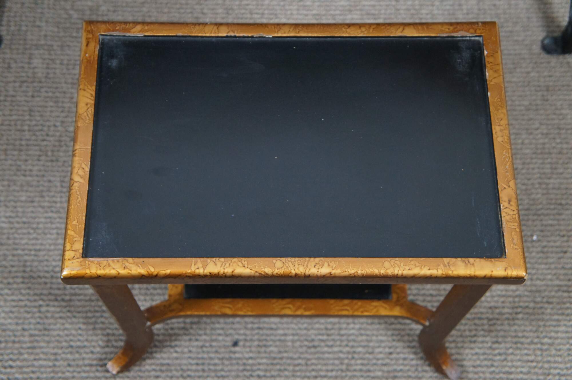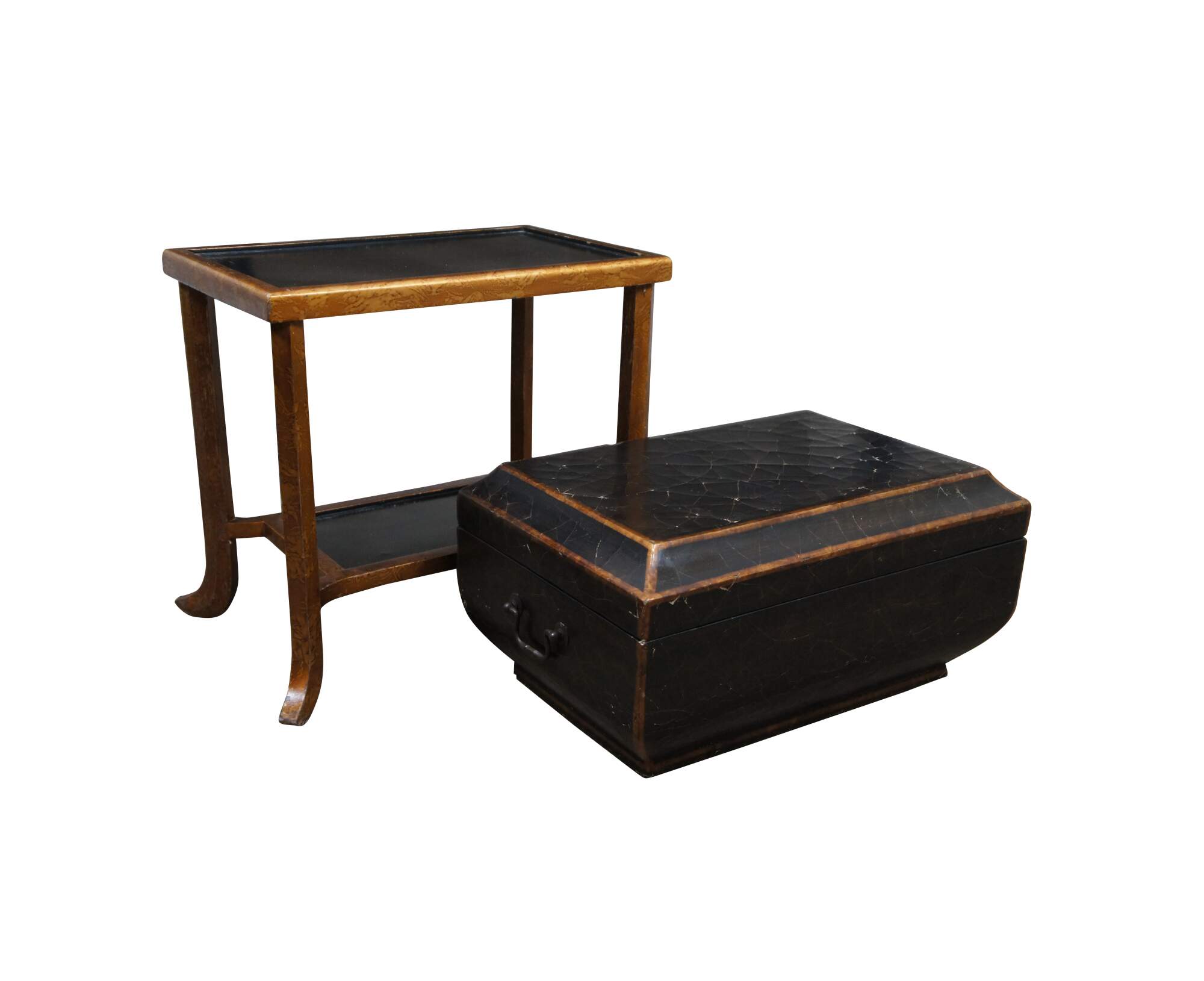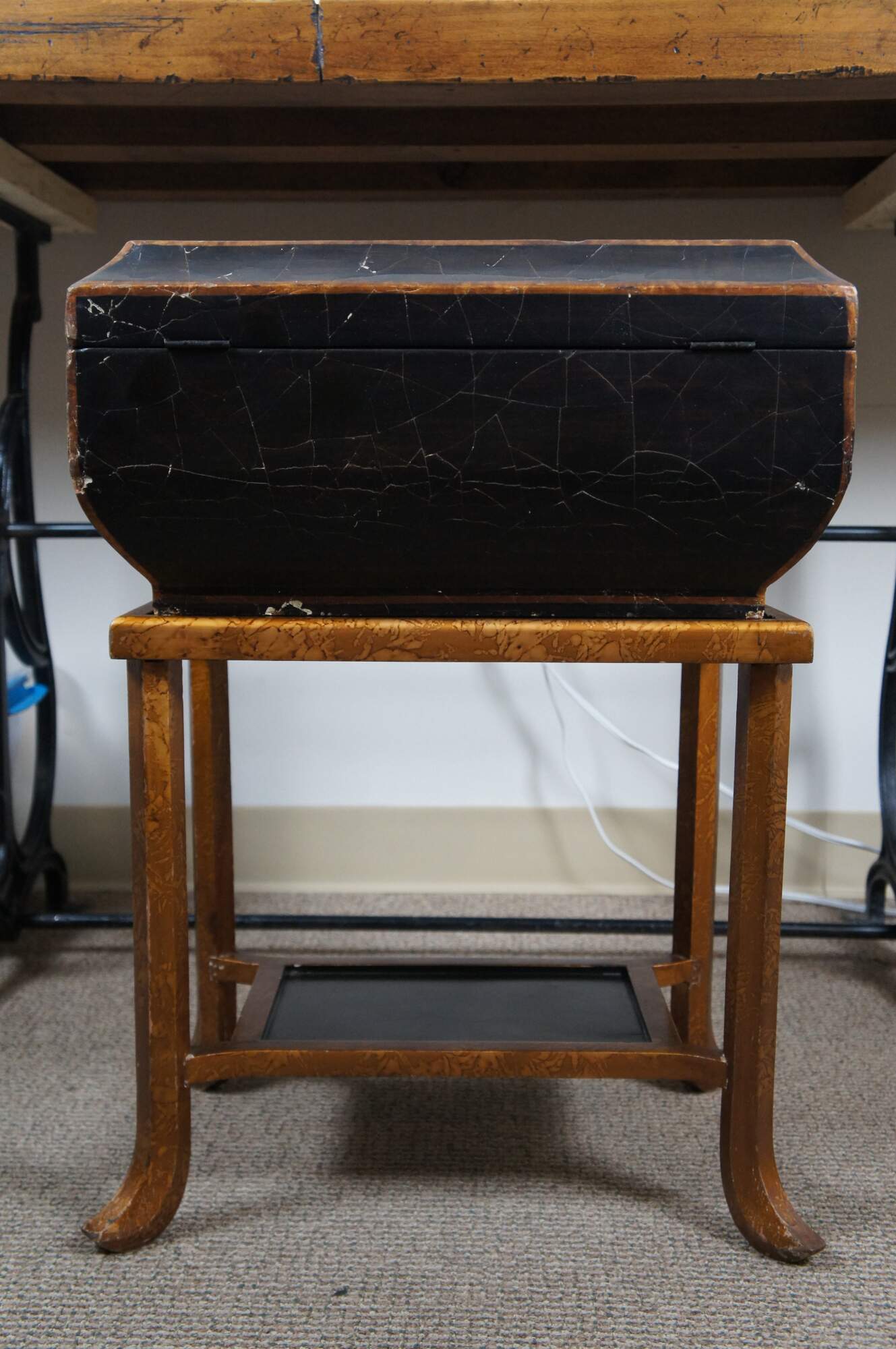Late 20th century crackled black lacquer Chinoiserie style trunk / chest on a gold painted two tier stand / end table.