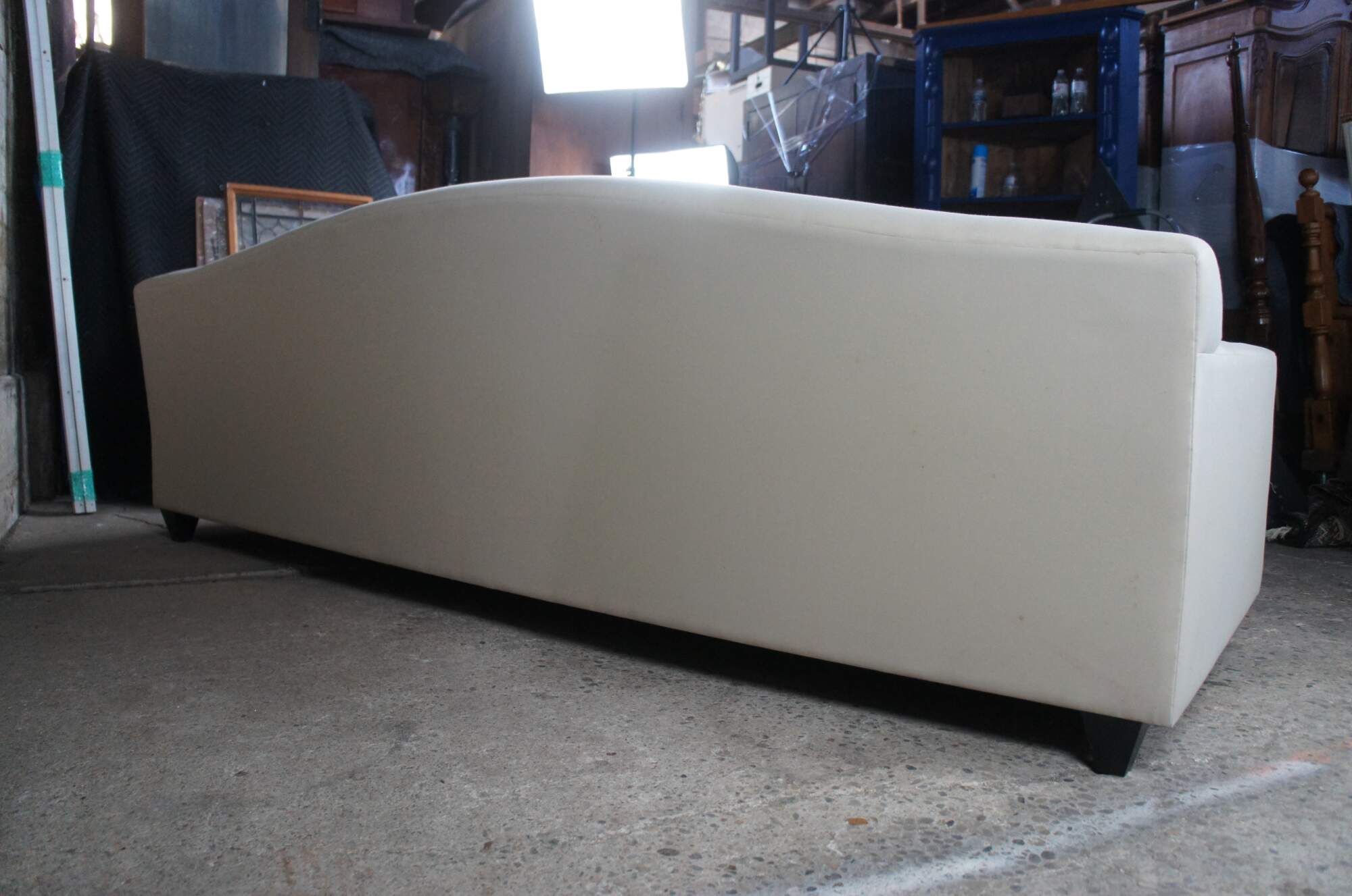 A lovely beige camelback sofa from the last quarter of the 20th century. Features a rectangular frame raised over square tapered oak feet finished in black.