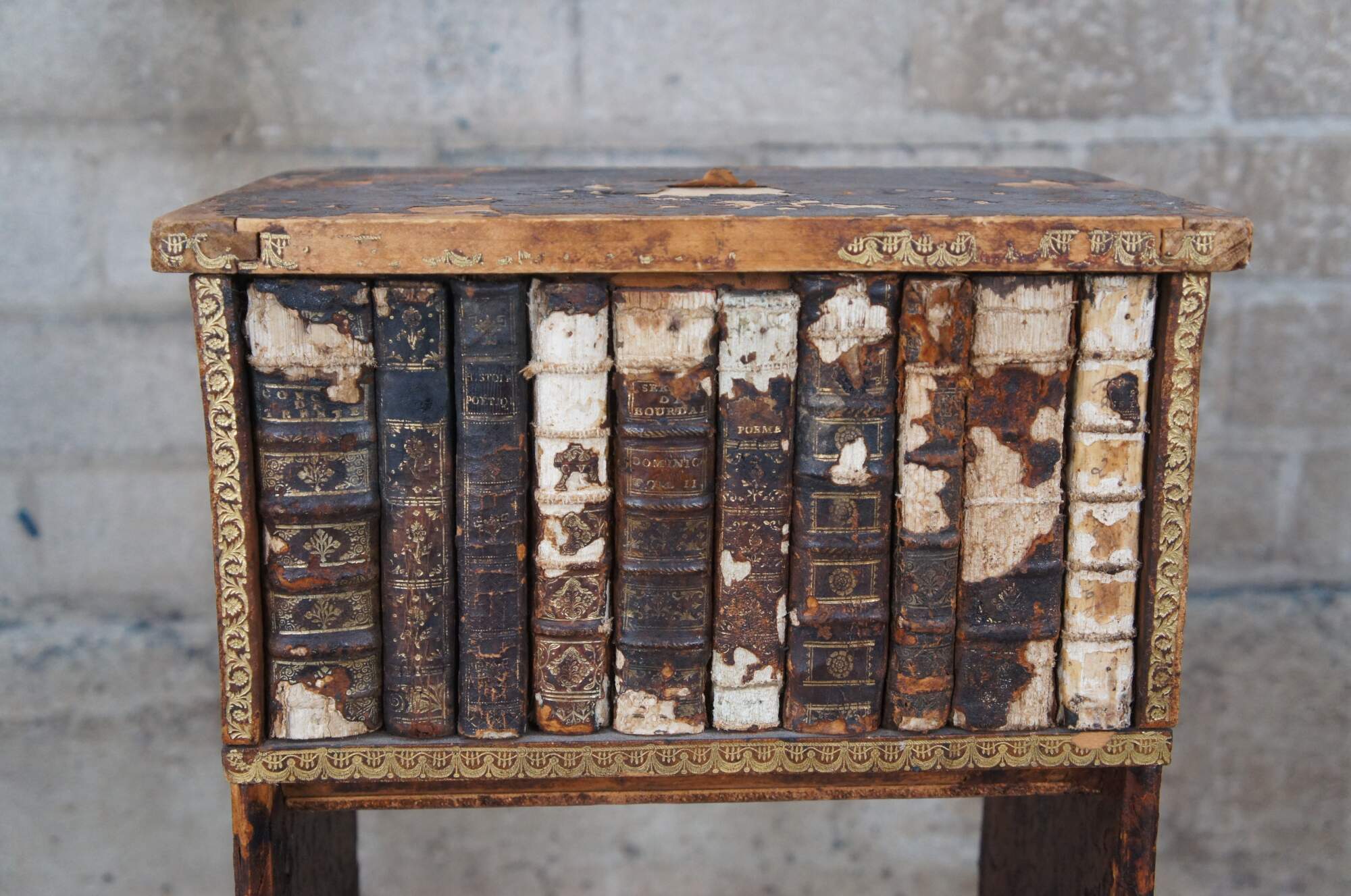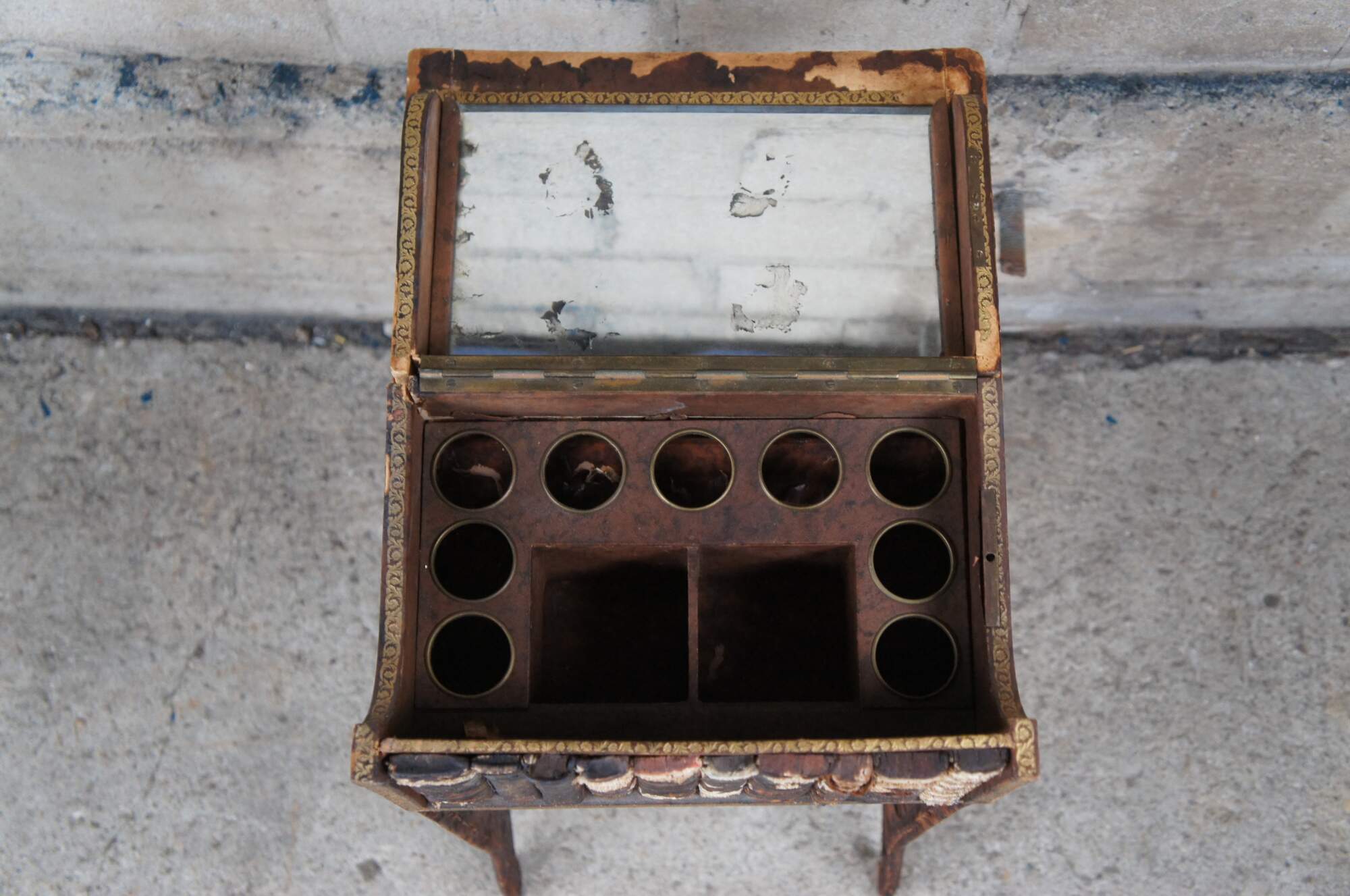 Antique tooled leather tantalus case. Features a faux leather bookcase table form that opens to a mirror and space for two bottles and 9 glasses. Includes a lock along the side (untested)