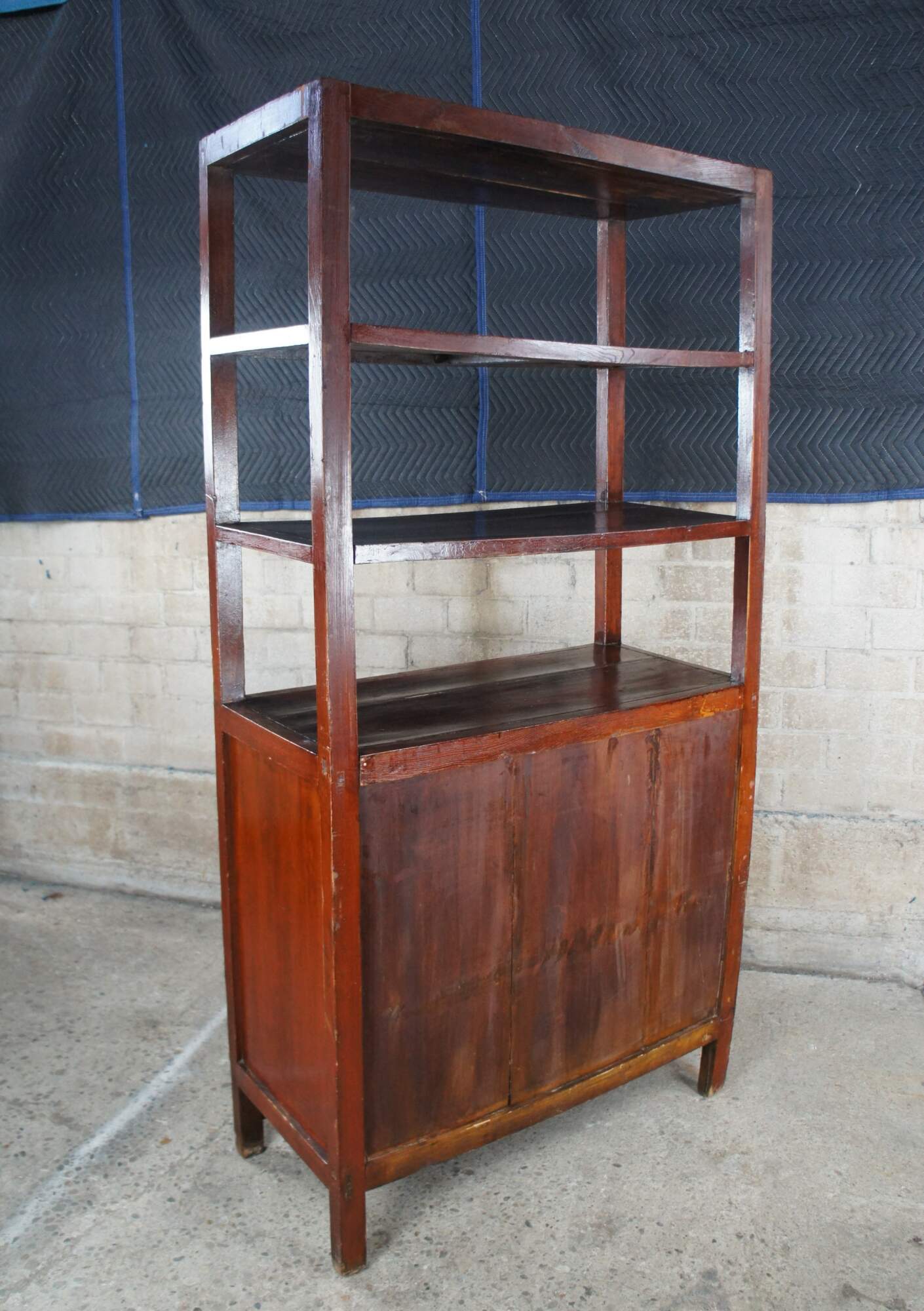 Early 20th century Chinese elm etagere cabinet. Features a modernist open form with three shelves over two dovetailed drawers and lower cupboard for storage. Constructed via mortise and tenon joinery. Great for use as a dry bar, room divider, display cabinet or bookcase.