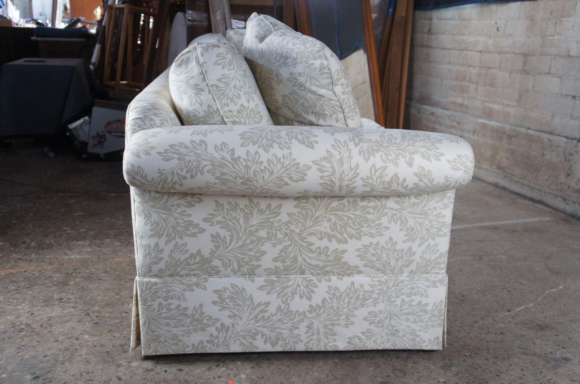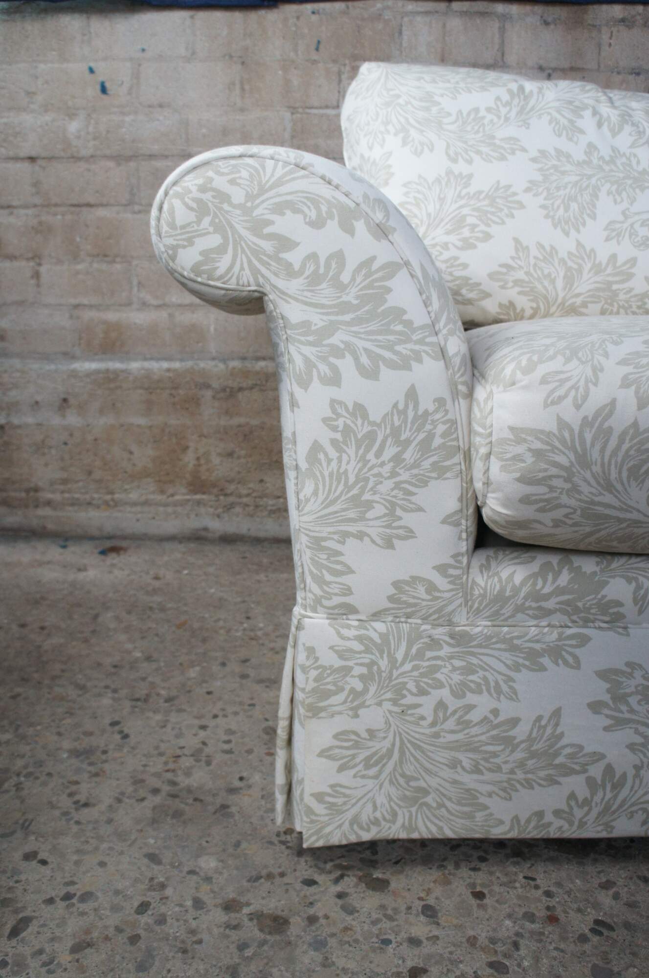Vintage Baker Crown & Tulip Collection Sofa, circa last quarter 20th century. Features a rectangular form with rolled arms, down filled cushions and throw pillows. #6819-88C. Upholstered in an off-white fabric with olive green / acanthus design. Bares the original tags which are attached to the arm.