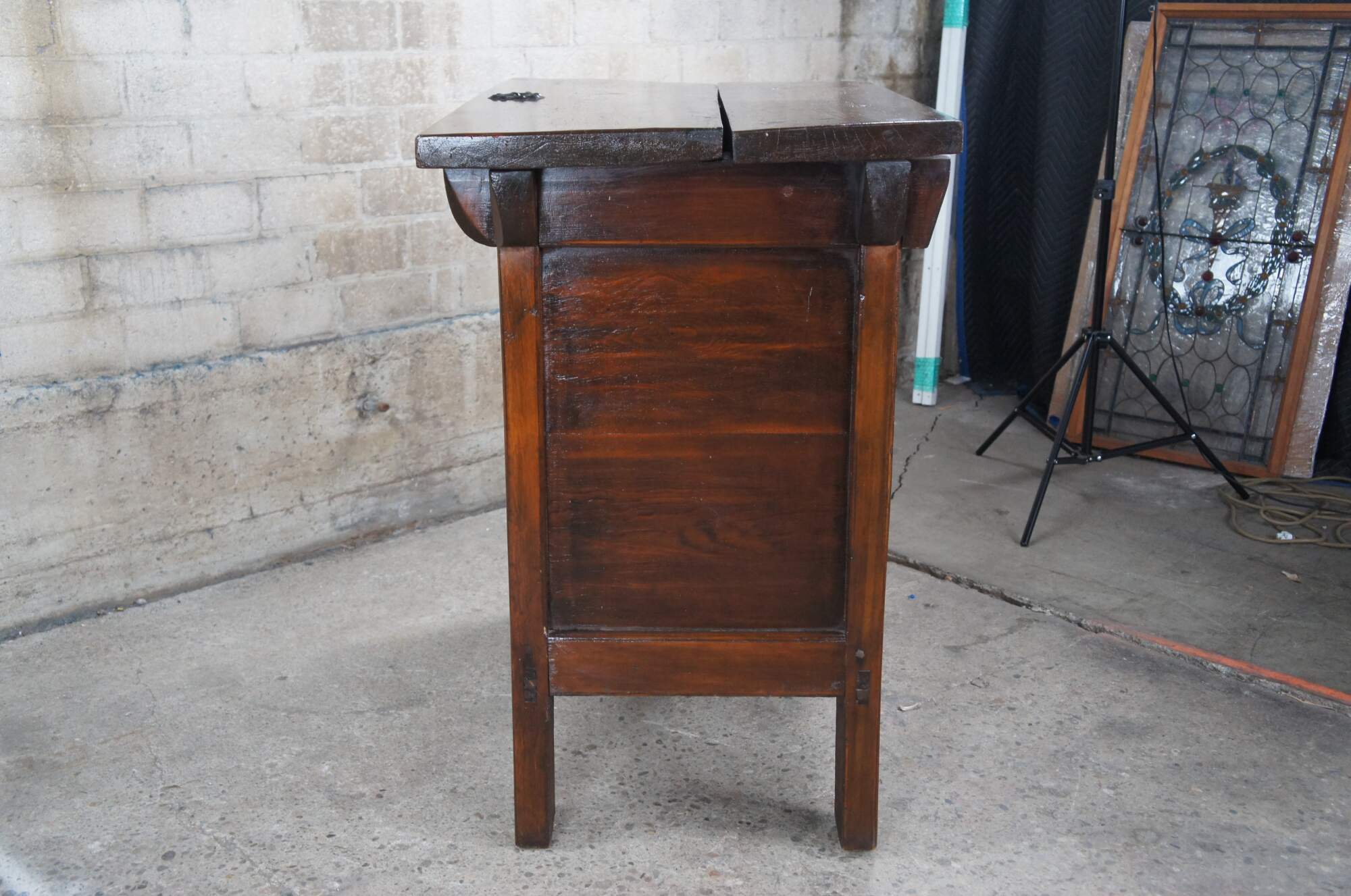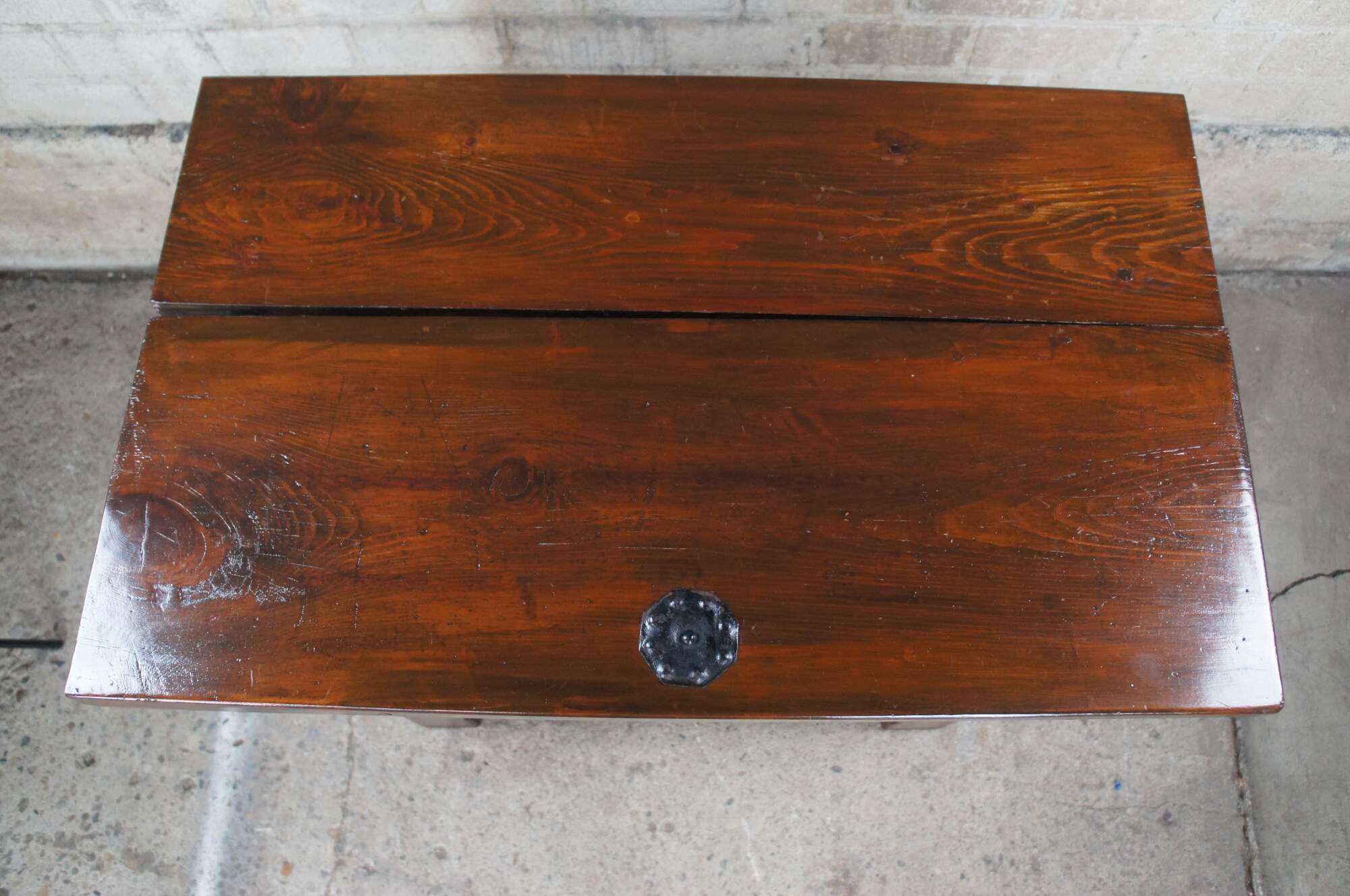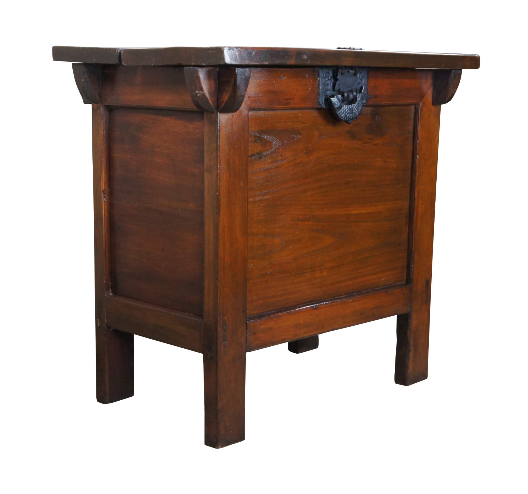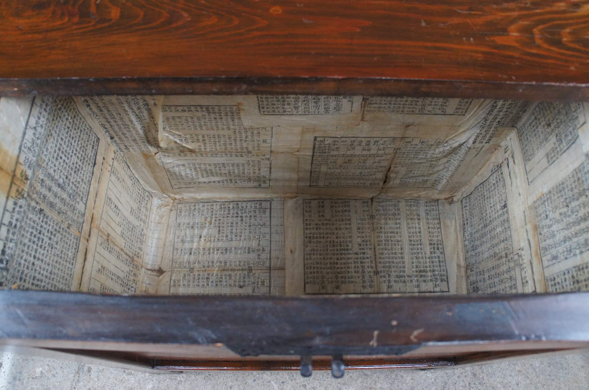 20th century Korean elm rice bin or cabinet. A rectangular form made from elm with a removable top for storage. The interior is paperlined with calligraphy. The chest is made using mortise and tenon joinery. Features a working iron fish lock.
