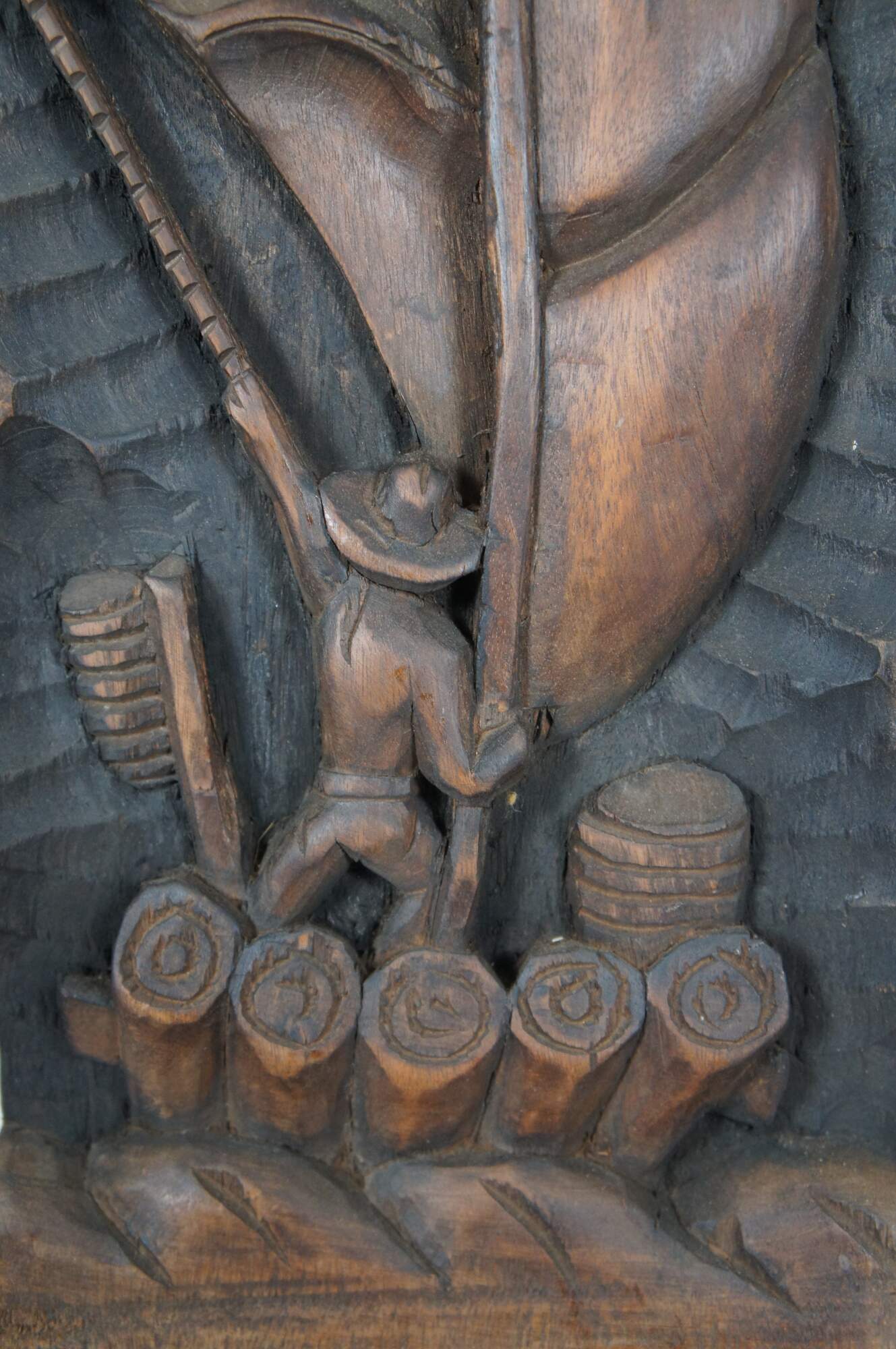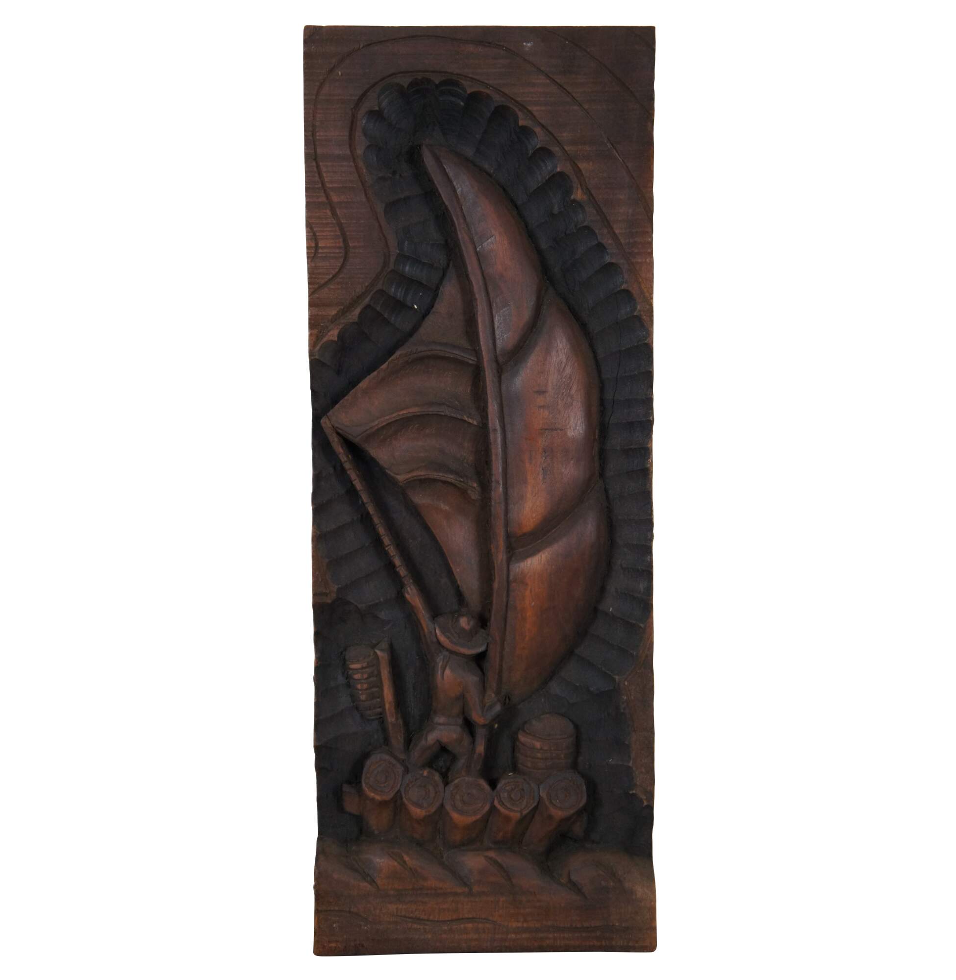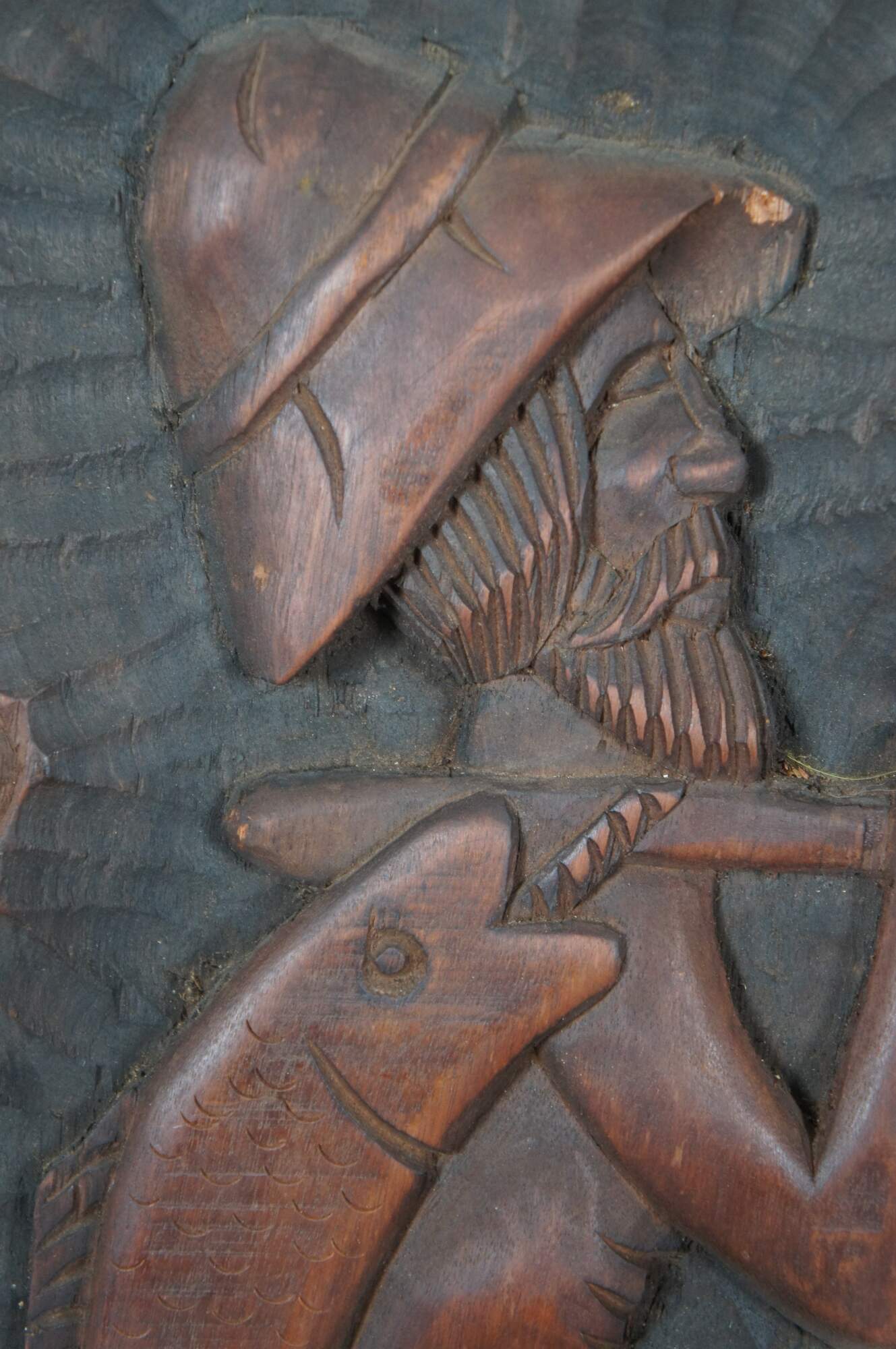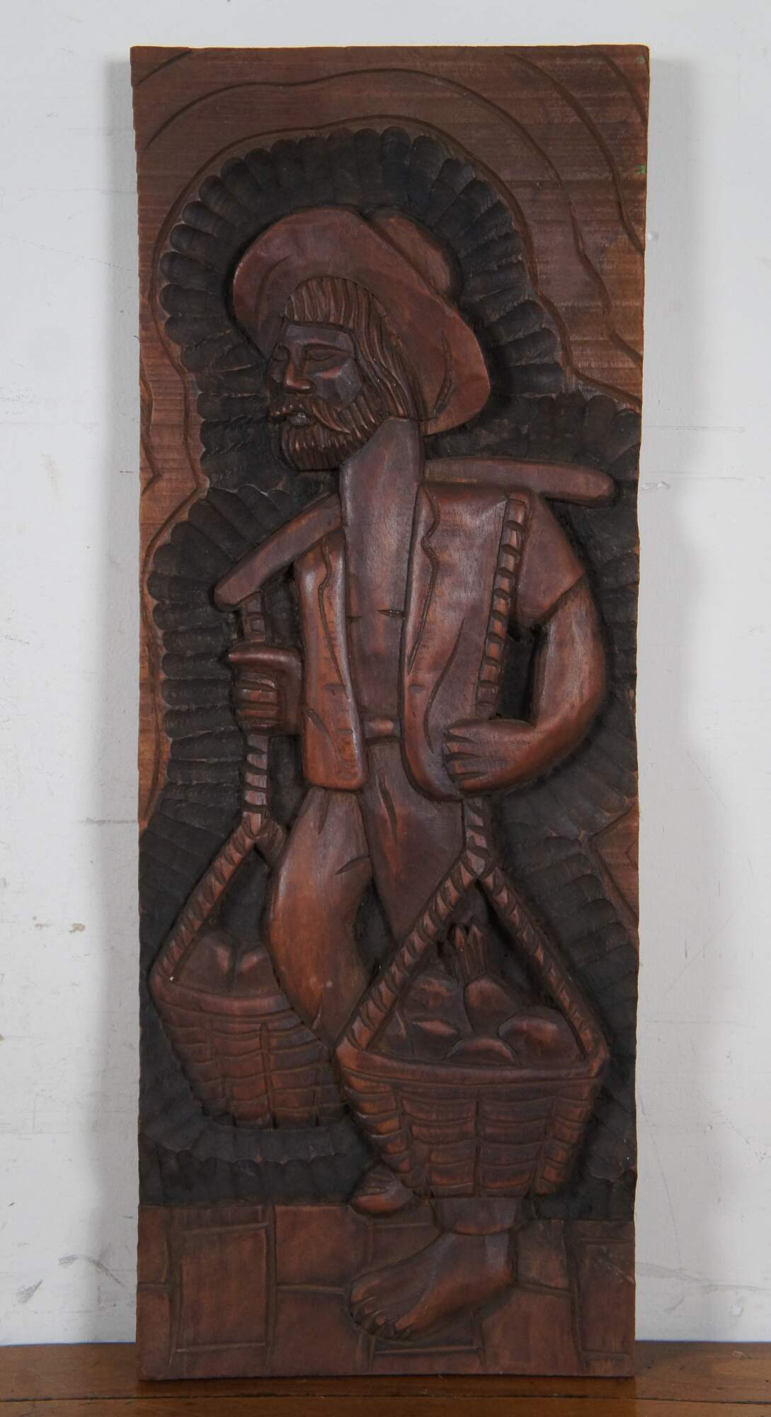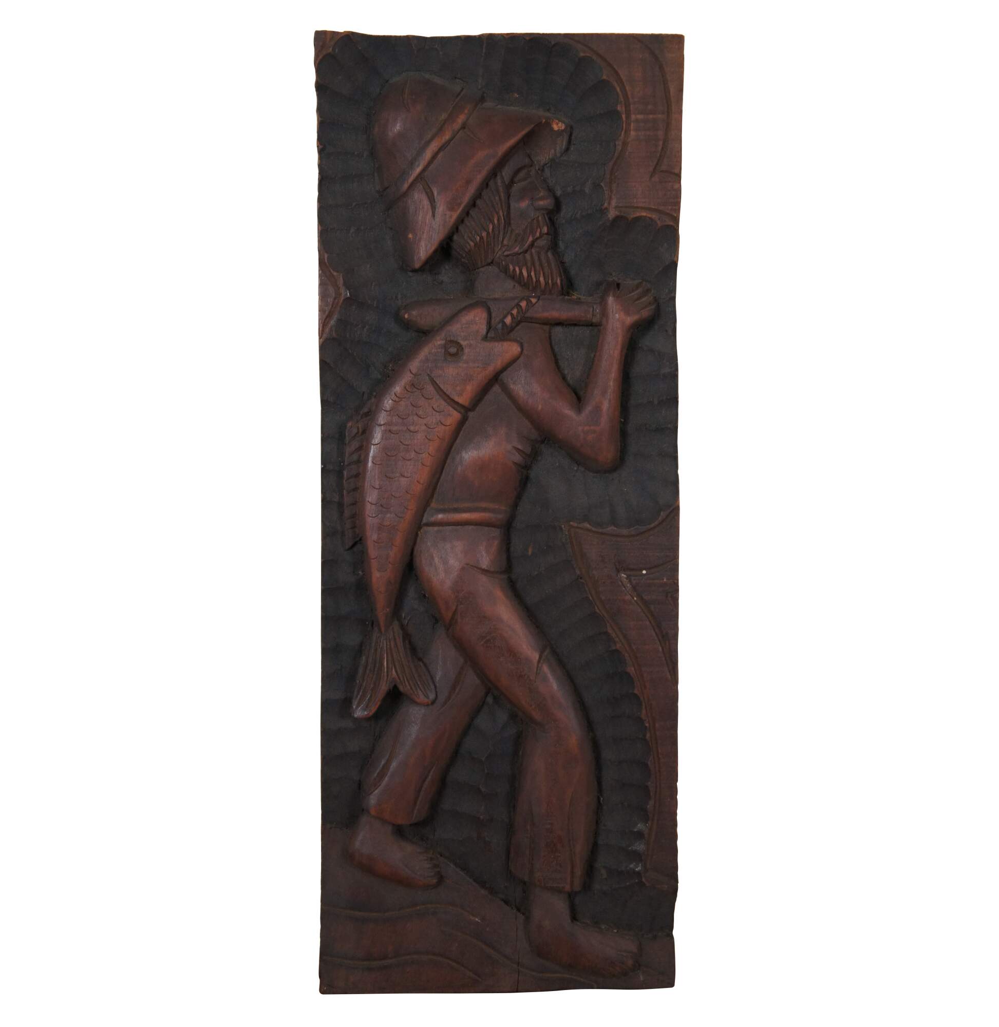 Set of three vintage folk art style carved wooden relief wall hangings, showing a fisher man with a large fish, a sailboat or raft, and a farmer with baskets of vegetables. Signed on verso – two signed Xikdlu and one signed Dalva.