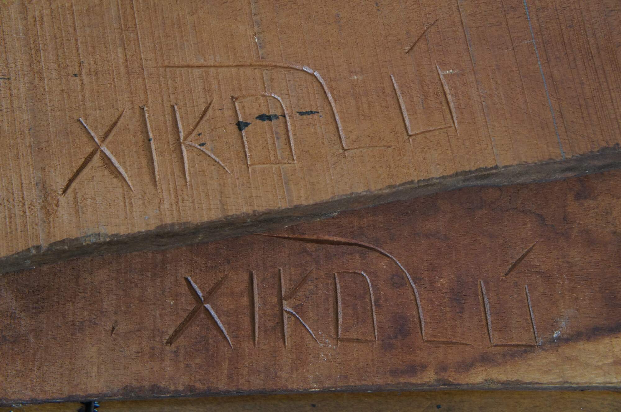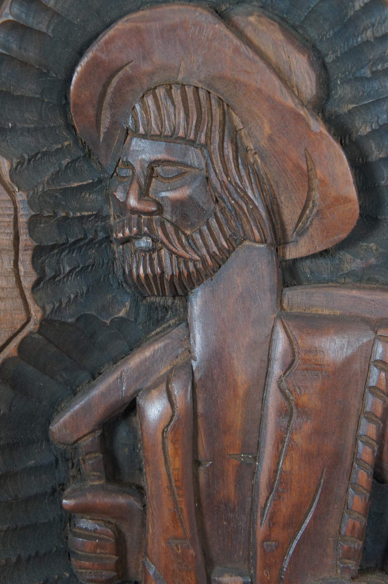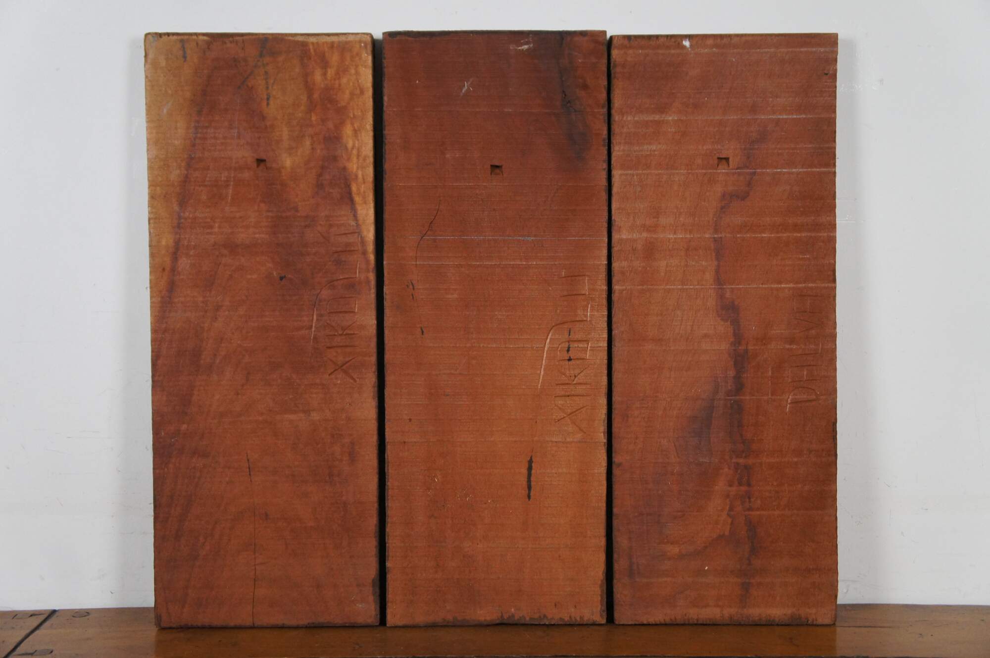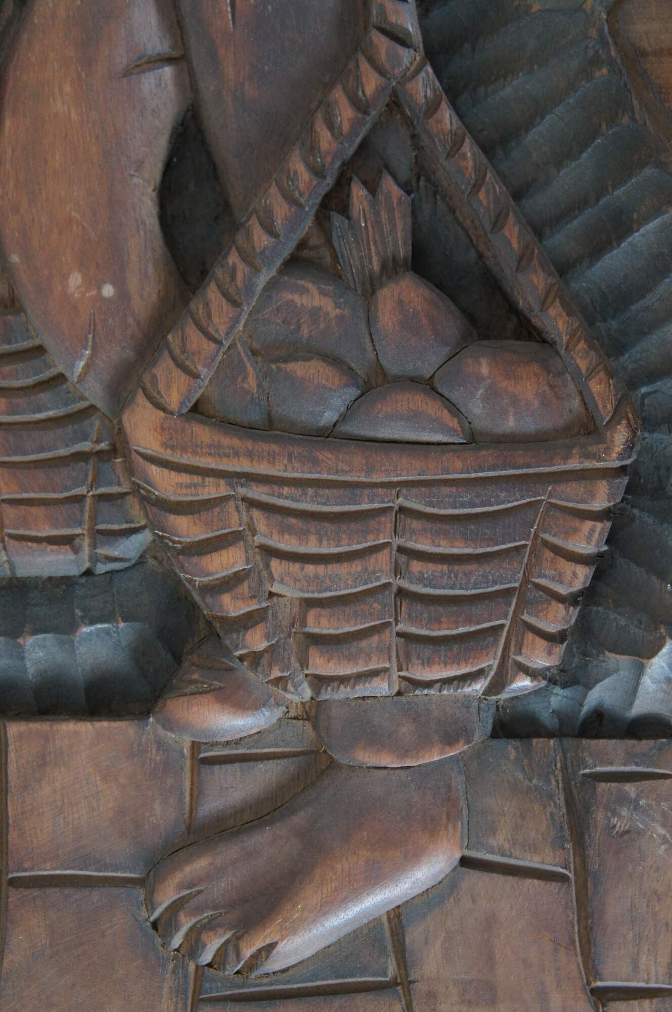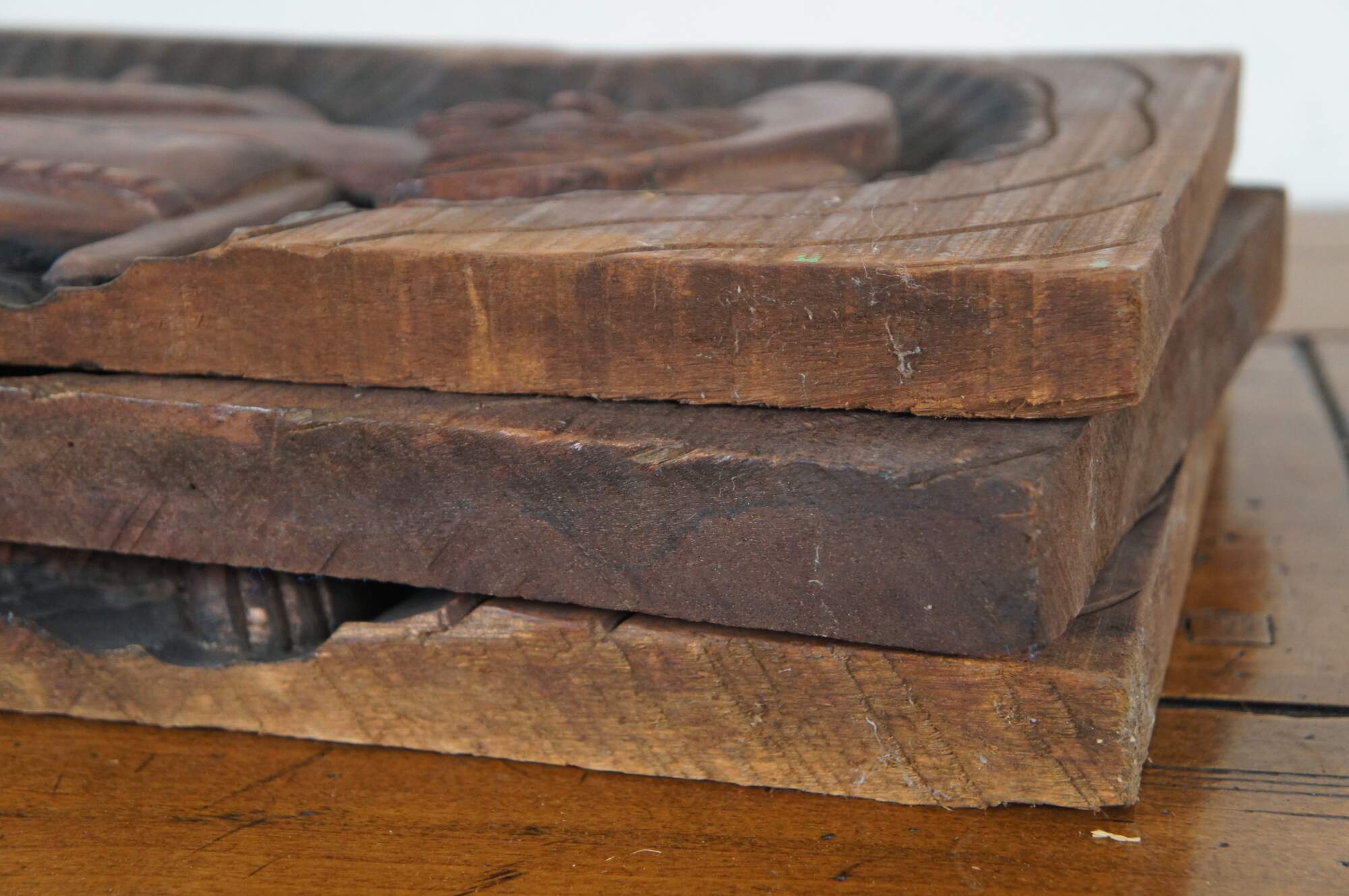 Set of three vintage folk art style carved wooden relief wall hangings, showing a fisher man with a large fish, a sailboat or raft, and a farmer with baskets of vegetables. Signed on verso – two signed Xikdlu and one signed Dalva.