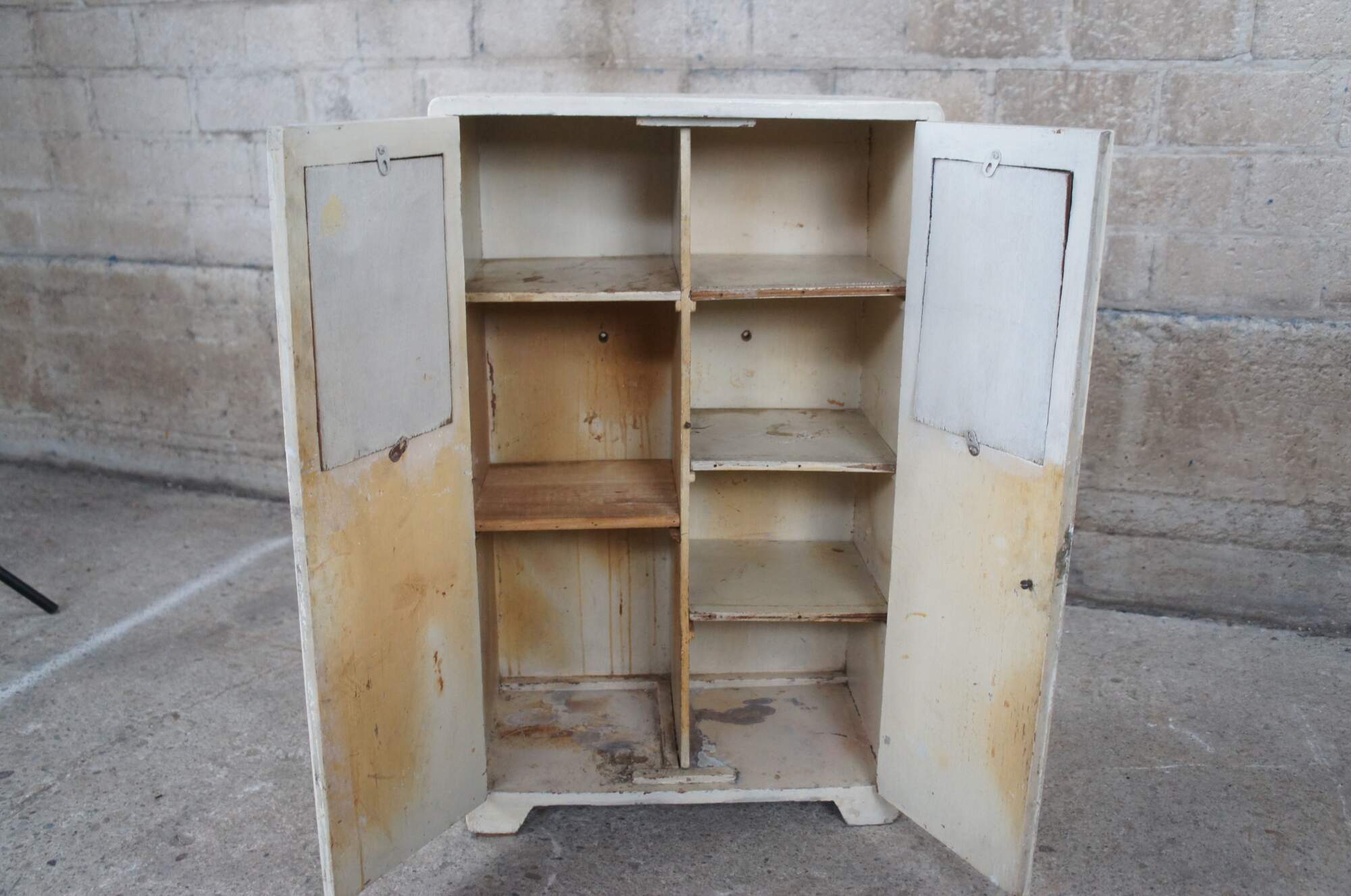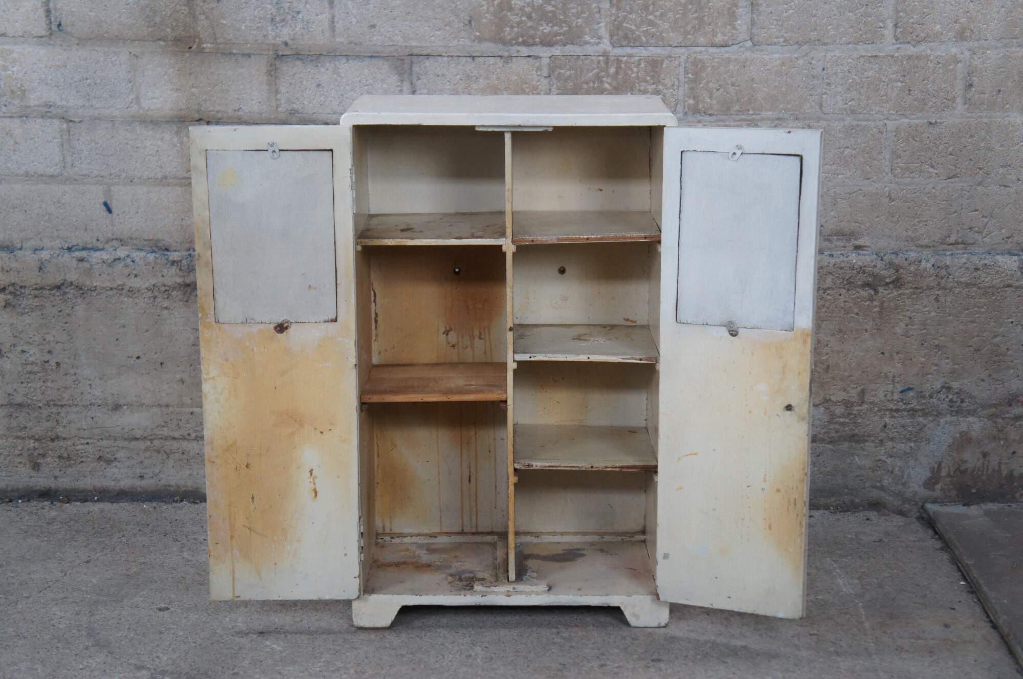 Small Vintage painted cupboard, circa mid 20th century. Last used as an apothecary or medinet cabinet. Features two holes in the back for hanging.