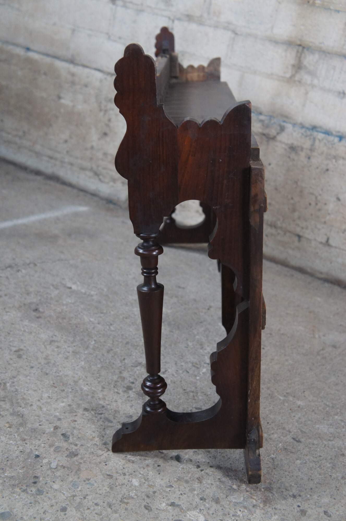 An antique Victorian backsplash. Made from walnut with pierced and carved backsplash with a turned column support. This piece most likely came from an old pump organ, but works well with the right sized buffet, sideboard or server.