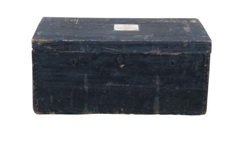 Intriguing early 20th century flat top steamer trunk strong box. Made from pine with three locks along the front, metal lines corners and handles along the side. The lock plate escutcheons in the shape of a shield. The trunk is finished in black. The front of the trunk is marked F Roosevelt Pair France. This most likely being the shipping address as the interior is marked Madem Moiselle Isabelle Klauser, 71 Avenue du Pt Roosevelt