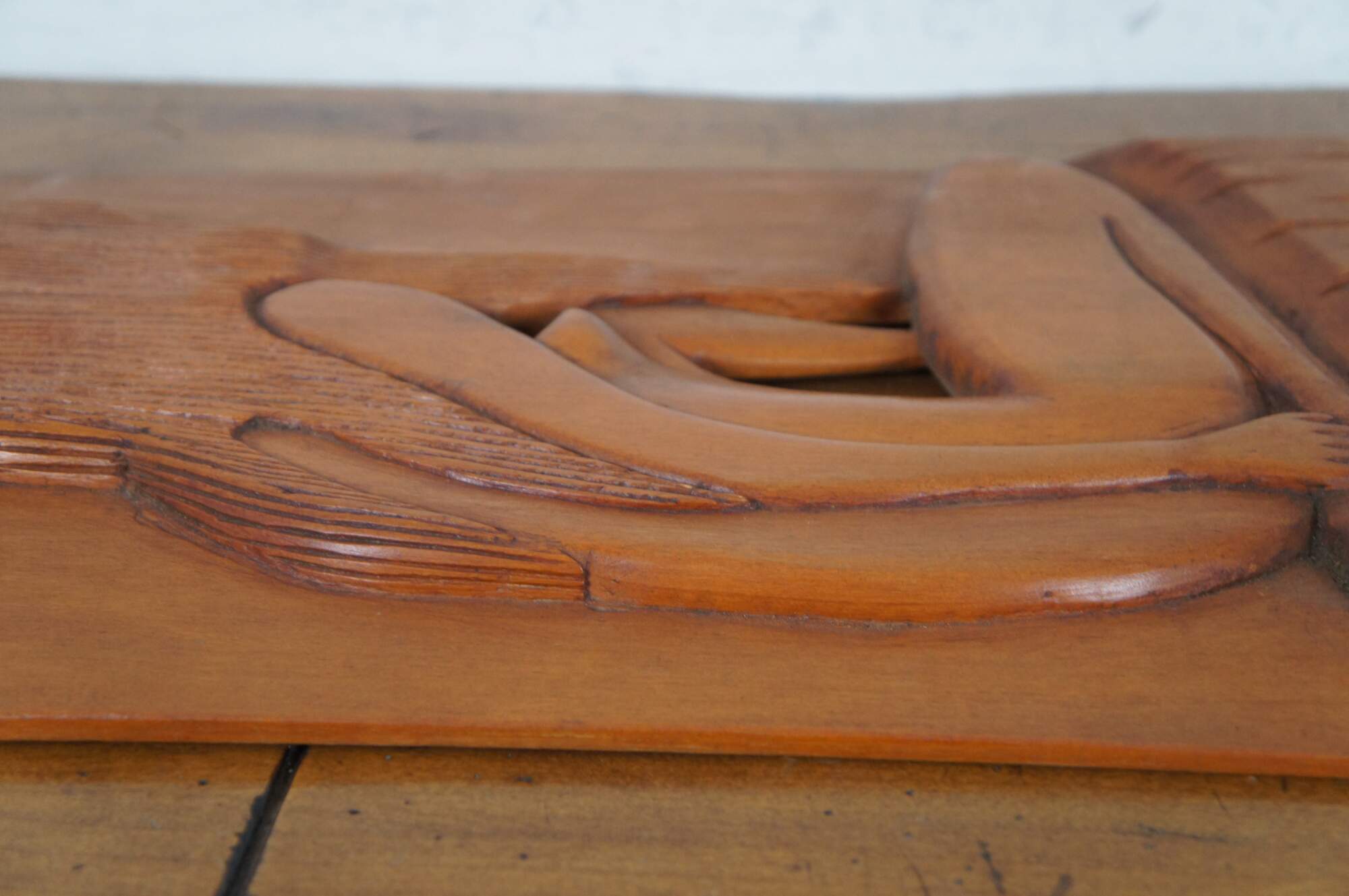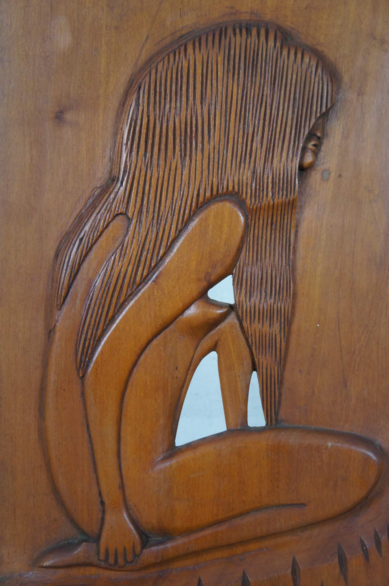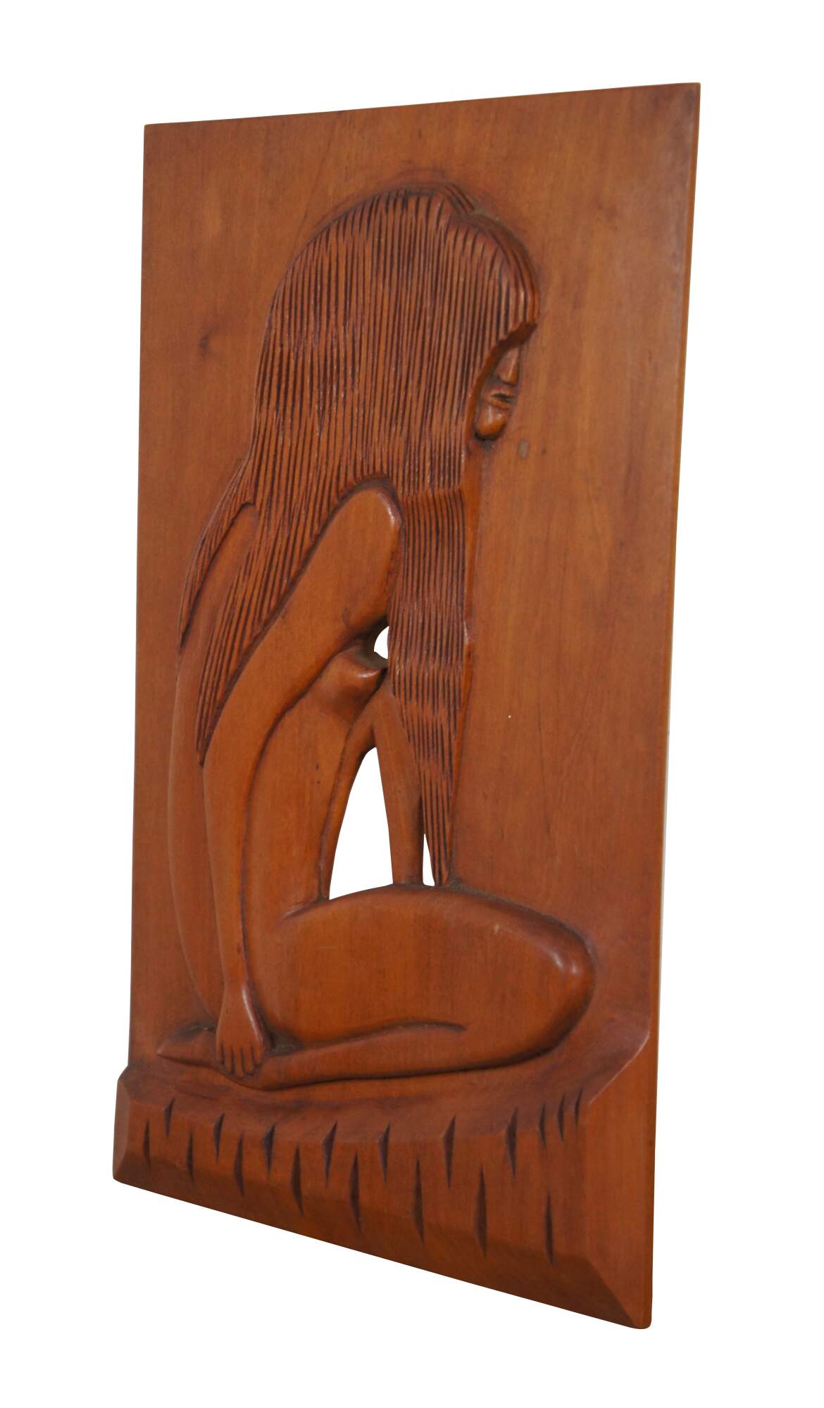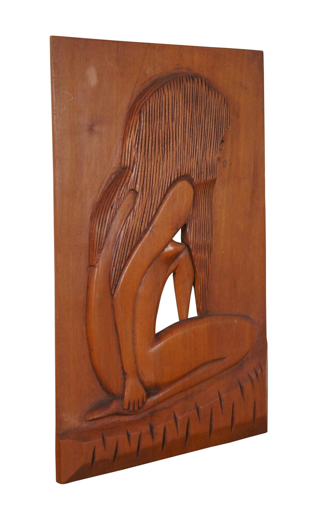 Vintage folk art style hand carved wooden relief wall hanging, showing a slightly abstracted female figure kneeling on the ground, partially hidden by her long, thick hair. Signed Rosa on verso.