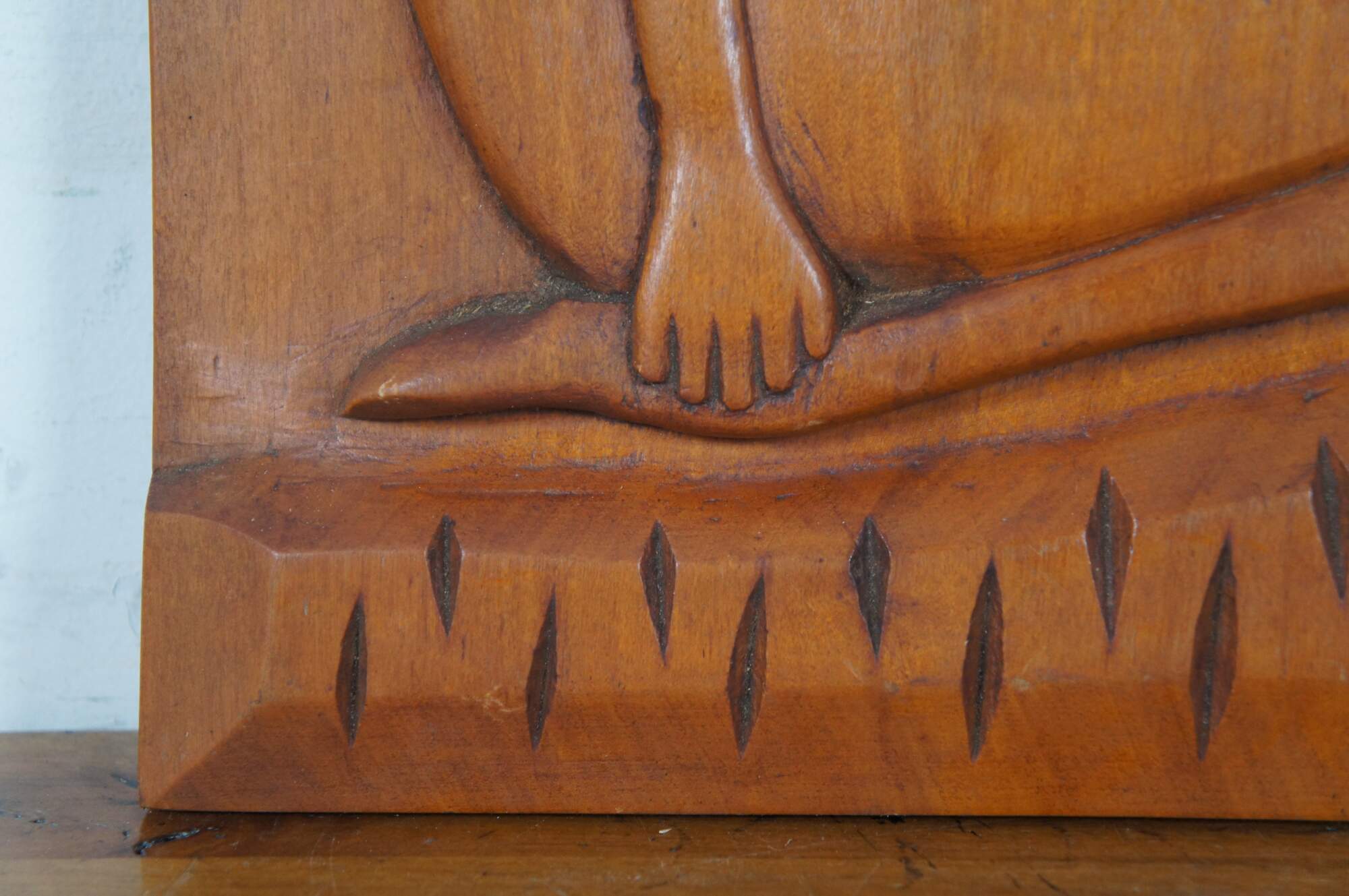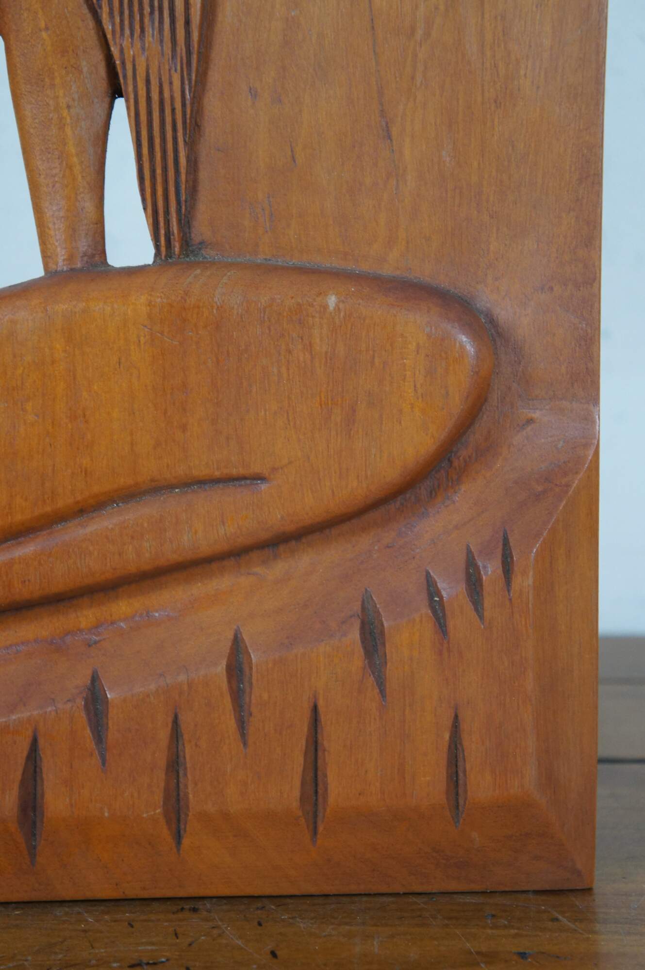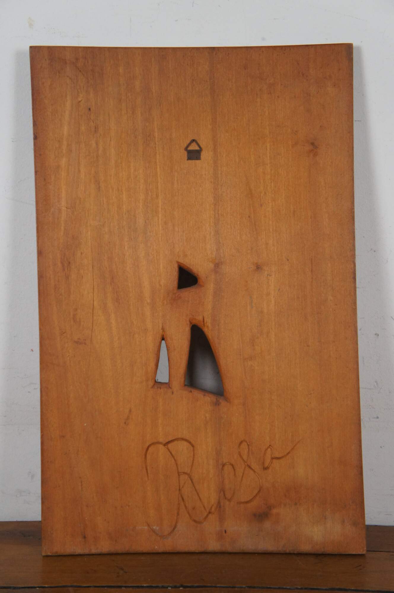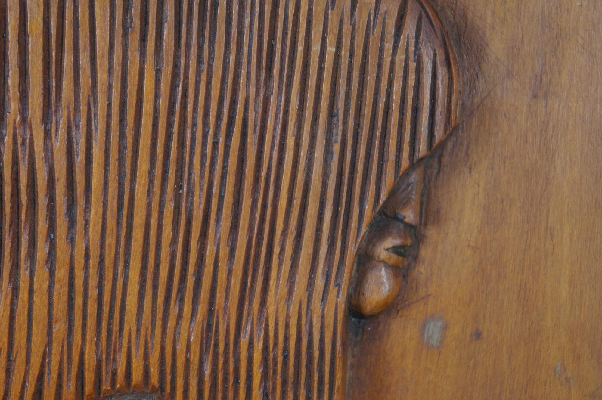 Vintage folk art style hand carved wooden relief wall hanging, showing a slightly abstracted female figure kneeling on the ground, partially hidden by her long, thick hair. Signed Rosa on verso.