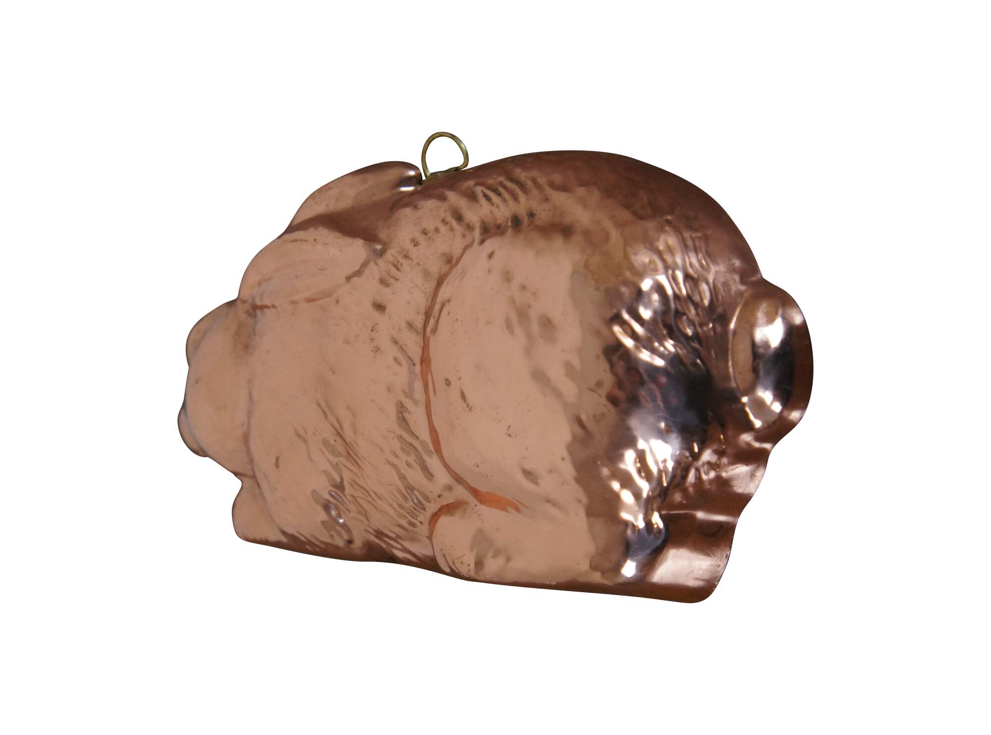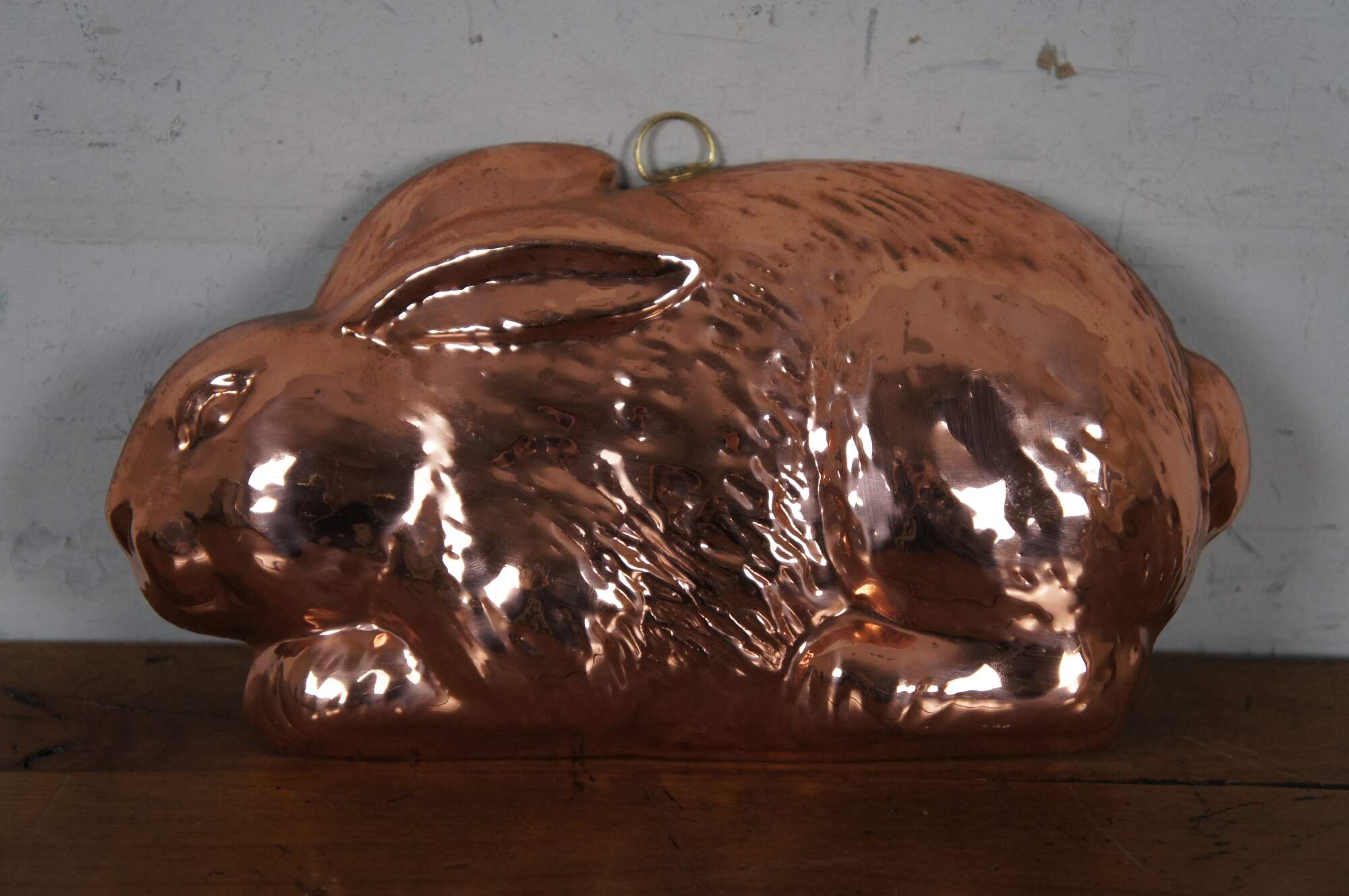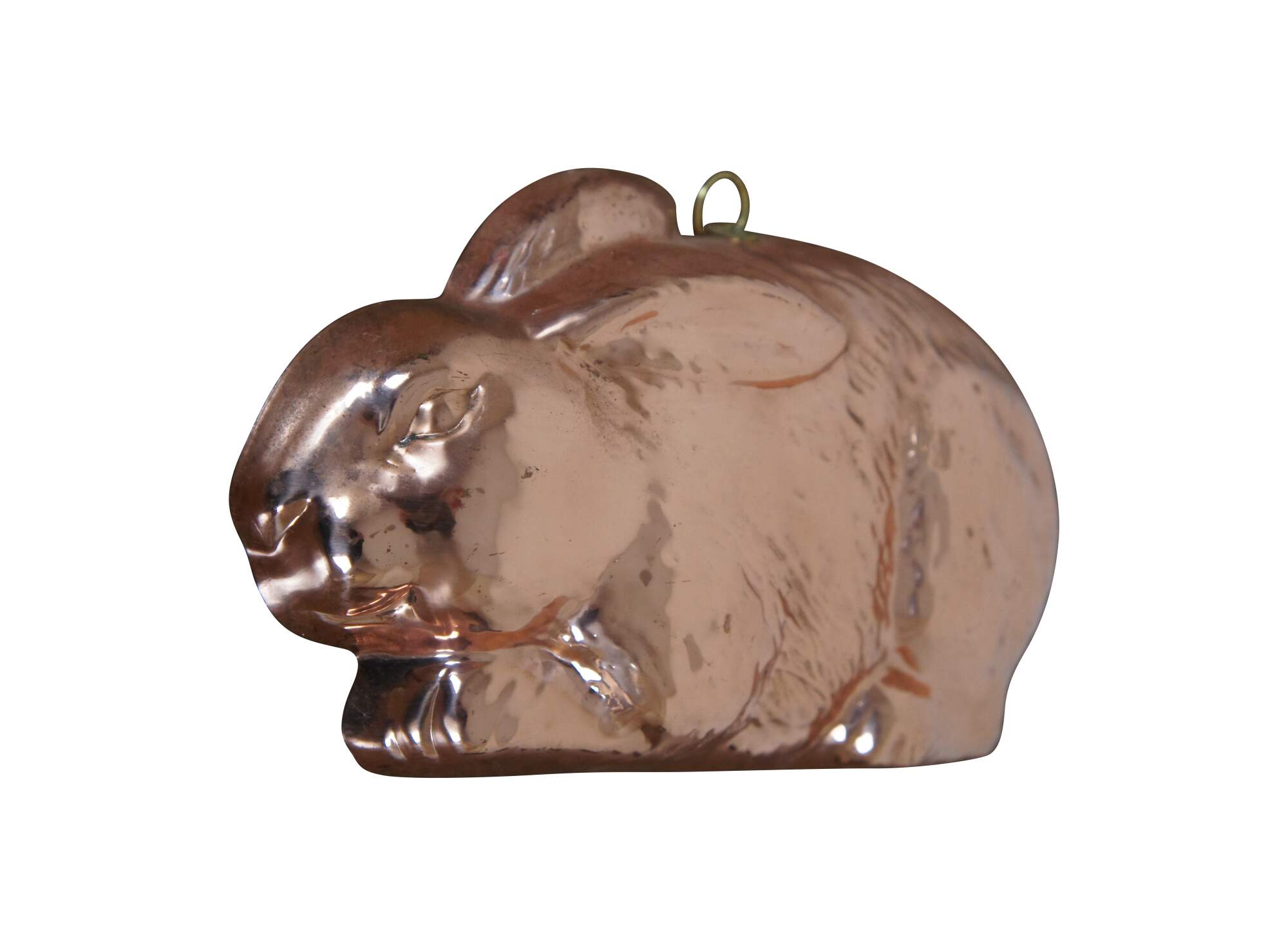 Vintage tin / aluminum lined copper cake pan / dessert mold in the shape of a rabbit / Easter Bunny, with a brass ring for hanging. Made in Korea.