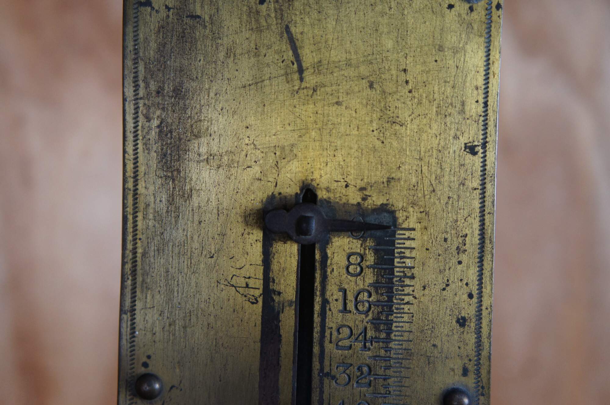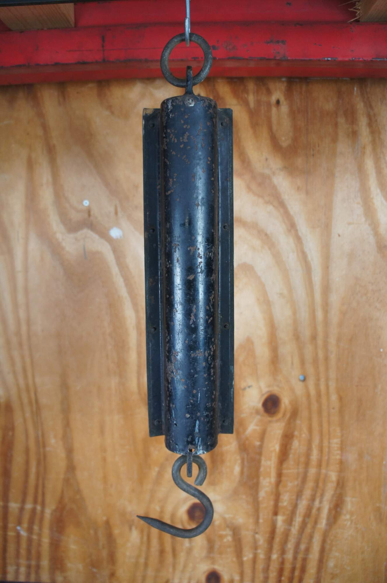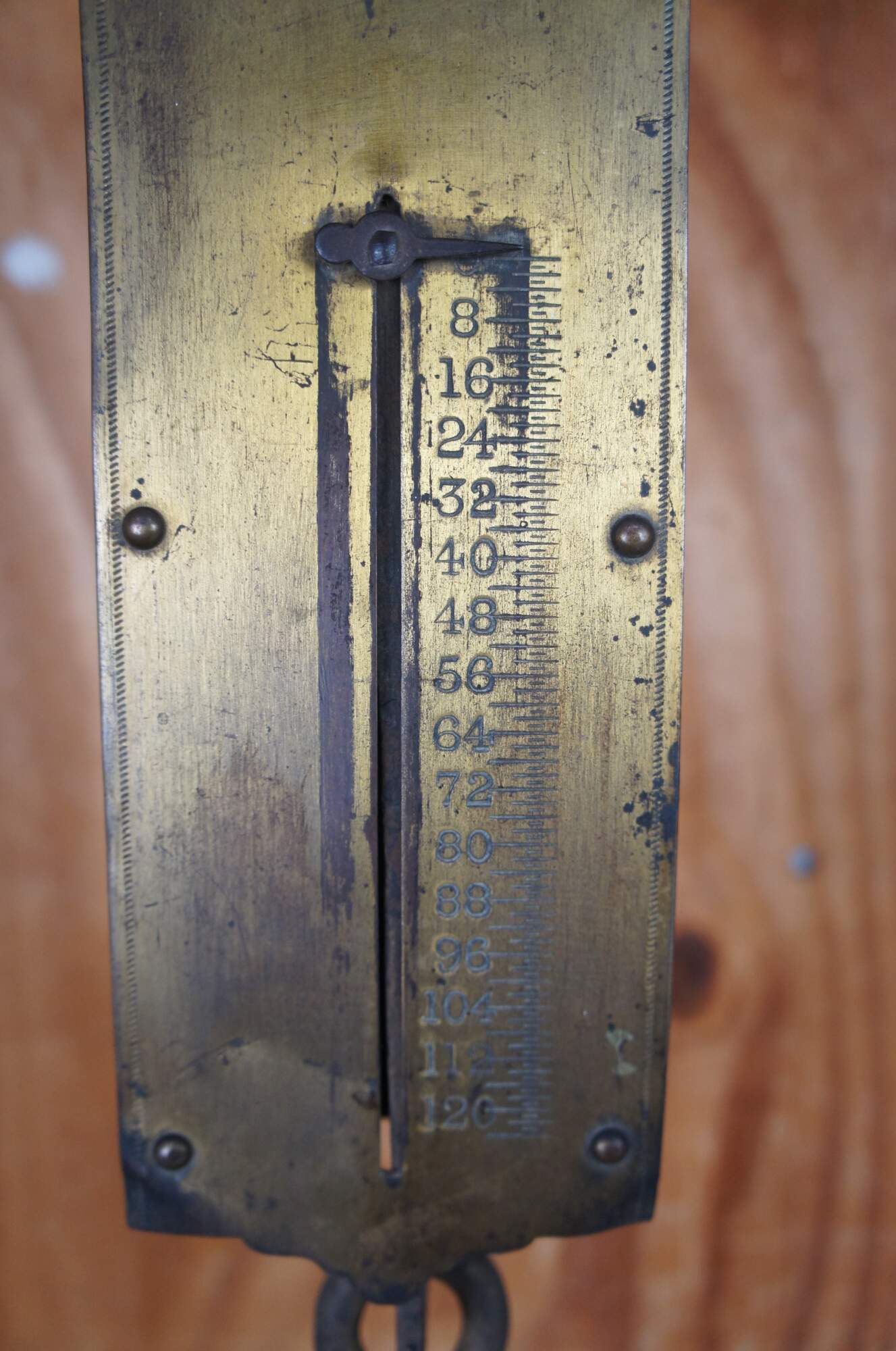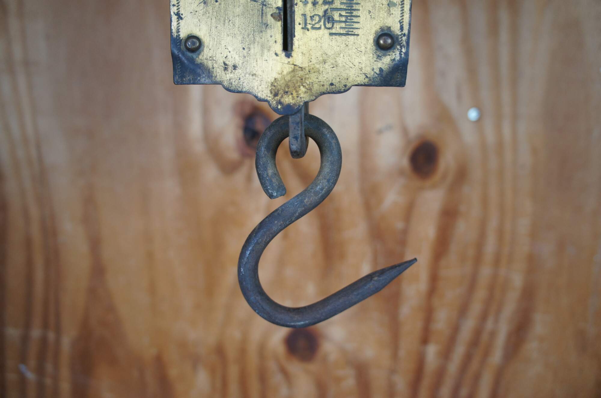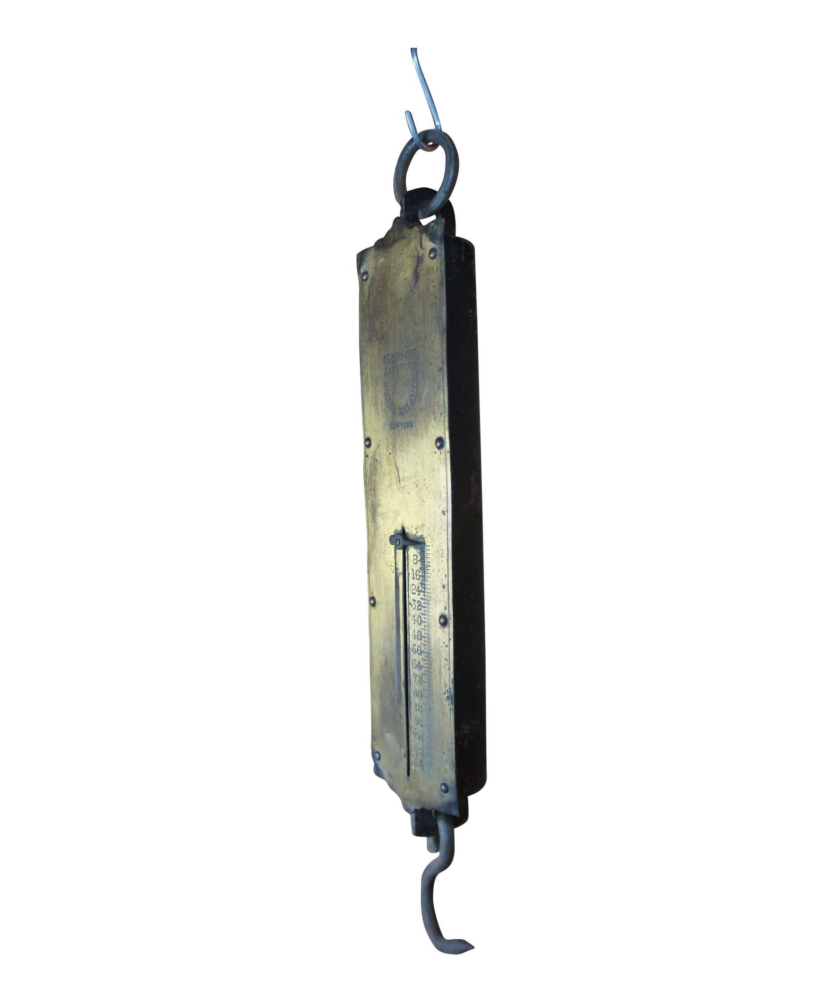 John Chatillon & Sons late 19th century 120 pound spring balance. Features a brass engraved plate along the front with makers mark and metal backing. The scale hangs via a thick iron ring at the top and measures at the bottom with a hook for objects.