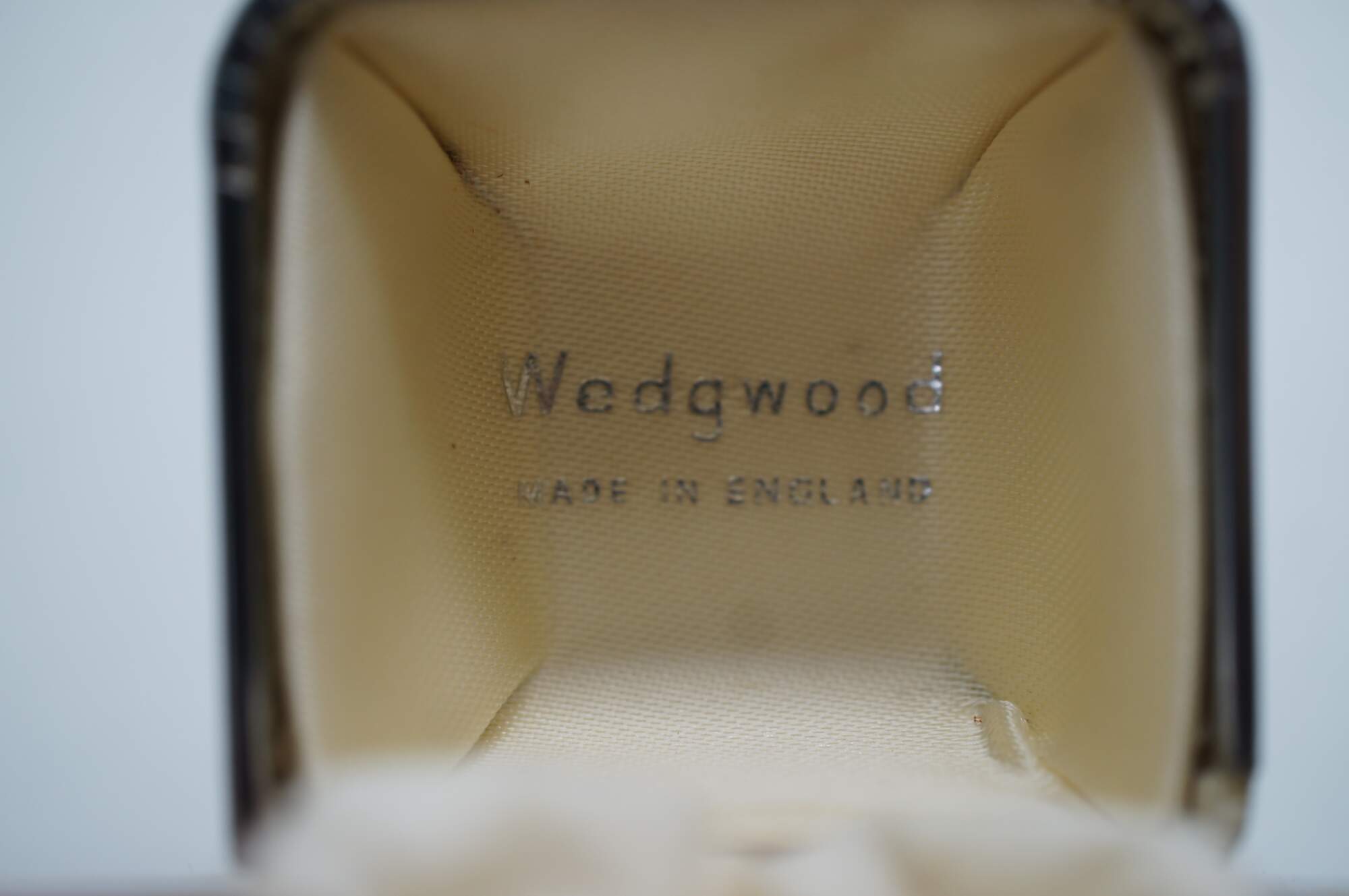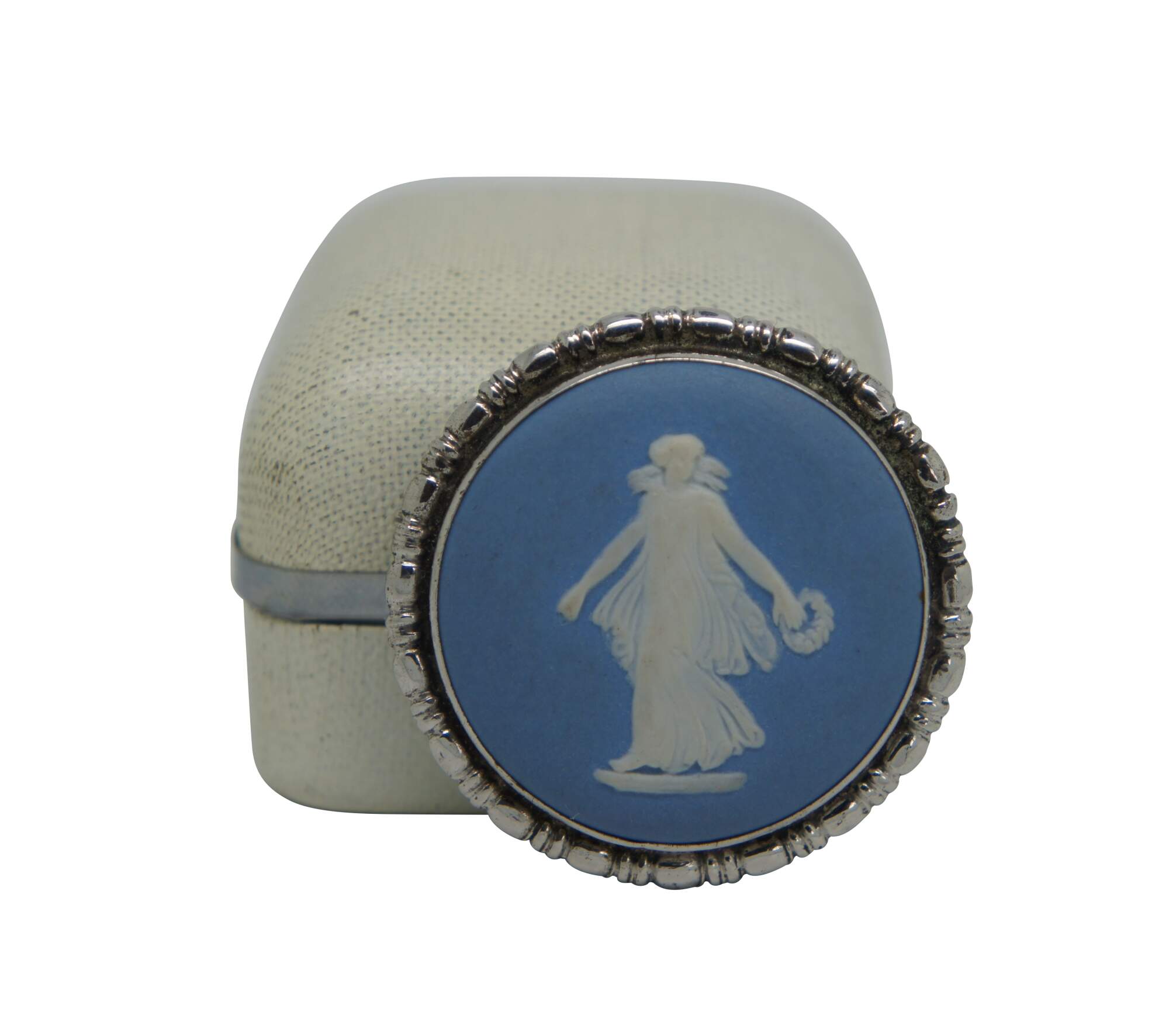 English 1955 EC Wedgwood cream on lavender / light blue jasperware pin / brooch in a sterling silver frame, showing a Neoclassical walking figure with a laurel wreath in one hand. Includes box. Made in England.