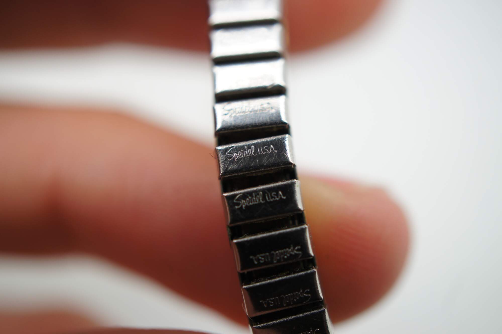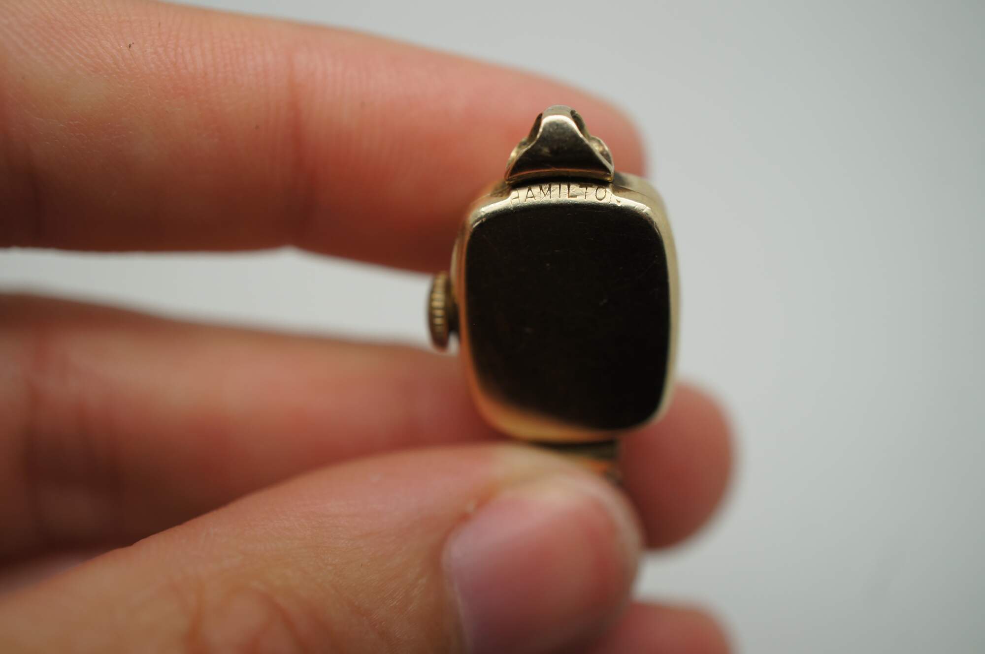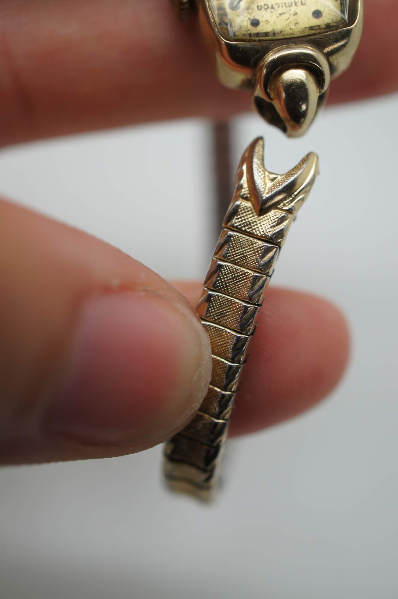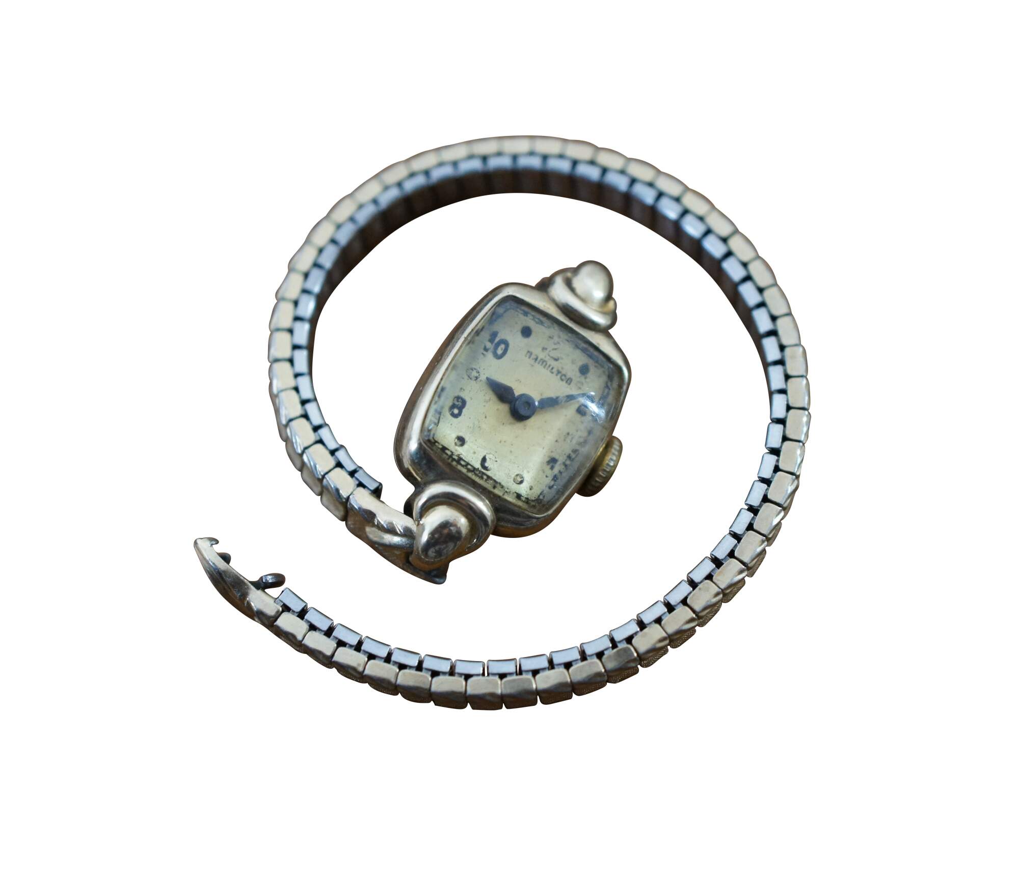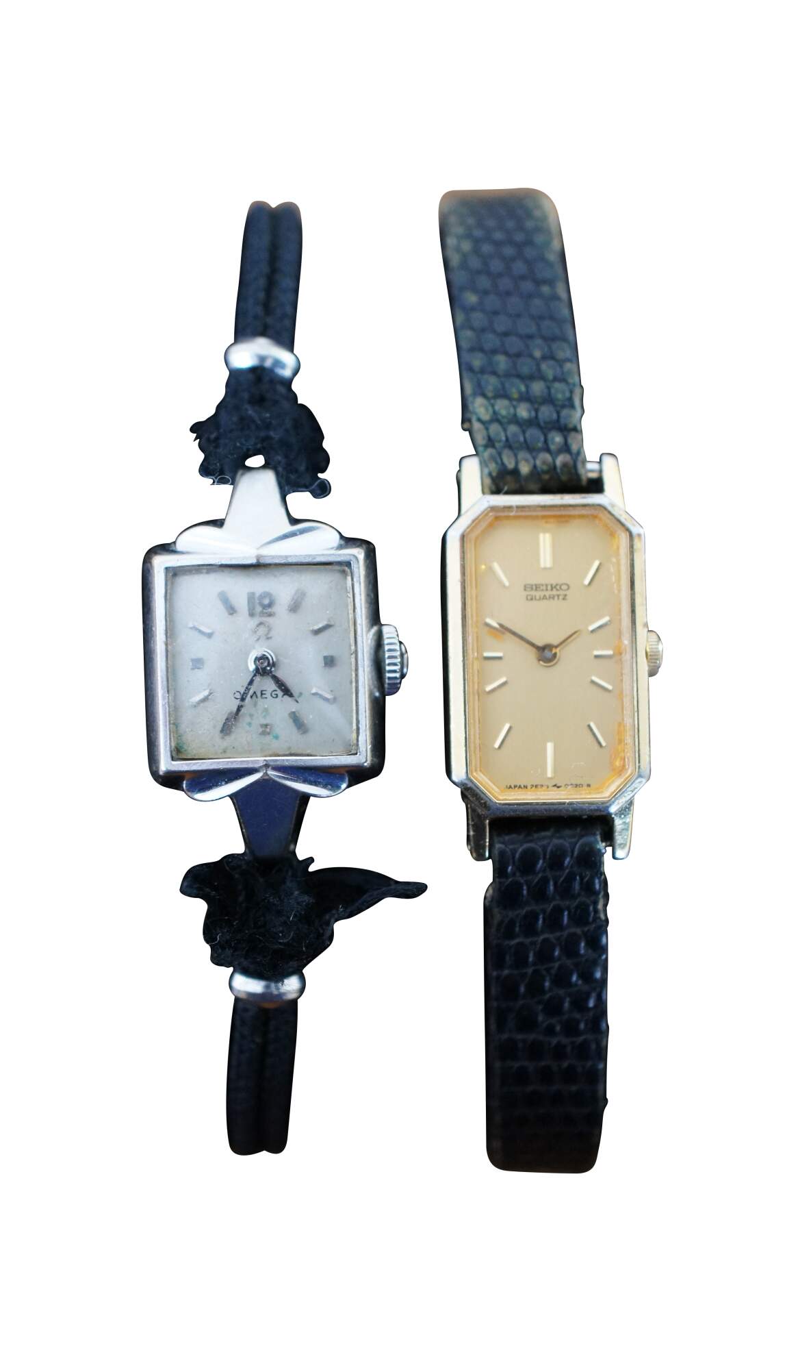Lot of three vintage women’s wrist watches. Silver tone Omega square face with 14K gold filled case and black cord band. Gold tone Seiko Quartz, Japan 2E20 – 0620 R with rectangular face and Speidel black faux snakeskin band. Back marked: Base Metal, Stainless Steel Back, 2E20-5489 RO, 597046. Gold tone Hamilton with square face and Speidel stretch link band.