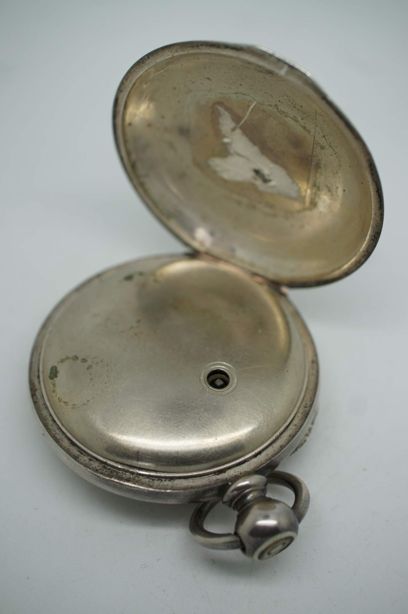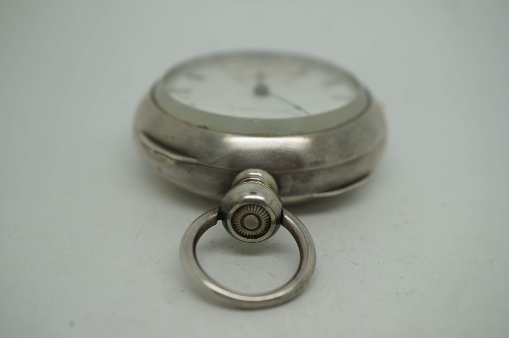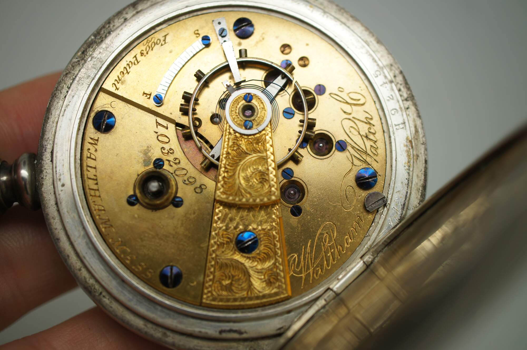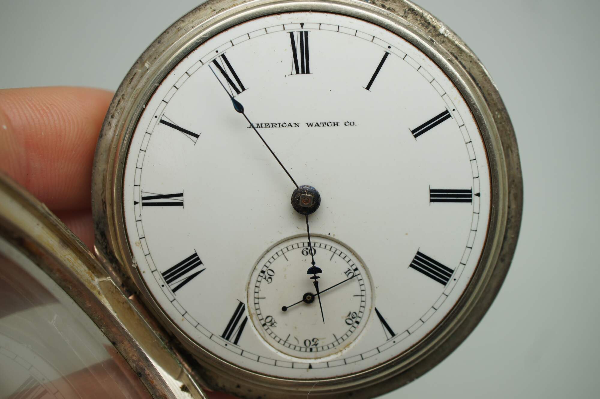 Antique late 1870’s American Watch Company key wound pocket watch. White porcelain face with black Roman numerals; second counting sub-dial with Arabic numerals. No key. Parts not tested.