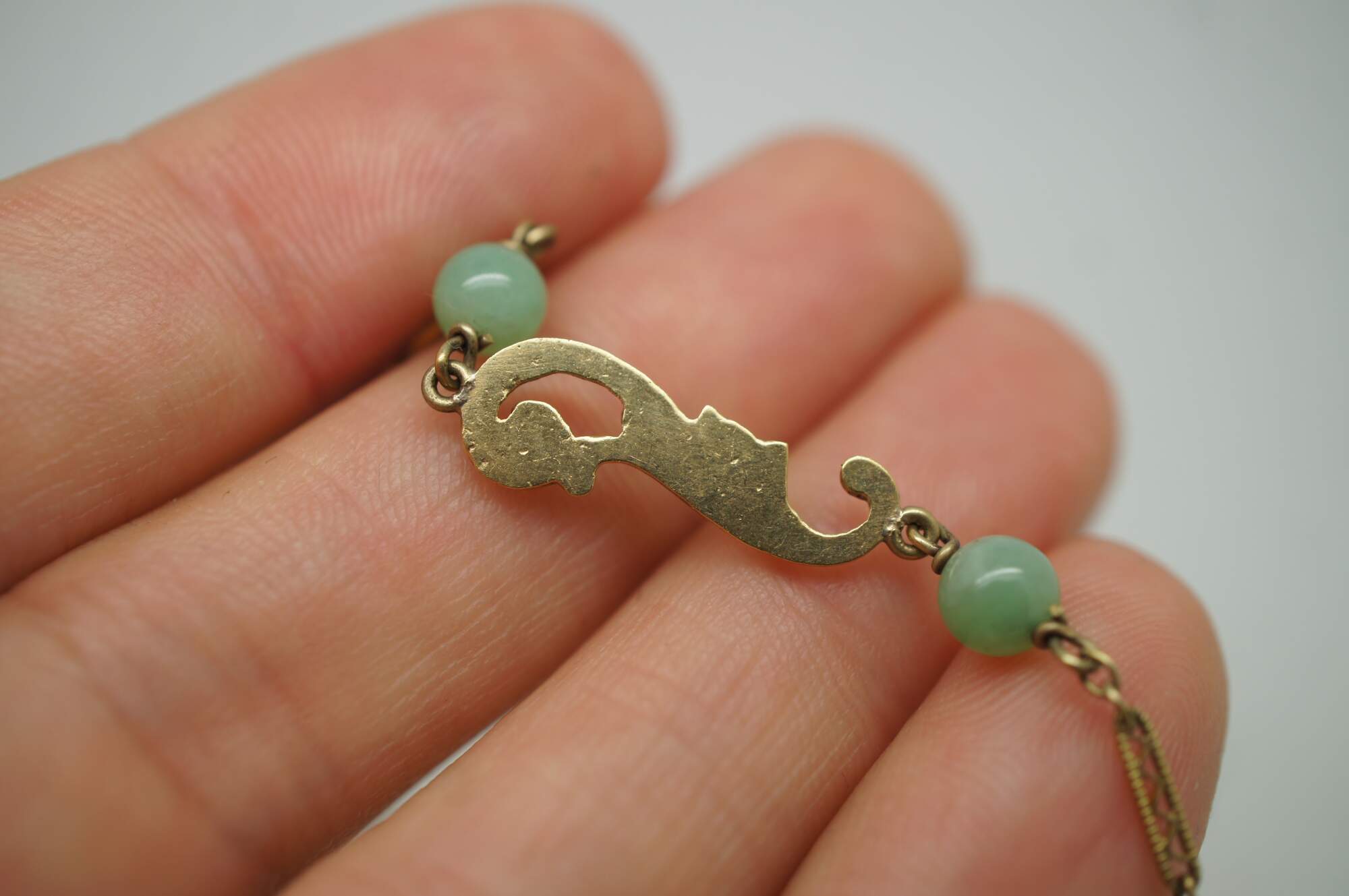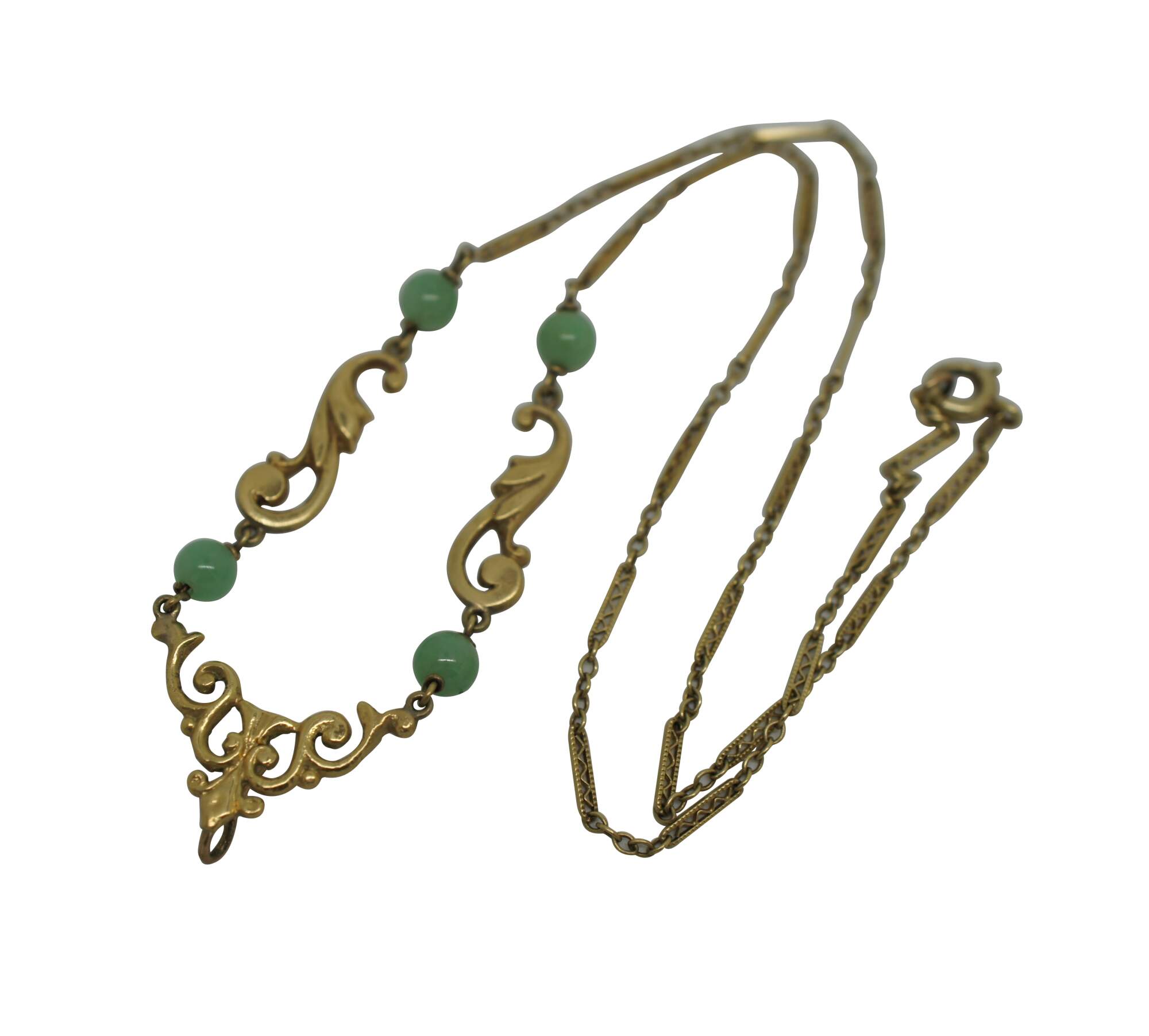 Vintage 14k yellow gold and jade bead ball necklace featuring a Spanish Revival / Art Nouveau style design with serpentine accents and hanging clasp to add a pendant.
