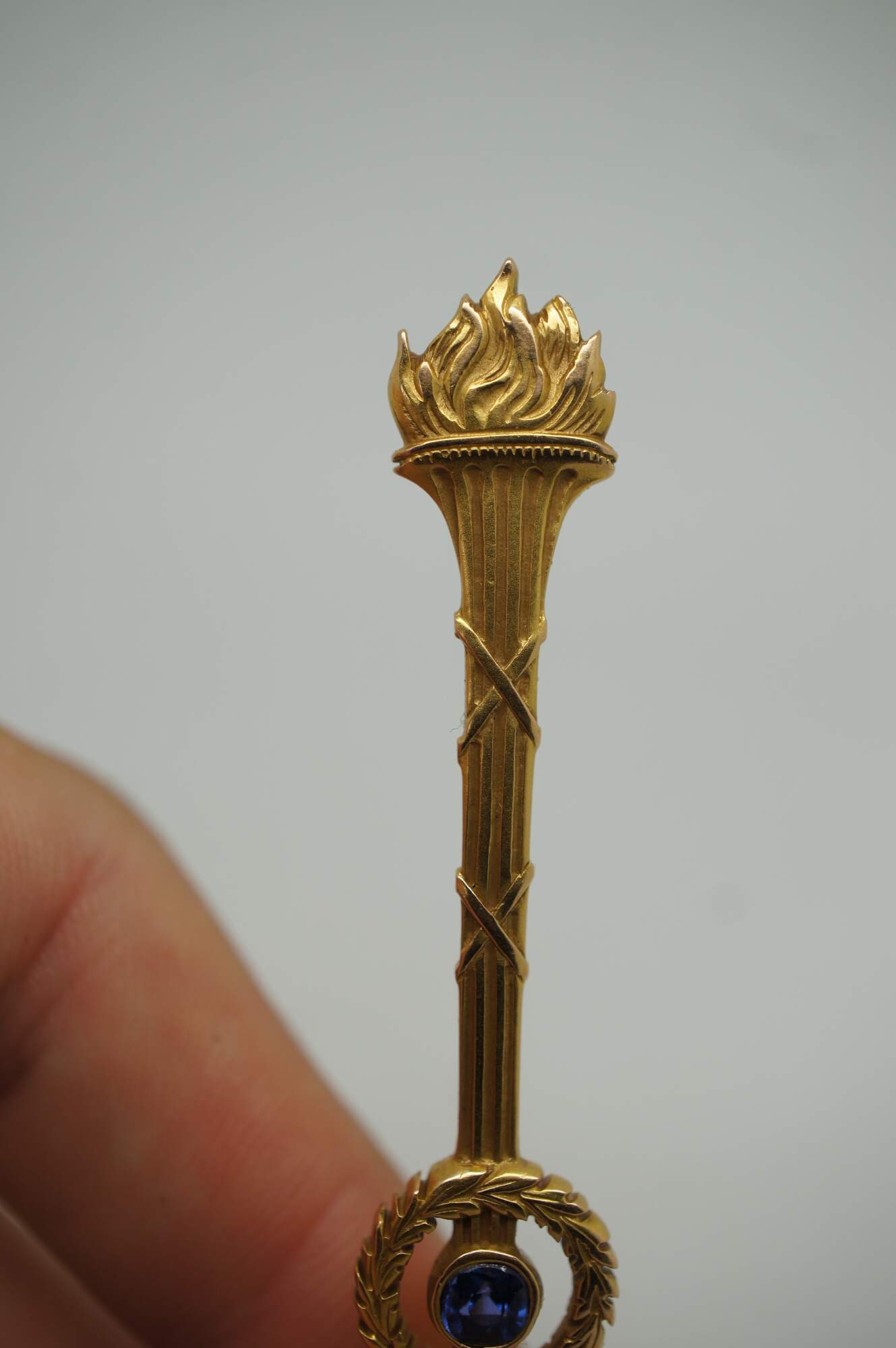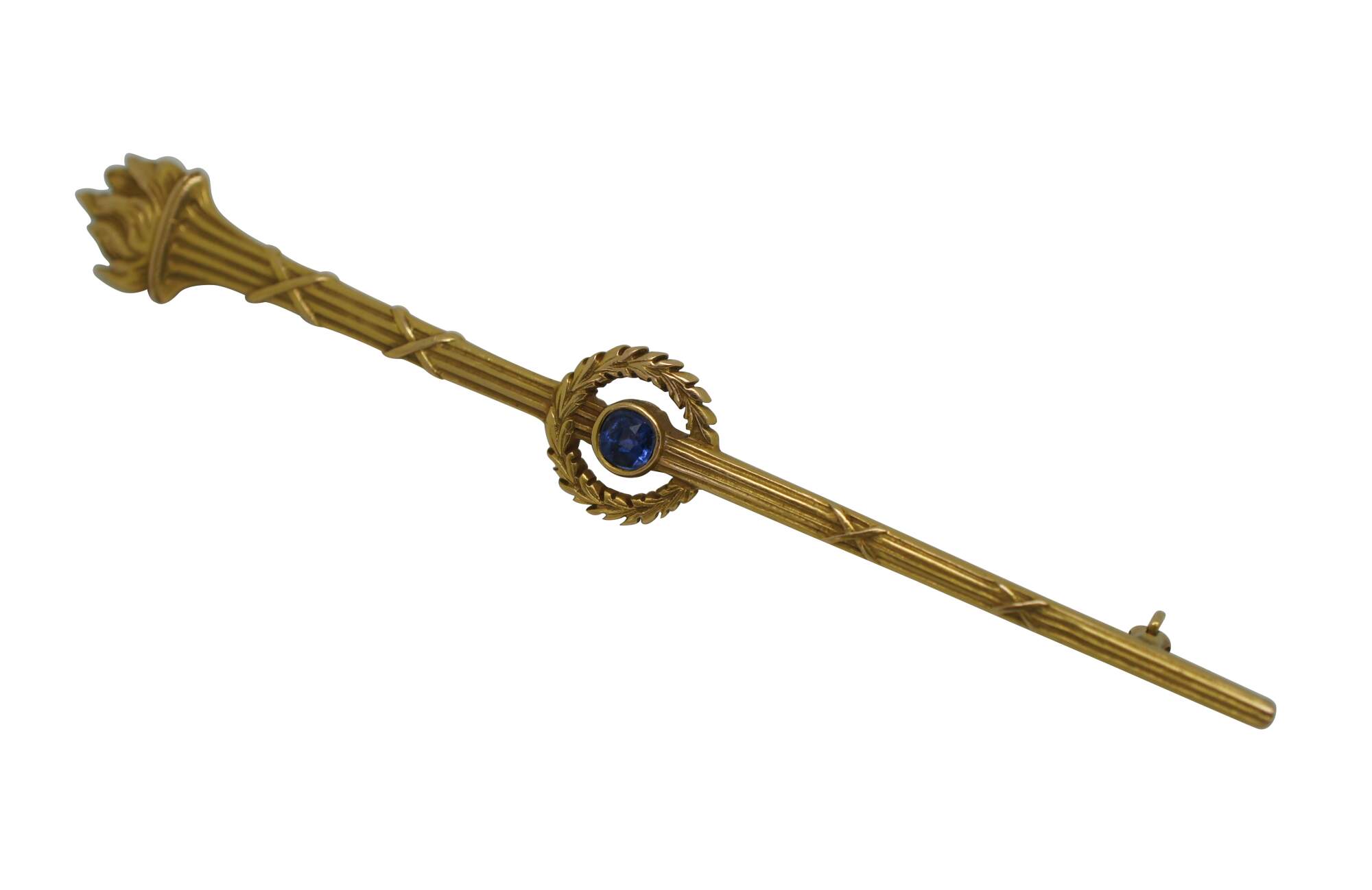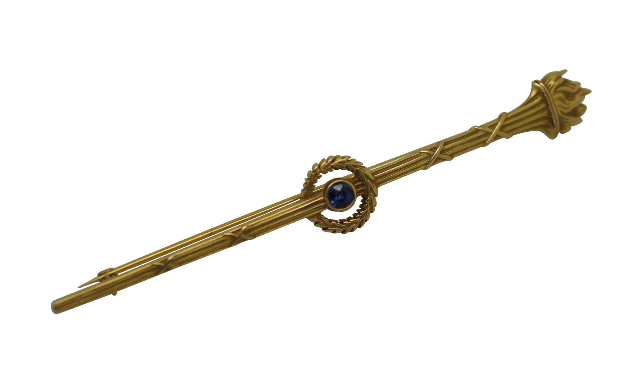 Antique art deco 14K yellow gold pin / brooch by Roger Jones Manufacturing Co, in the shape of a long neoclassical torch (torchiere) with a laurel wreath at the center framing a round cut blue sapphire.
