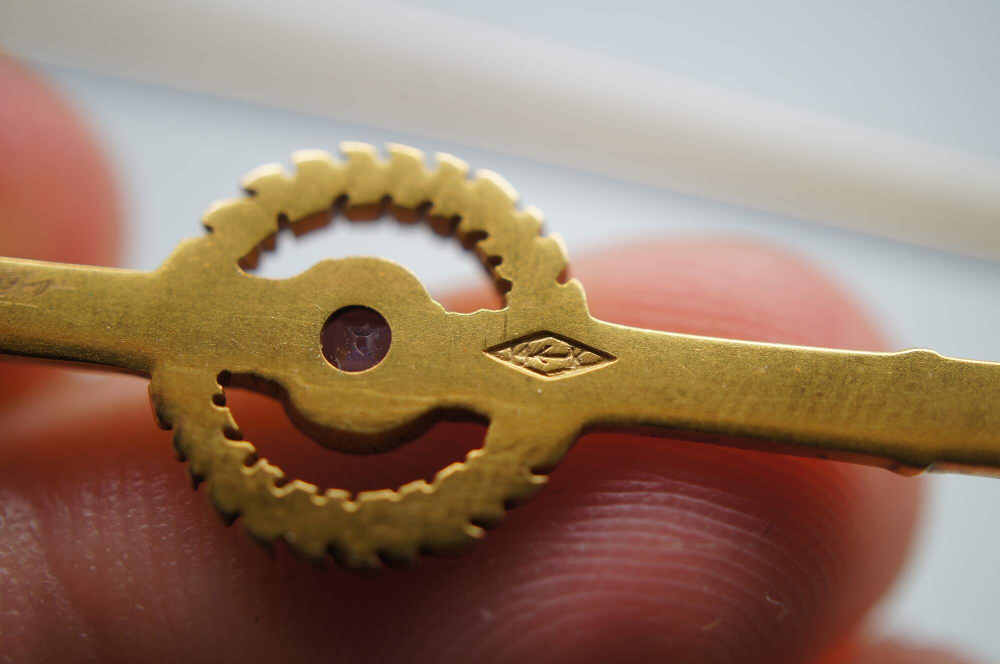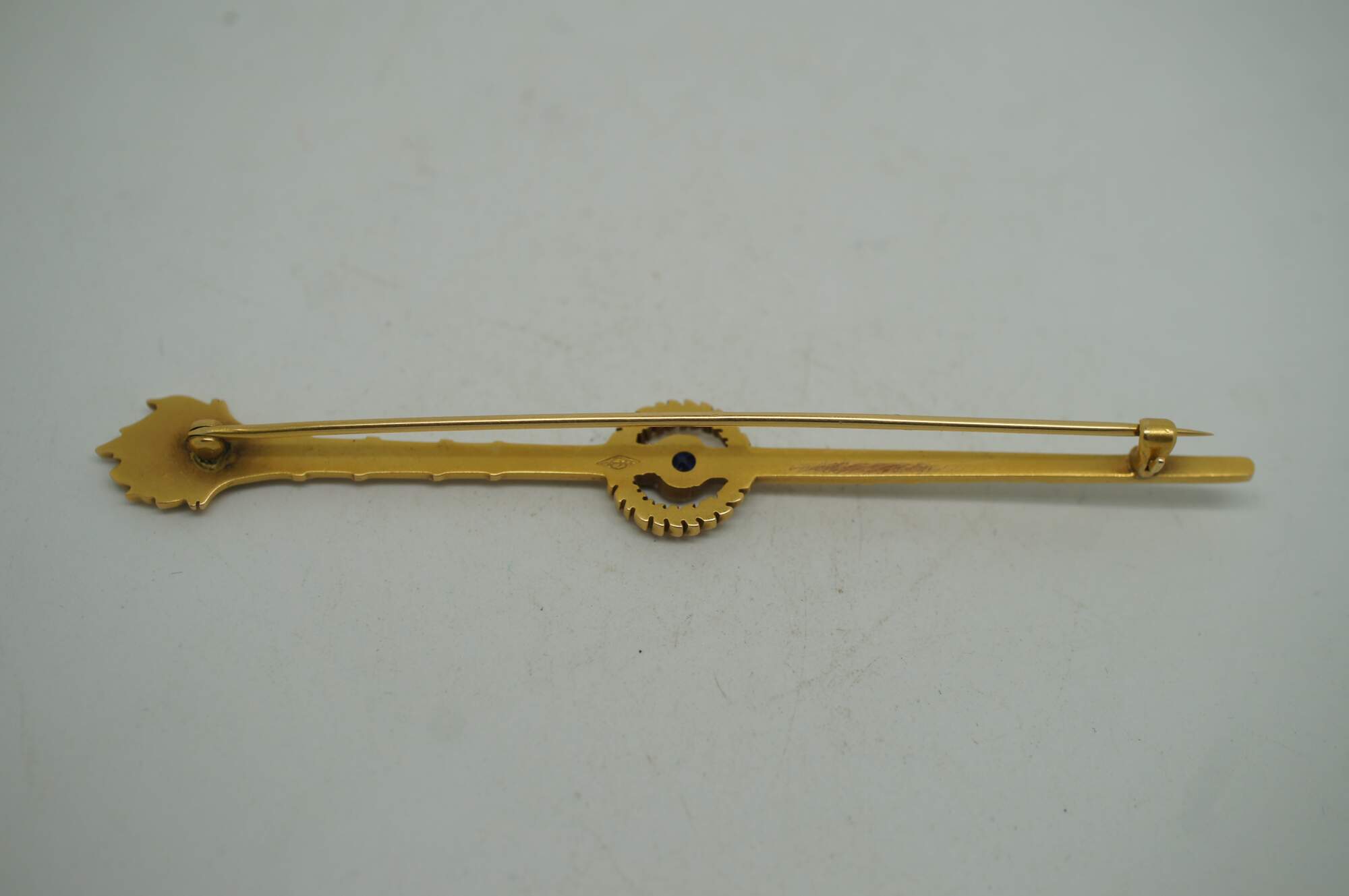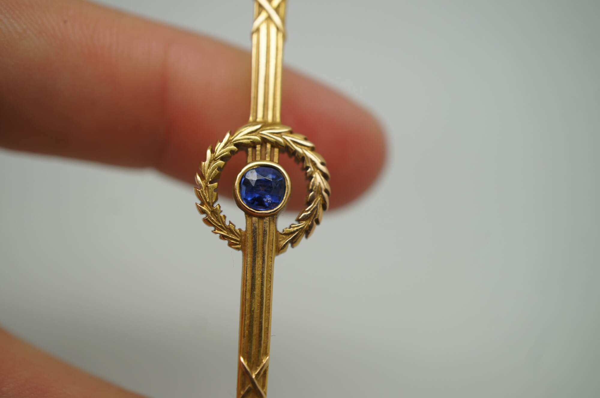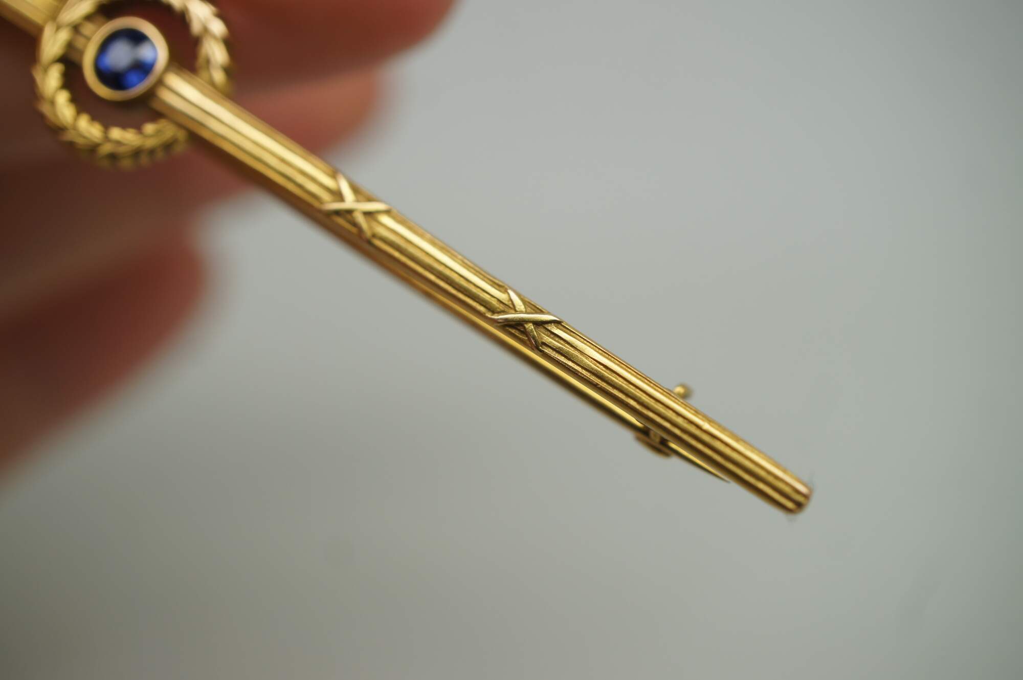 Antique art deco 14K yellow gold pin / brooch by Roger Jones Manufacturing Co, in the shape of a long neoclassical torch (torchiere) with a laurel wreath at the center framing a round cut blue sapphire.