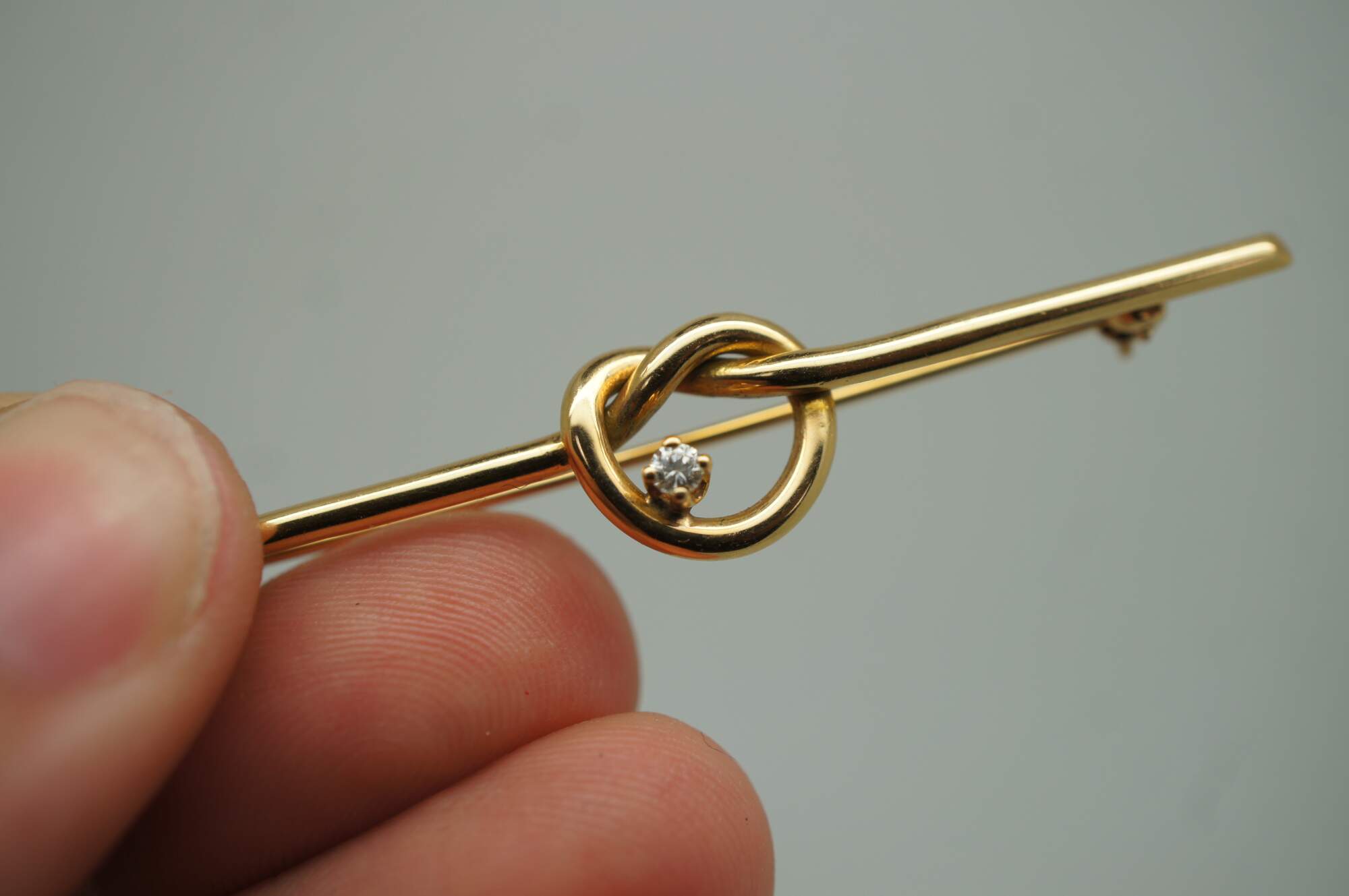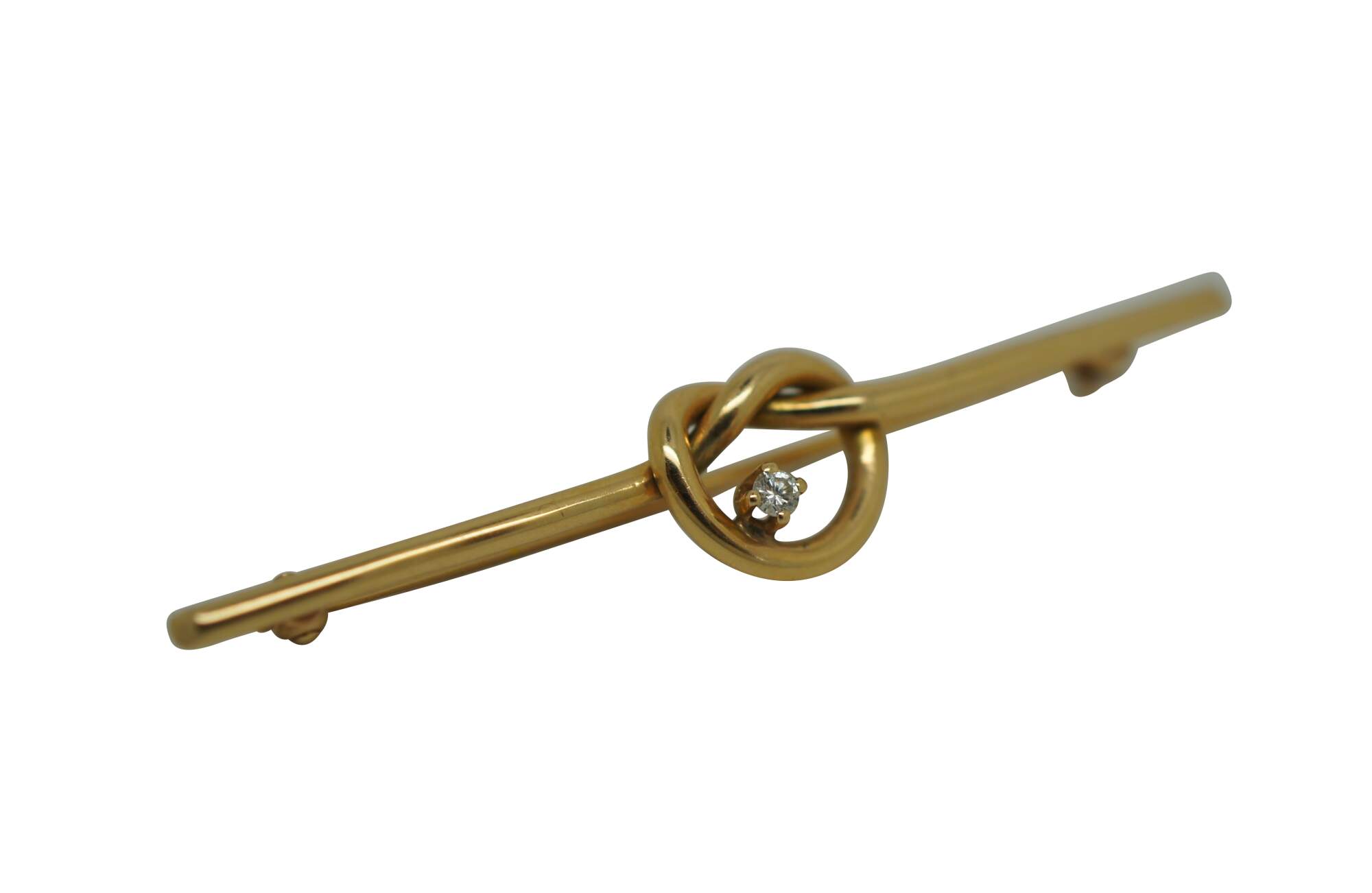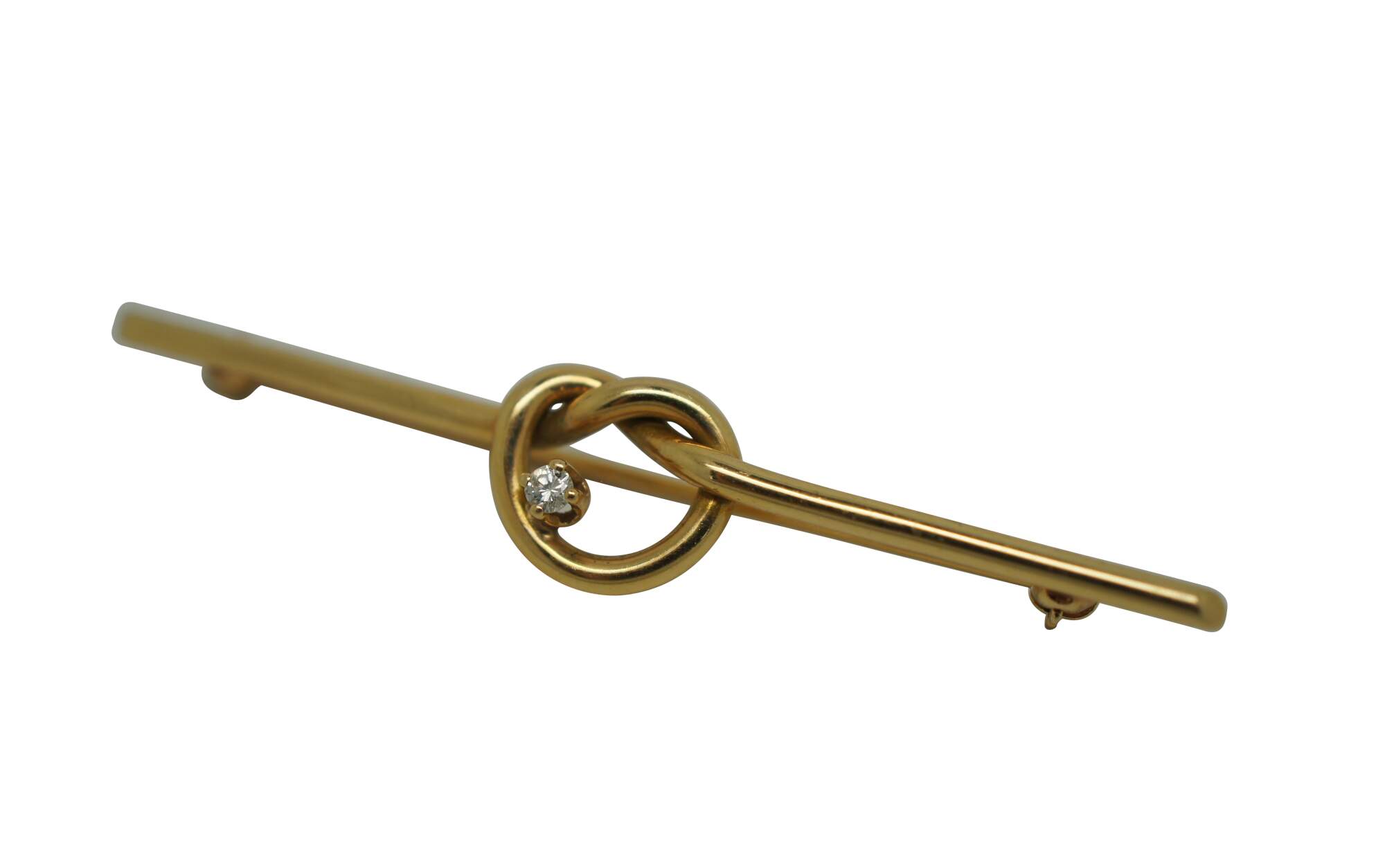 Vintage 14k yellow gold bar pin / brooch with a pretzel shape twist / knot at the center accented with a diamond. Straight pin back.