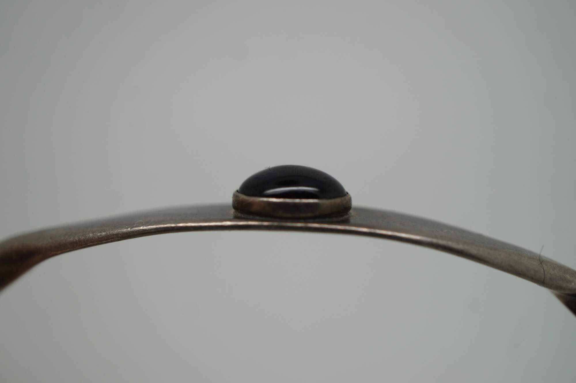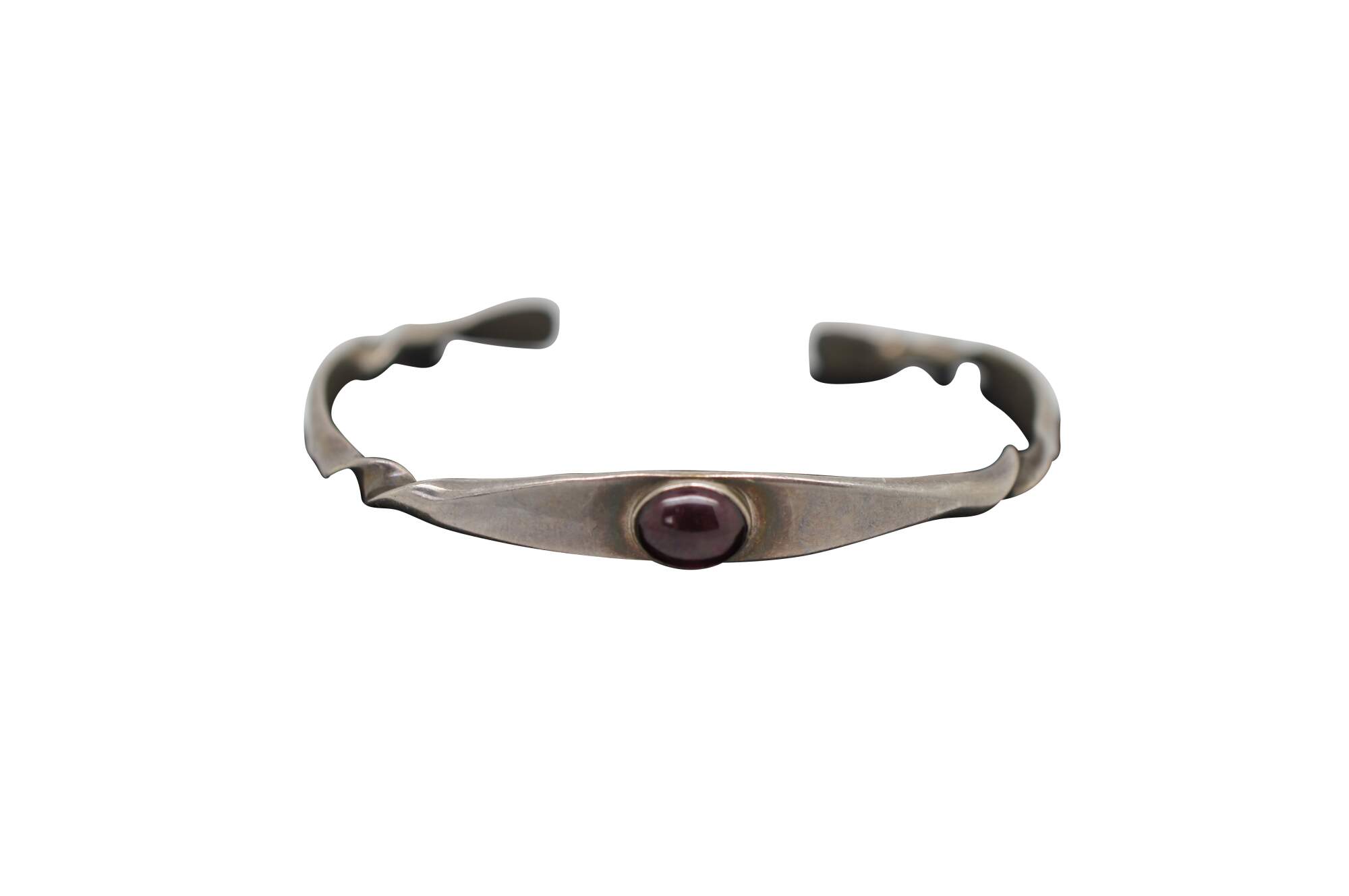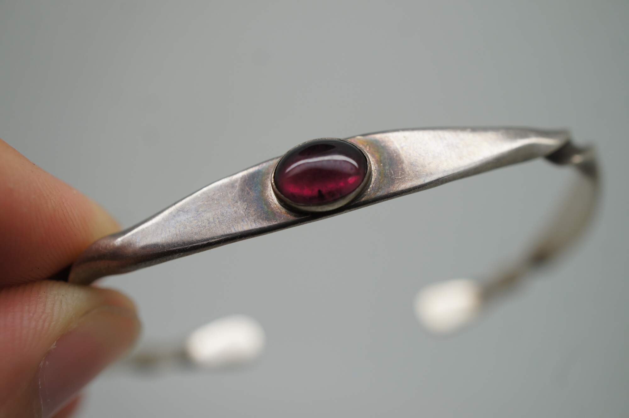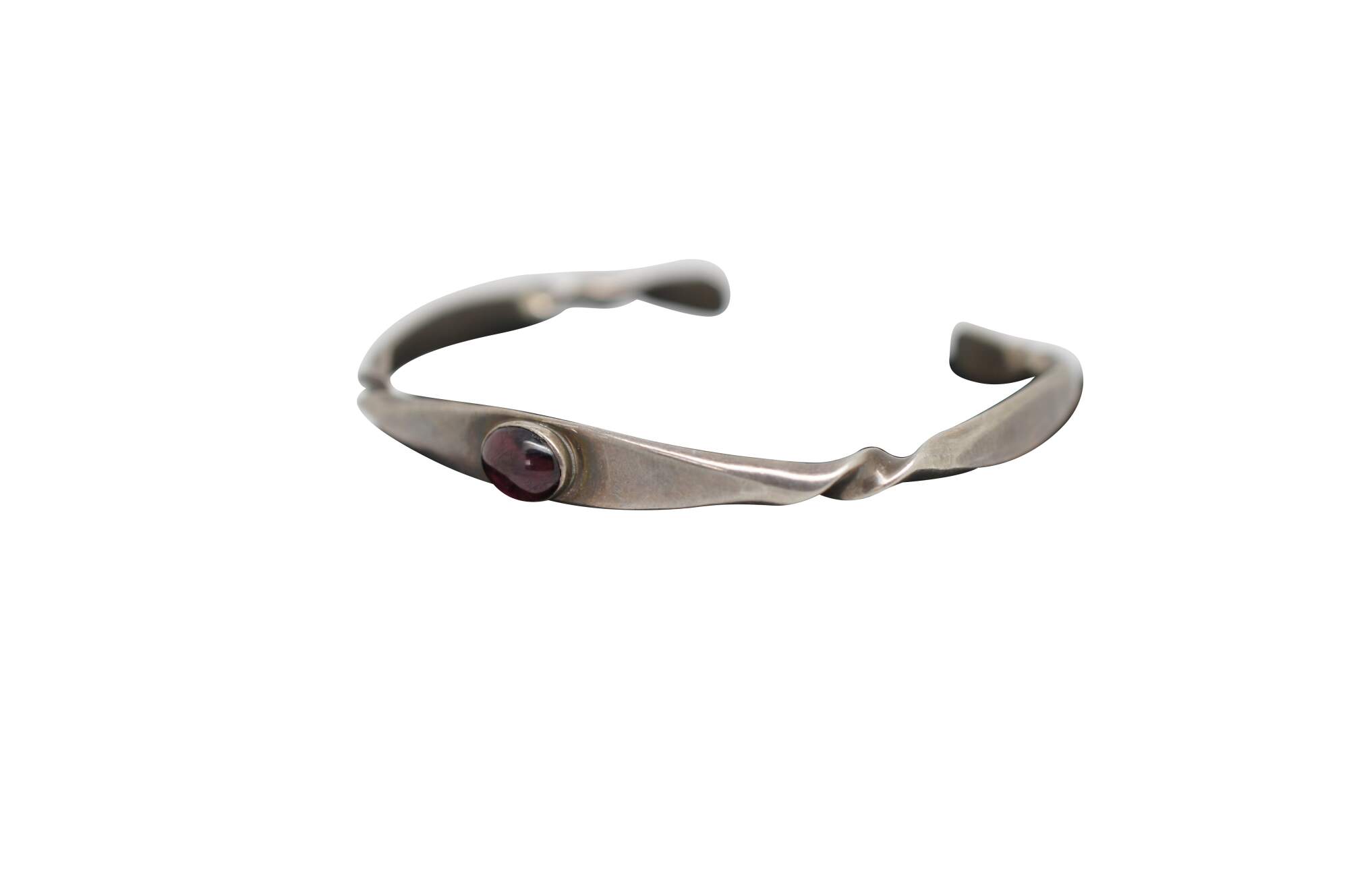 Vintage sterling silver bangle / cuff bracelet with twisted details and a grape colored round cabochon rhinestone. Marked Sterling with Kenny Guerro KG maker’s mark.