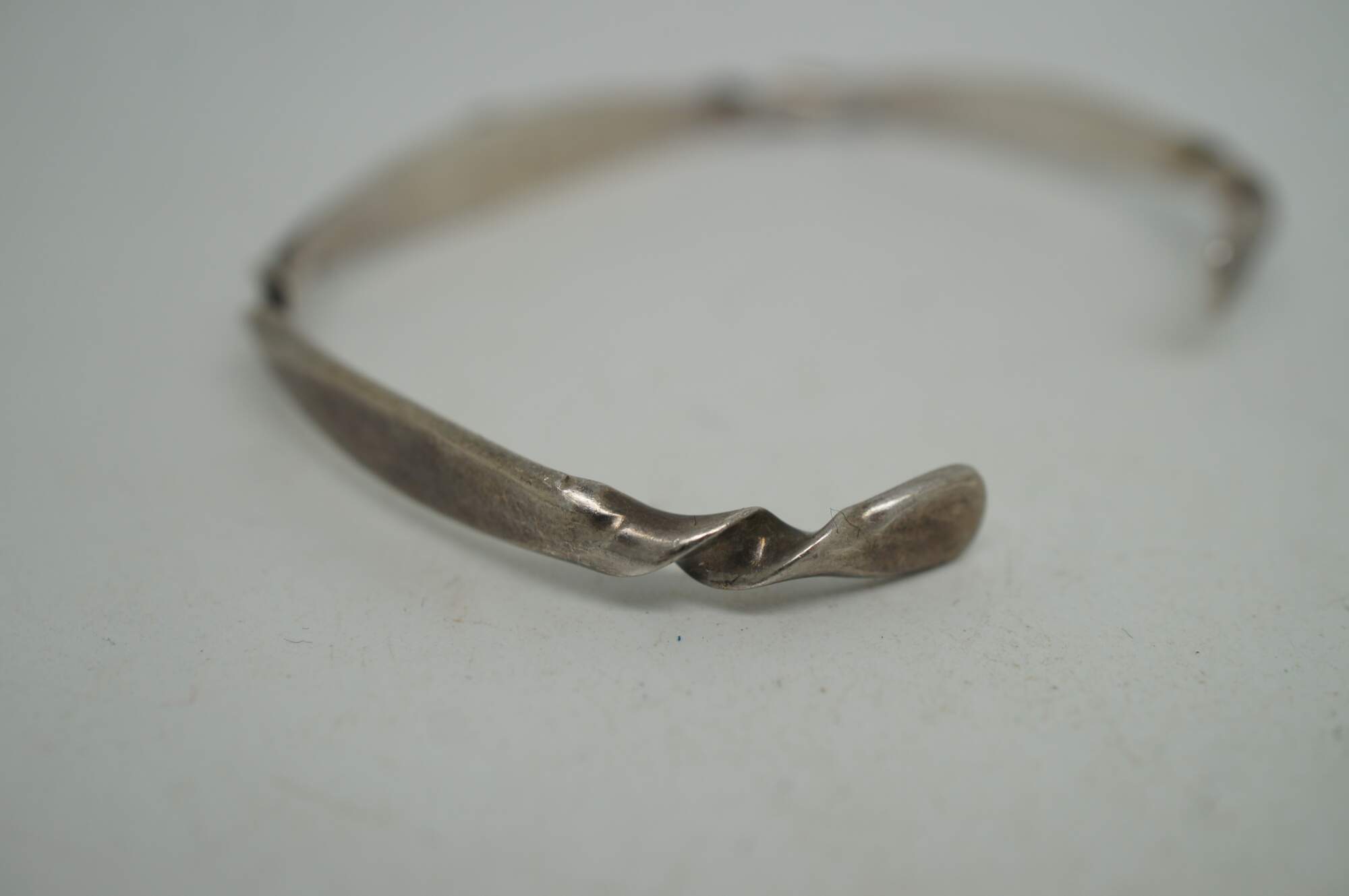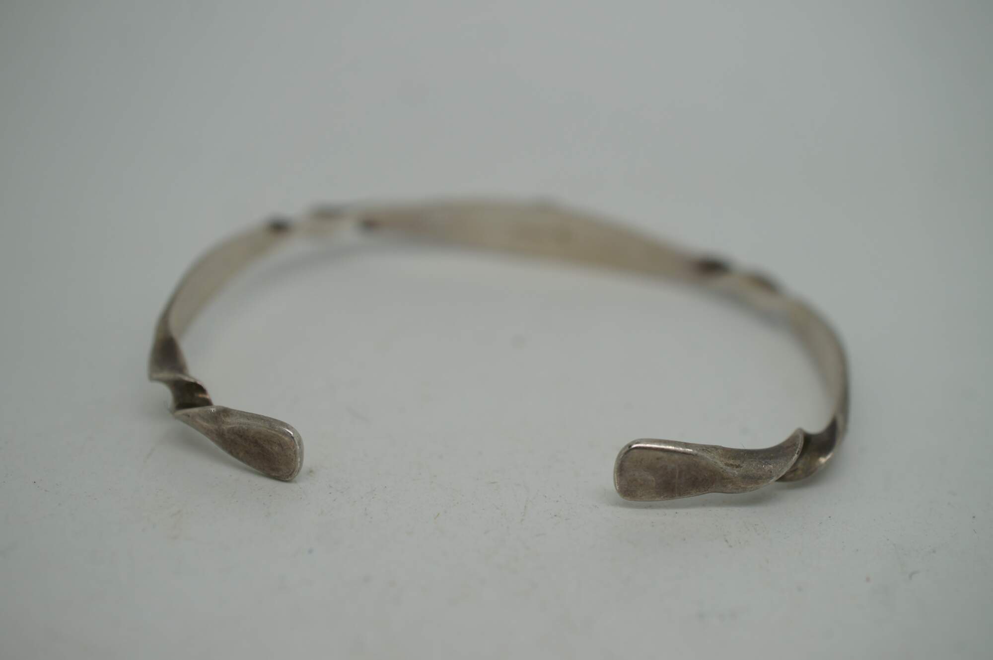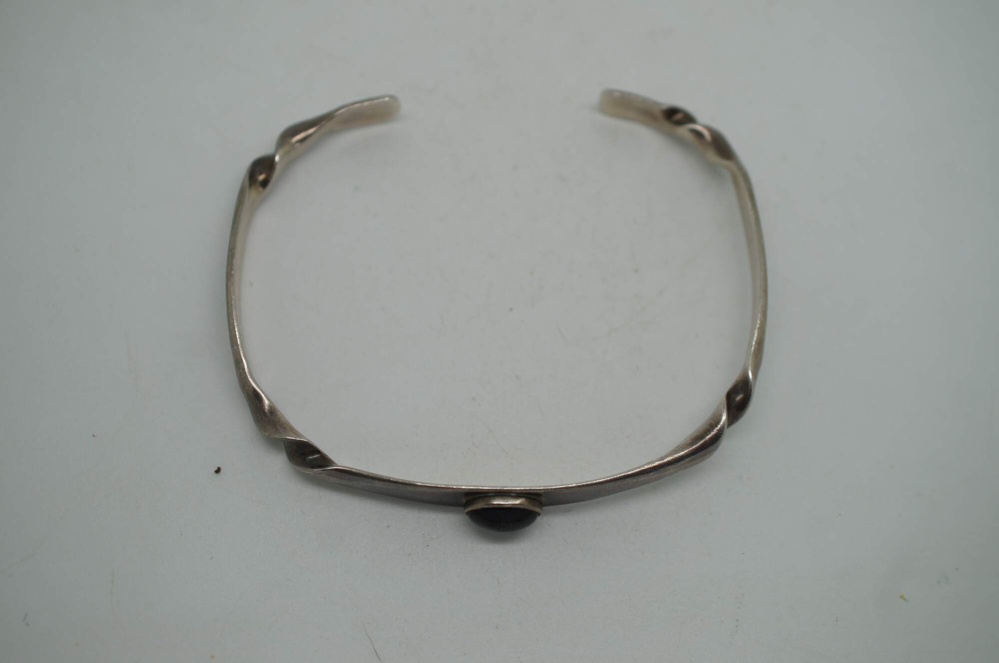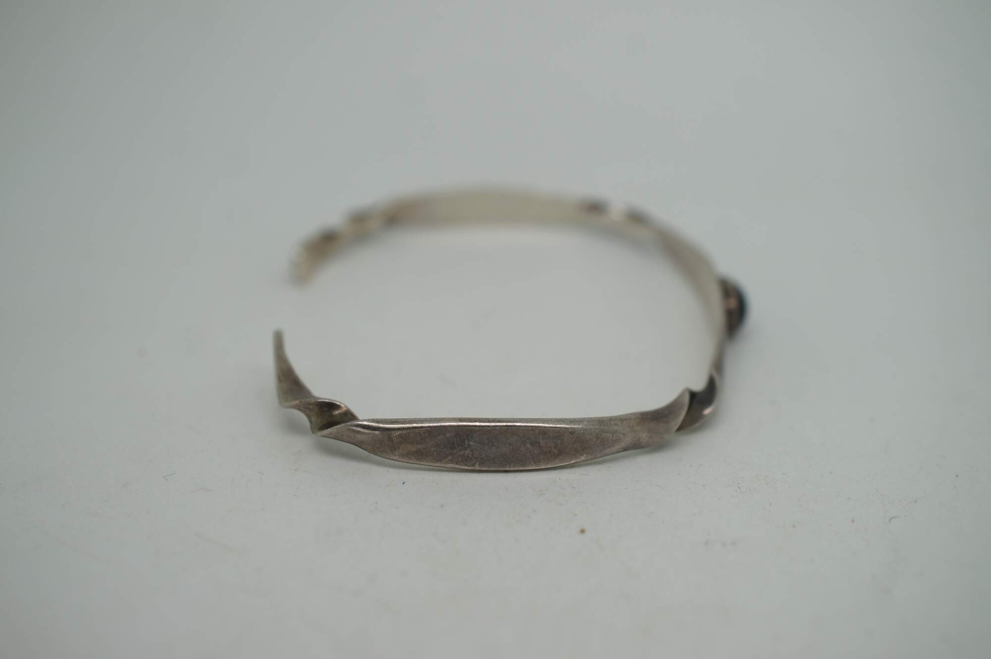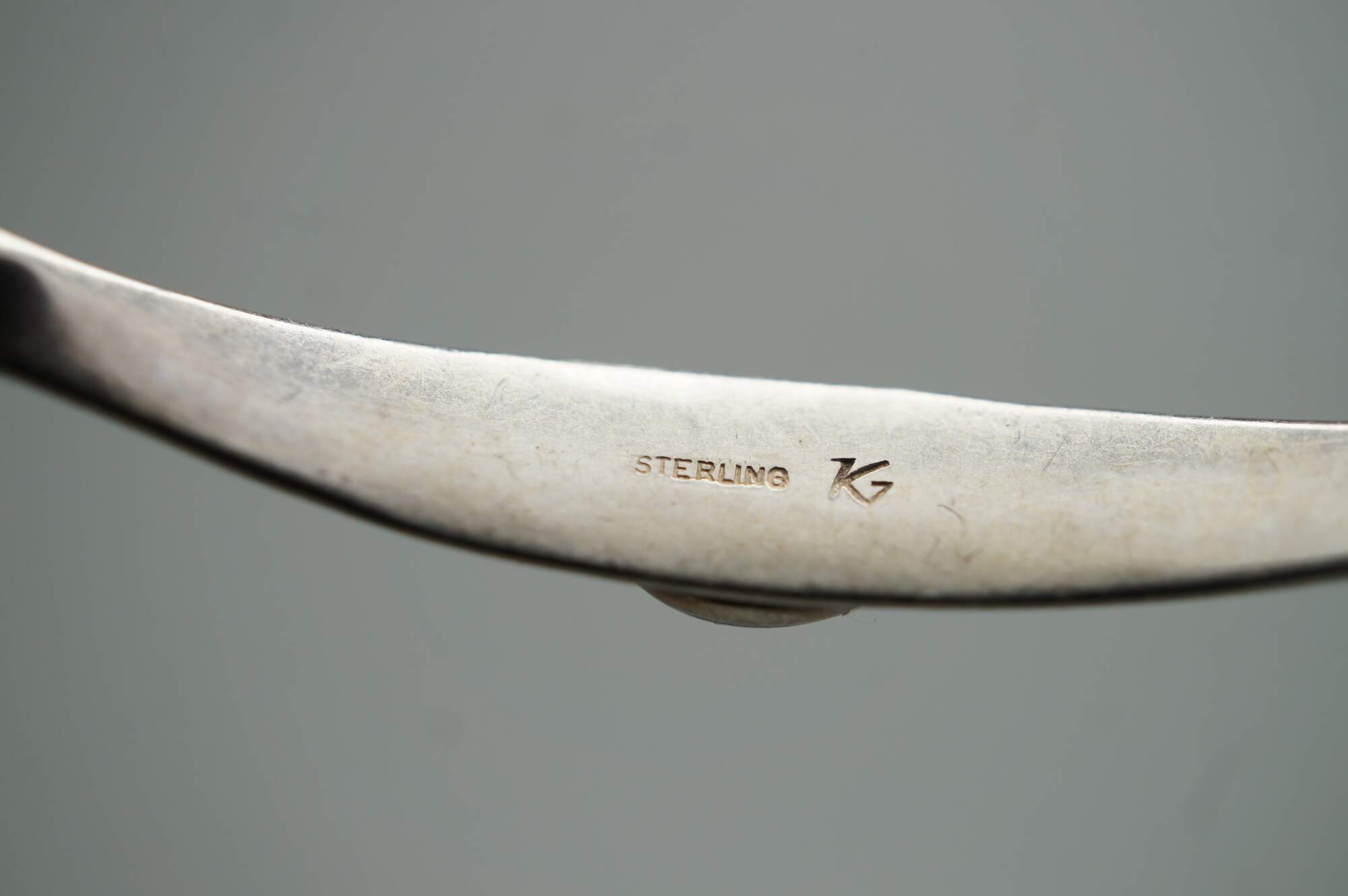Vintage sterling silver bangle / cuff bracelet with twisted details and a grape colored round cabochon rhinestone. Marked Sterling with Kenny Guerro KG maker’s mark.