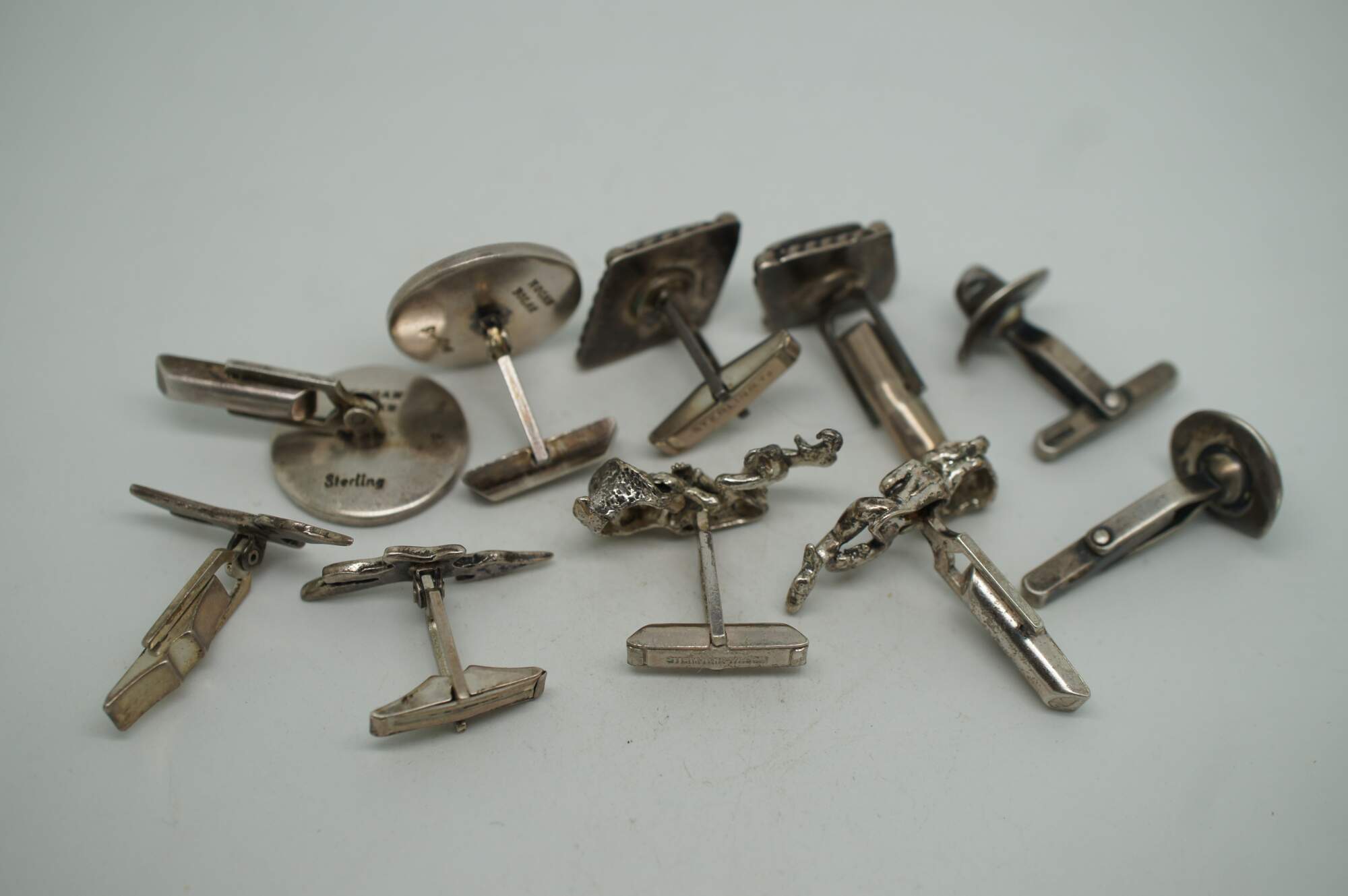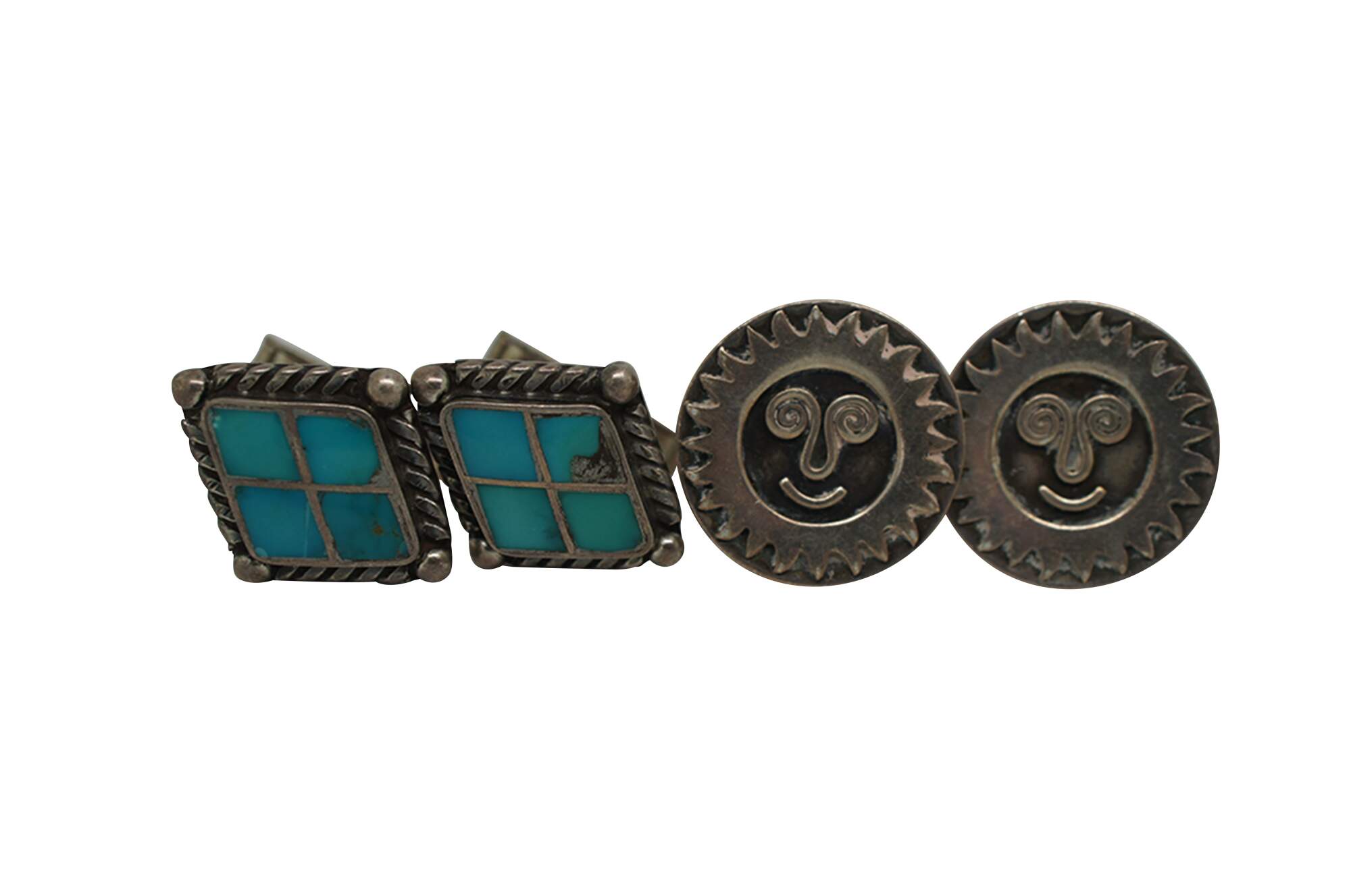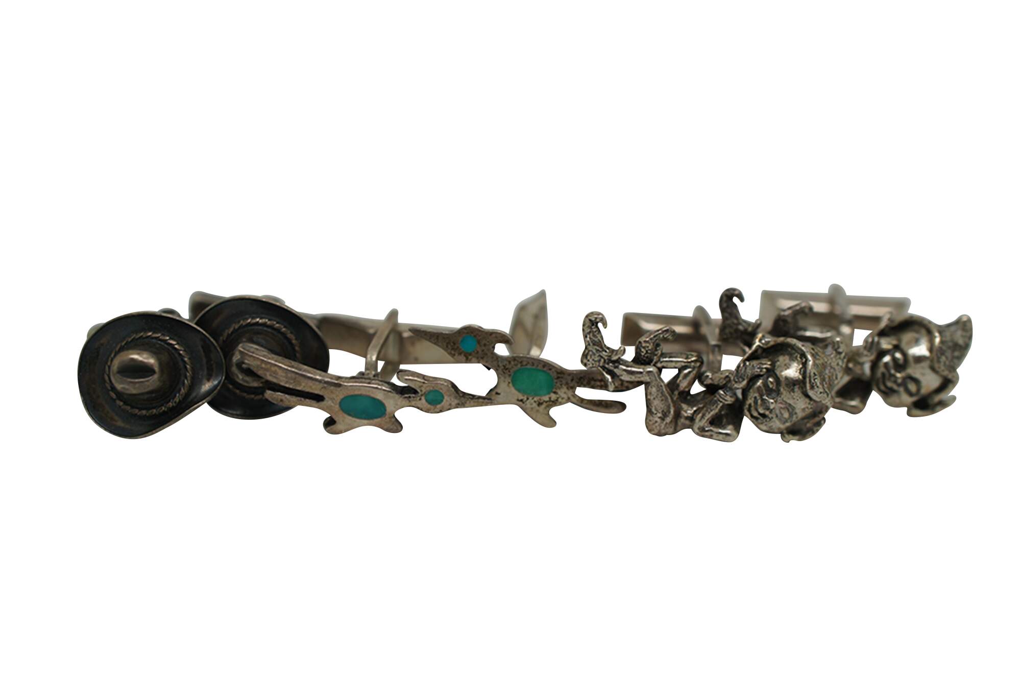 Lot of 5 pairs of vintage sterling silver cufflinks, primarily featuring Southwest or Mexican styling. Lot includes: smiling suns by Hogan Bolas; diamonds inlaid with turquoise / enamel; roadrunners with inlaid turquoise / enamel; cowboy / Stetson hats; and elves / sprites.