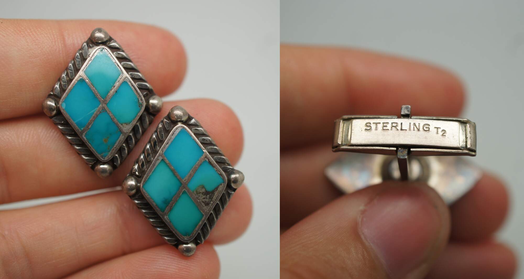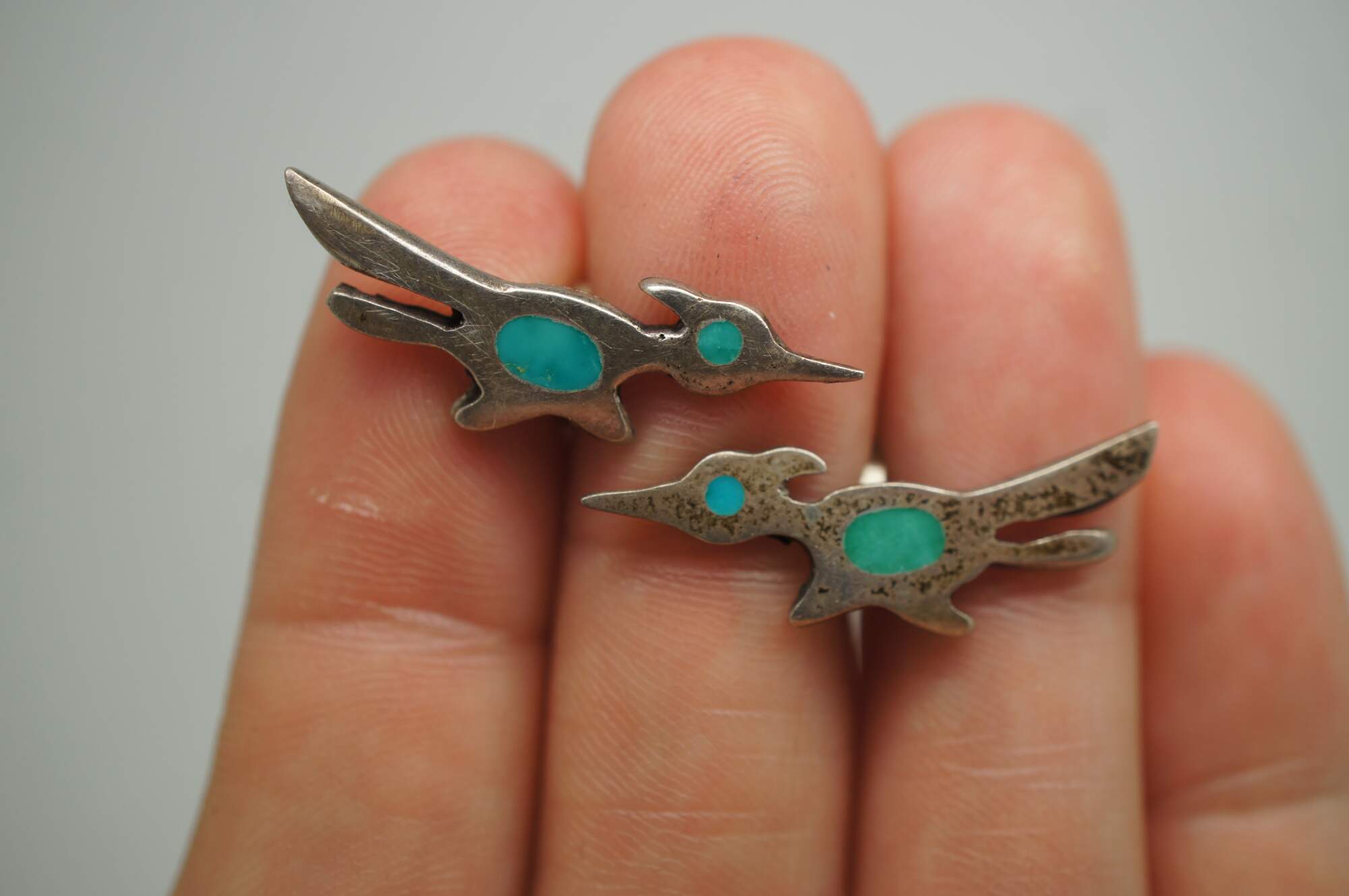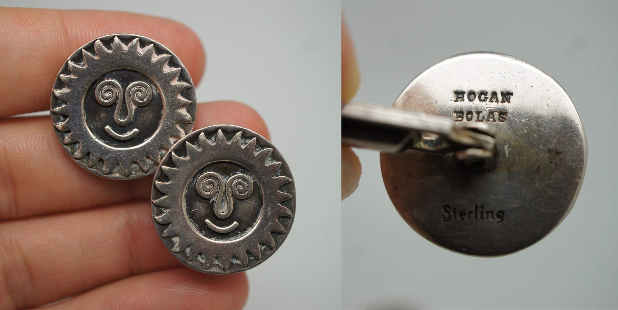 Lot of 5 pairs of vintage sterling silver cufflinks, primarily featuring Southwest or Mexican styling. Lot includes: smiling suns by Hogan Bolas; diamonds inlaid with turquoise / enamel; roadrunners with inlaid turquoise / enamel; cowboy / Stetson hats; and elves / sprites.