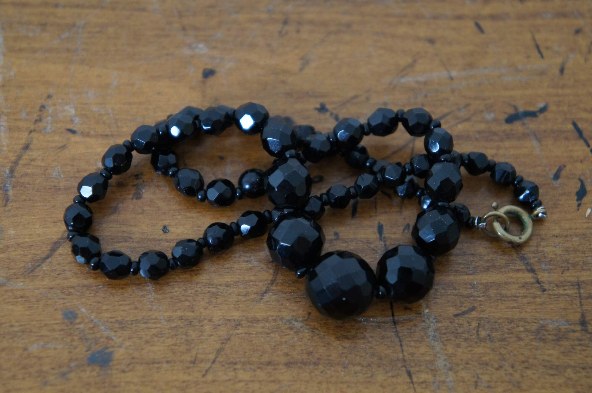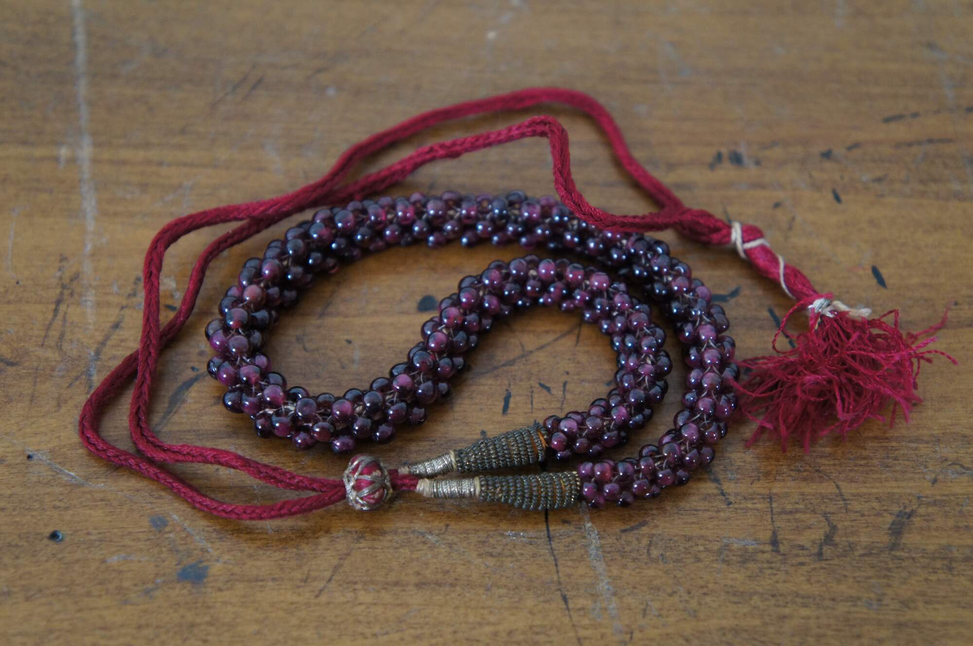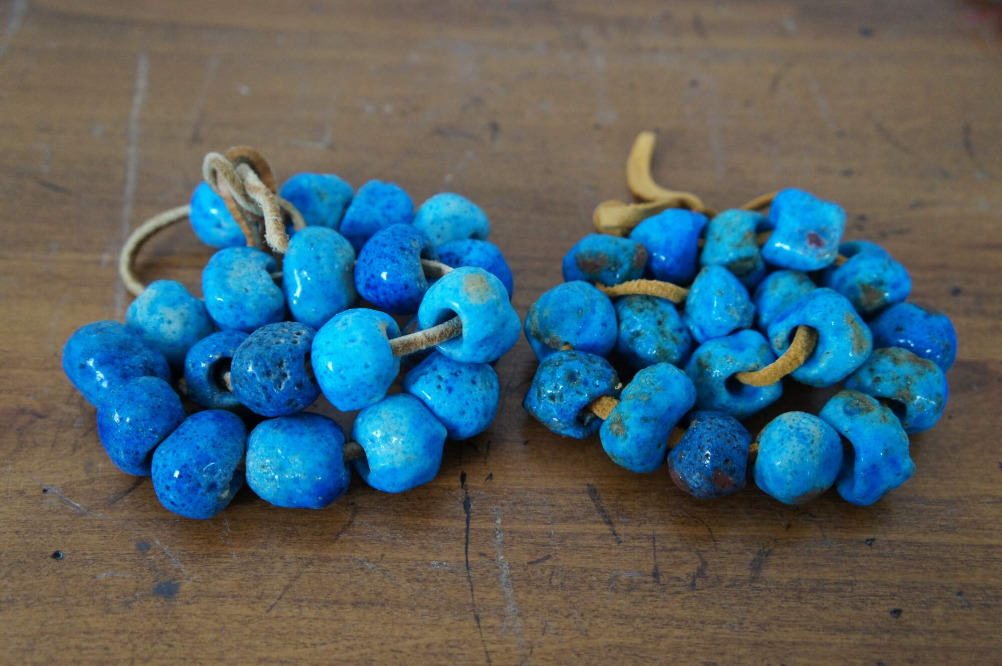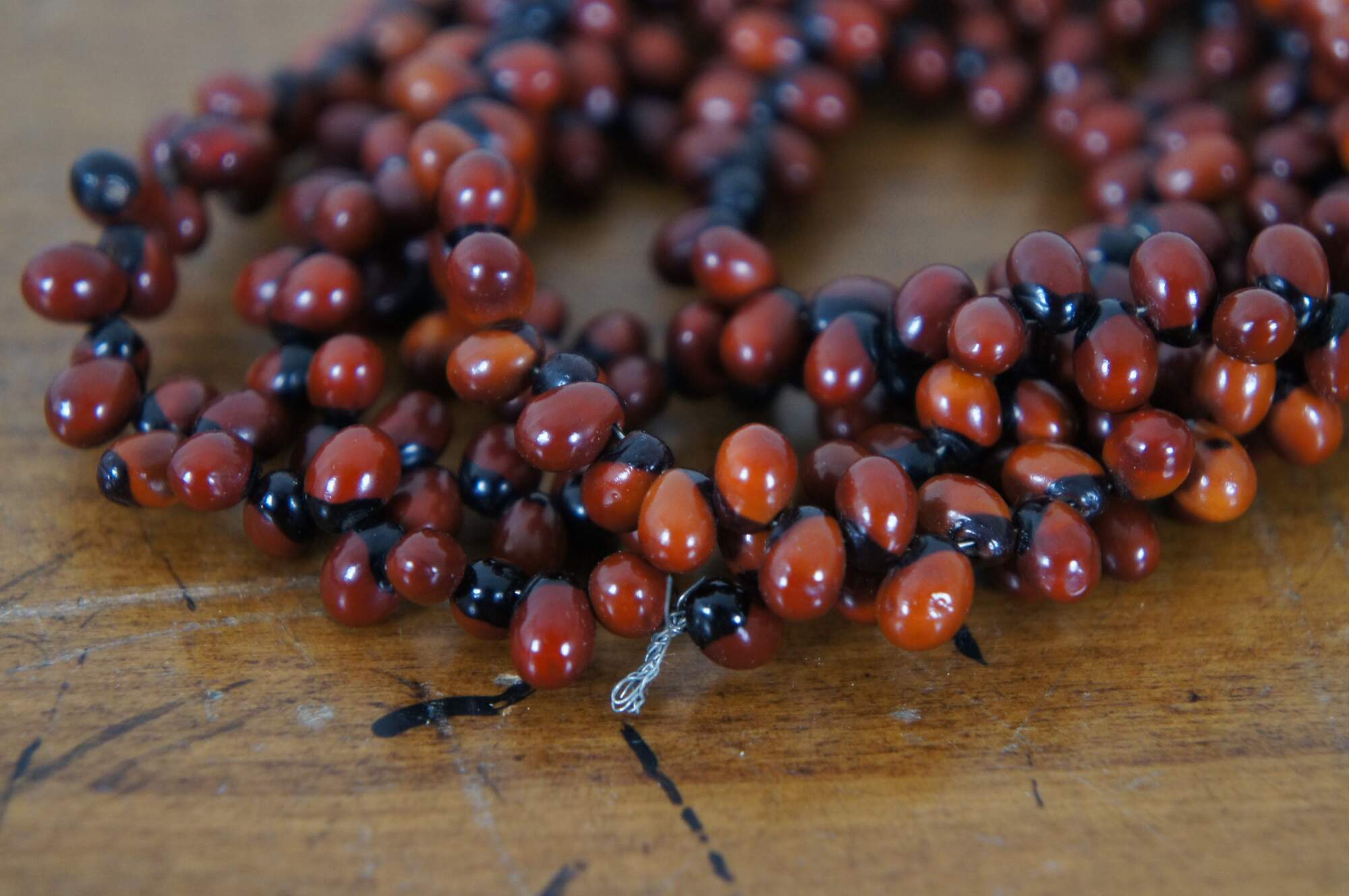 Lot of 6 vintage beaded necklaces including 2 turquoise colored stone nuggets on leather cord; one graduated, faceted, black plastic beads with spring ring clasp; butterscotch and amber faux stone beads on knotted yellow cord with spring ring clasp; purple seed bead rope with brass caps and adjustable red cord; and a single strand of brown and black seed shaped beads.