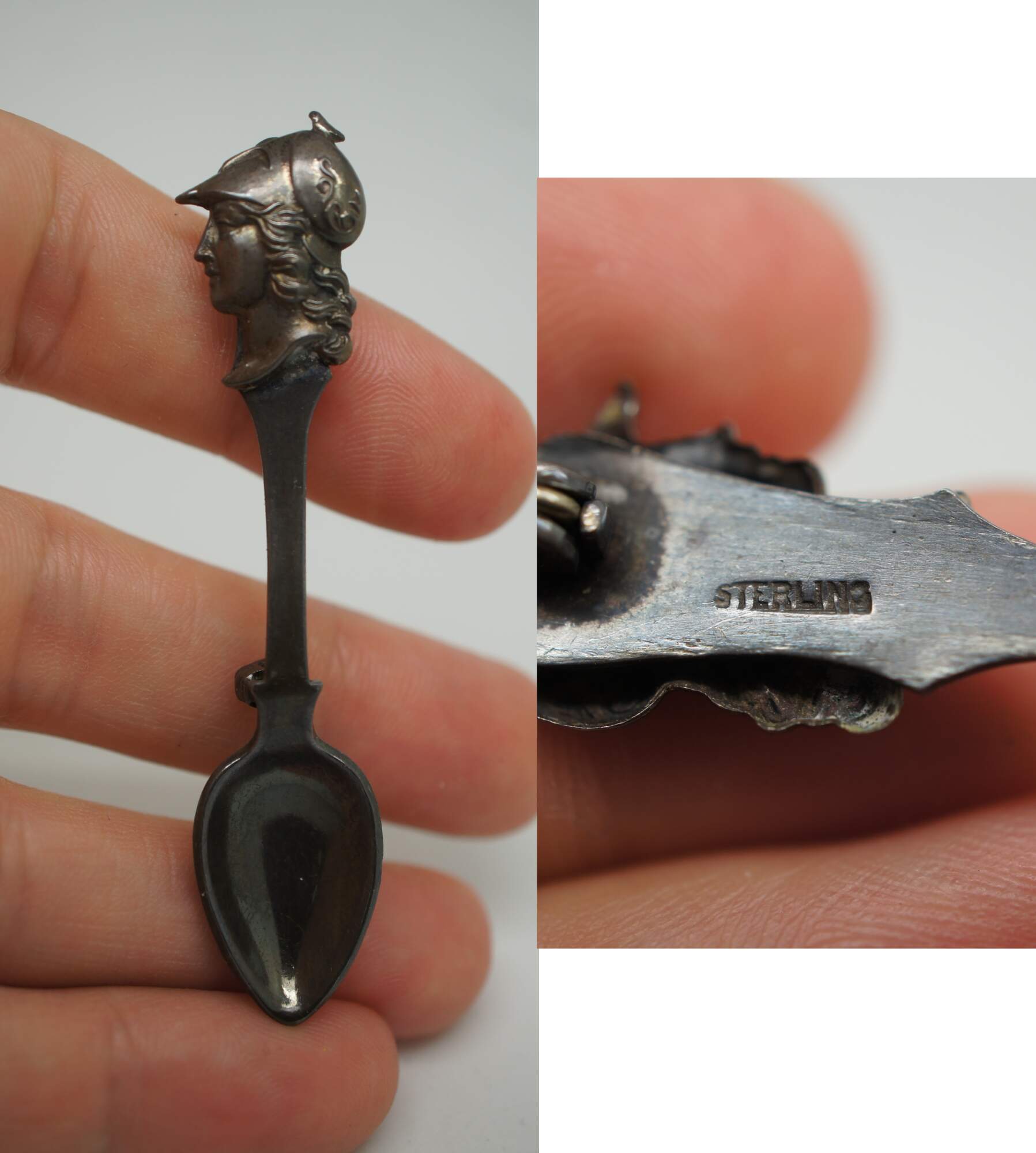 Lot of 11 vintage brooches, lapel pins and tie bar in a variety of styles. Lot includes: 2 gold tone bar pins with rectangular stone / agate; translucent yellow Bakelite/plastic pin carved with a leafy vine and black painted ends; swirling studded brass pin with two white rhinestones; Art Deco diamond shape pin with oxblood red carnelian glass; Swank gold tone tie bar with suspended initials EH; sterling silver miniature spoon pin topped with the head of Athena; carved tortoiseshell pattern plastic seahorse; cluster pin beaded with turquoise and pearl seed beads; sterling silver roadrunner with inlaid turquoise stone; and a gold tone Omega Iota lapel pin studded with seed pearls and initials NHW on back.