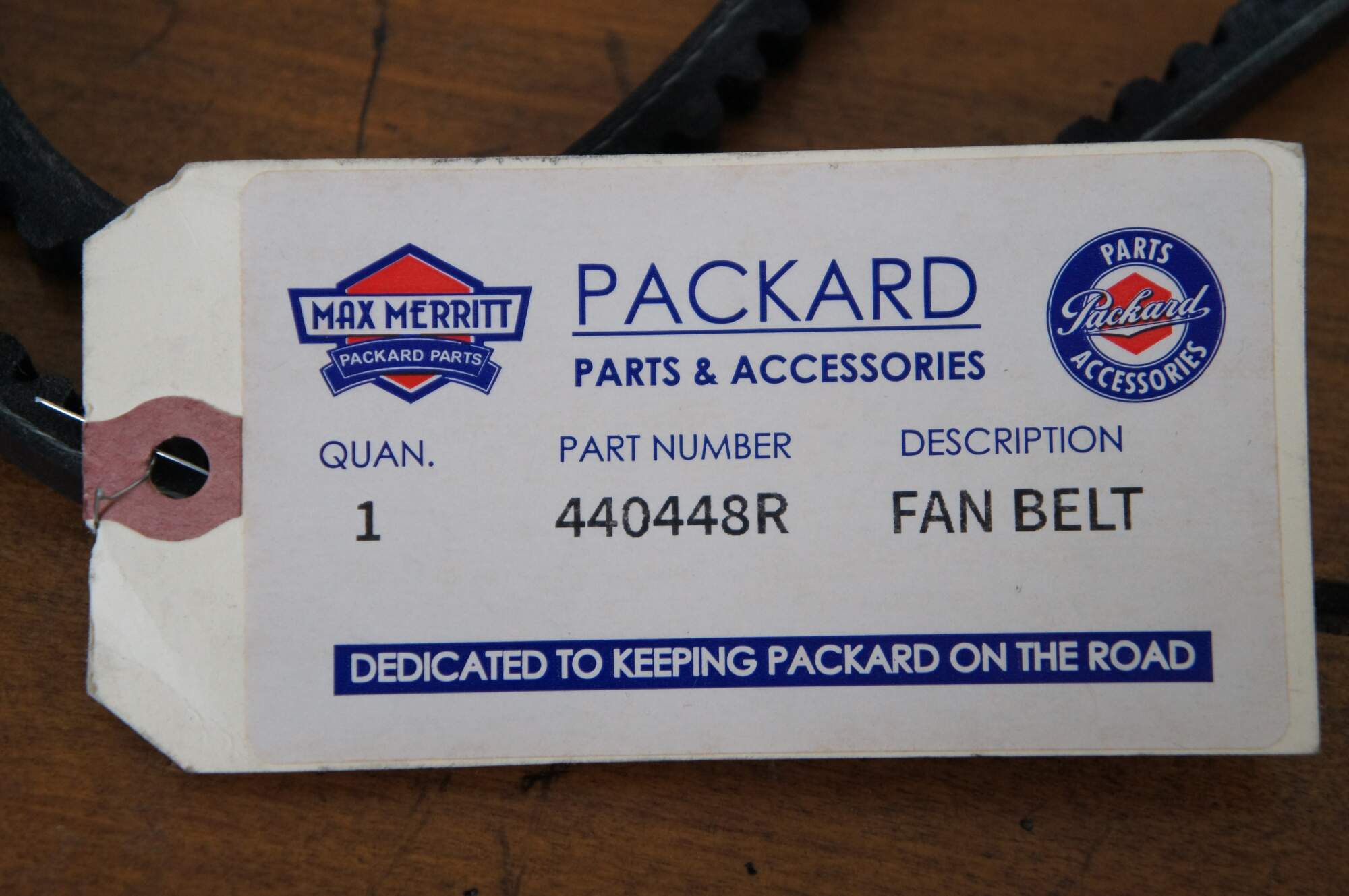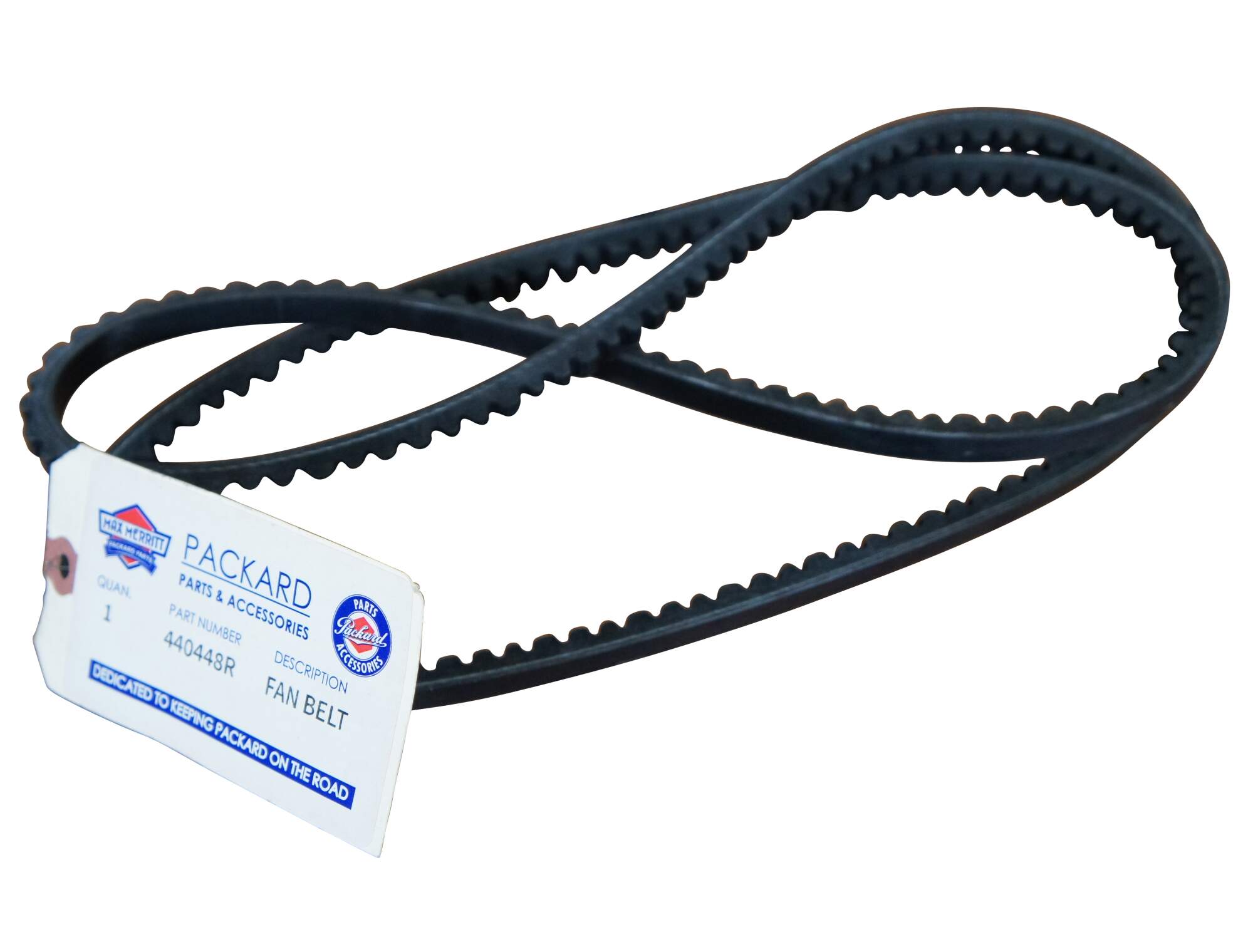 Replacement fan belt for circa 1955-1956 Packard. Part Number 440448R. Originally purchased from Max Merritt Packard Parts.