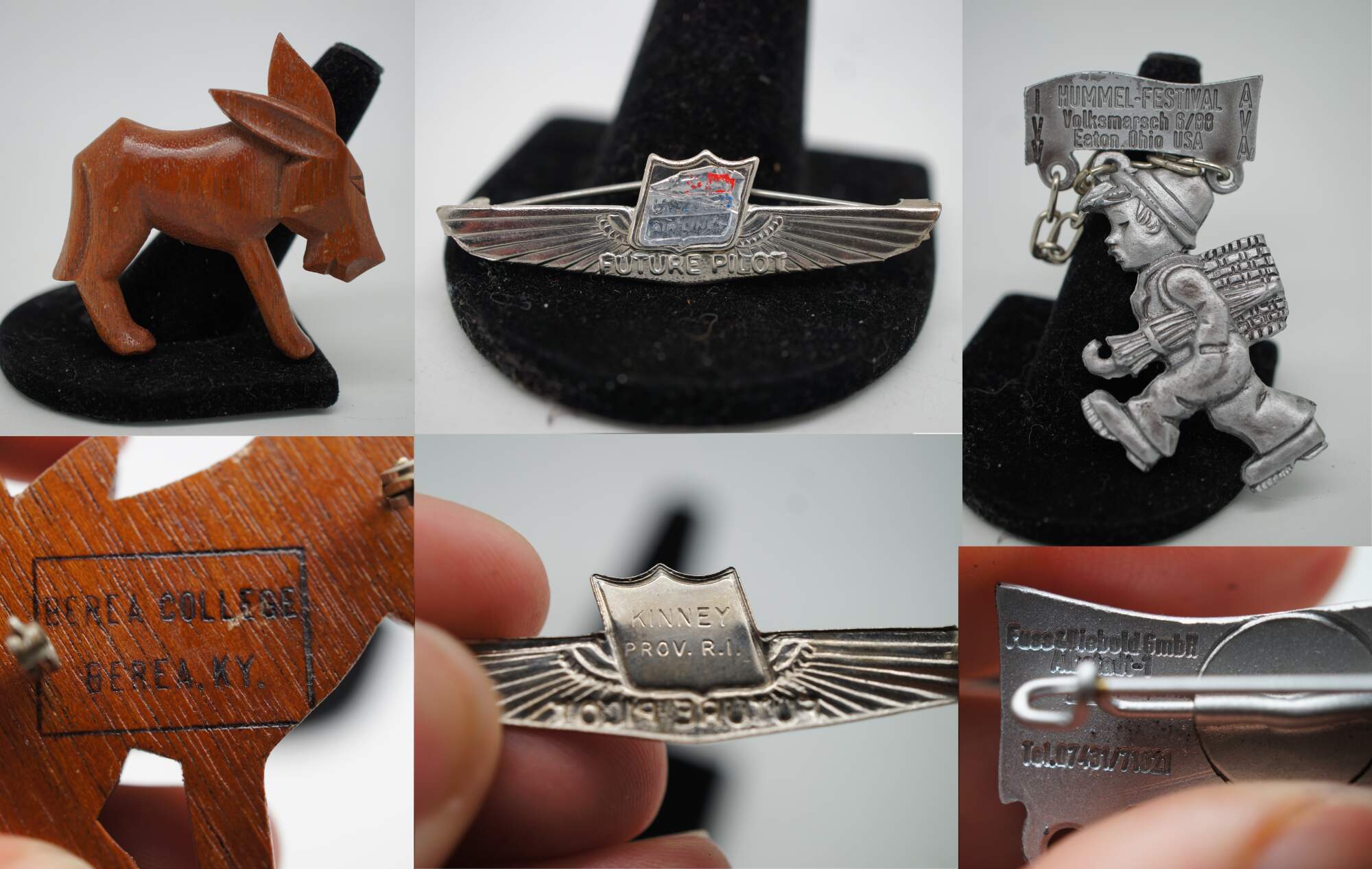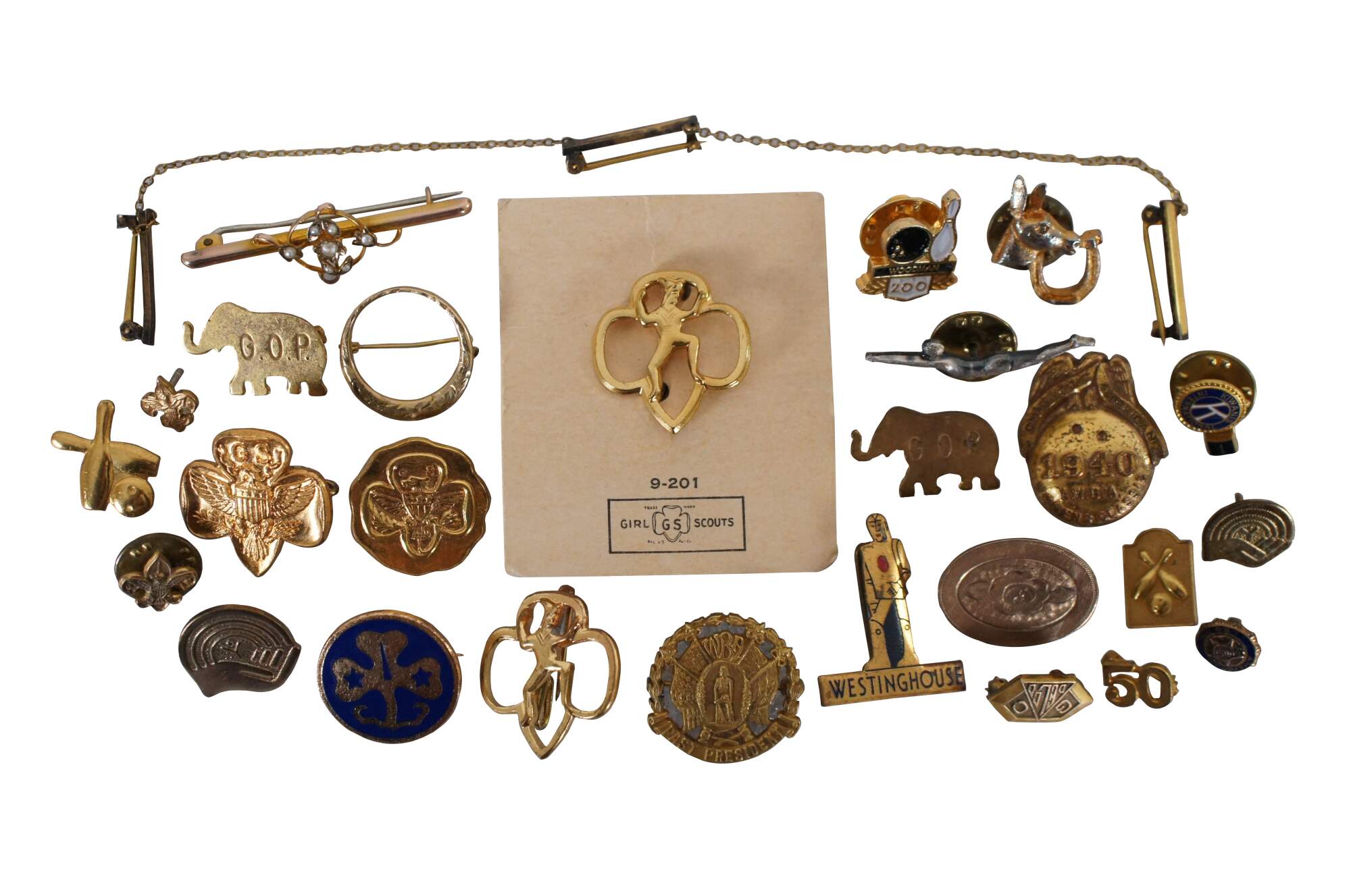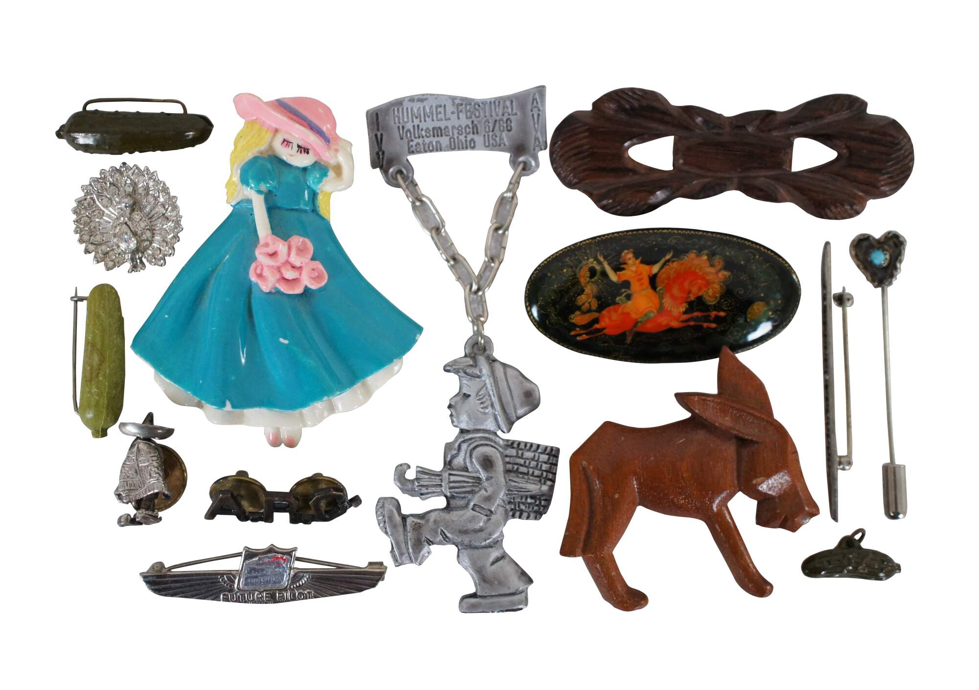 Assorted lot of 39 vintage pins and brooches in a variety of styles, materials and themes including Girl Scouts and Boy Scouts, the G.O.P. Indian painted lacquer, carved wood, pickles, Westinghouse, Donkey, Fleur De Lis, Turkey, Elephant, Diving, Bowling, Eagles, future pilot, American Red Cross ARC, equestrian / horse / horseshoe and Hummel Festival commemorate pin.