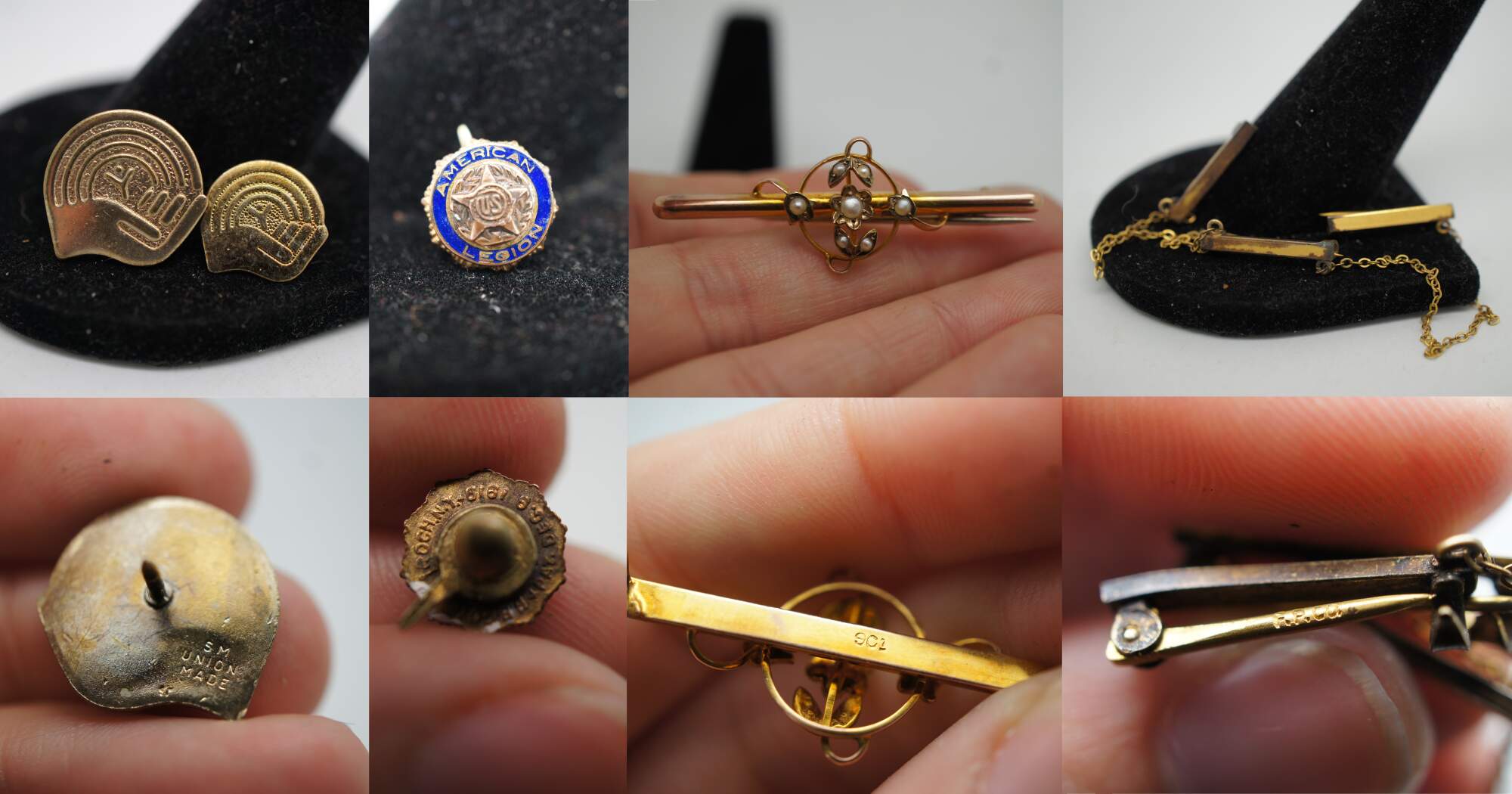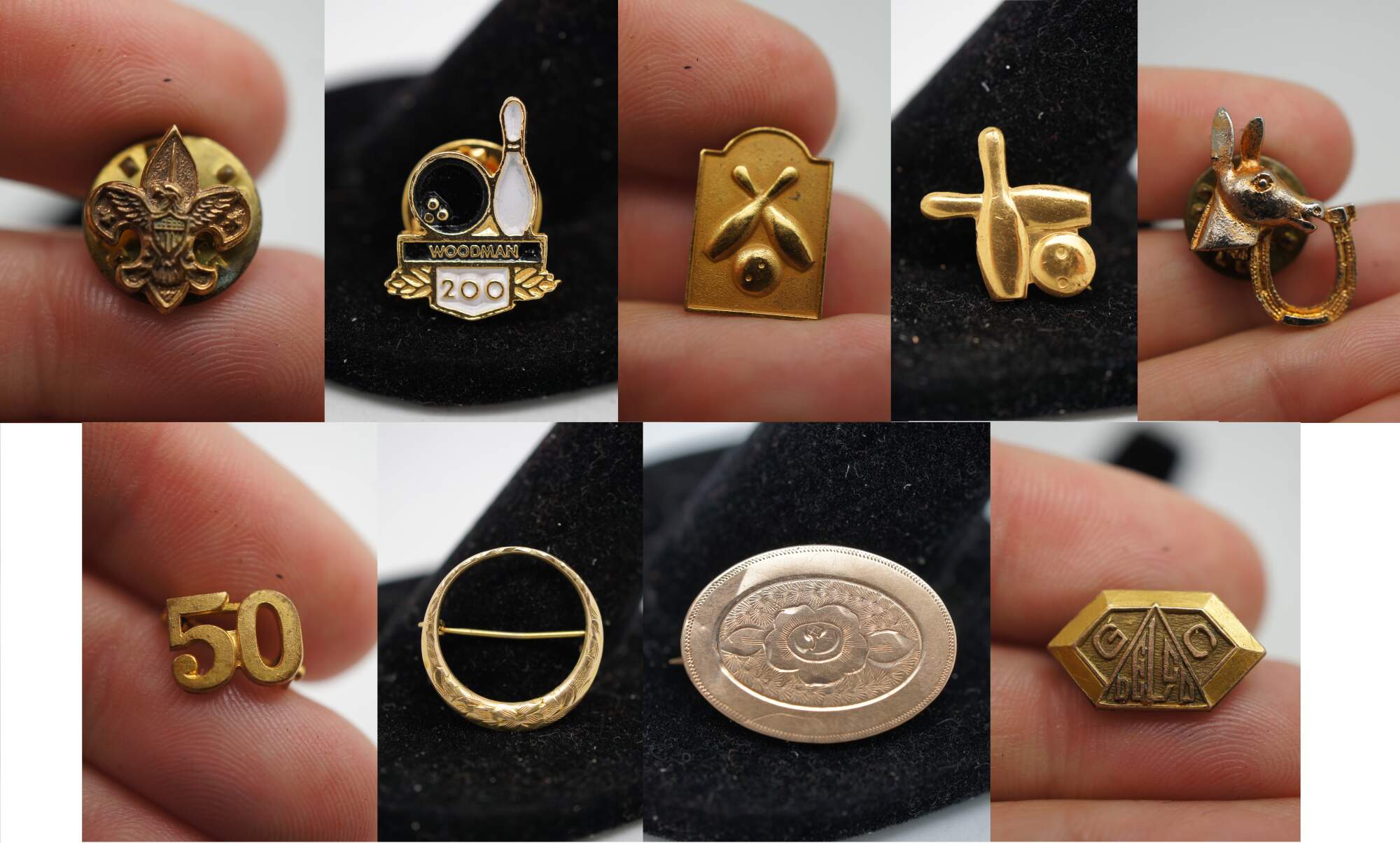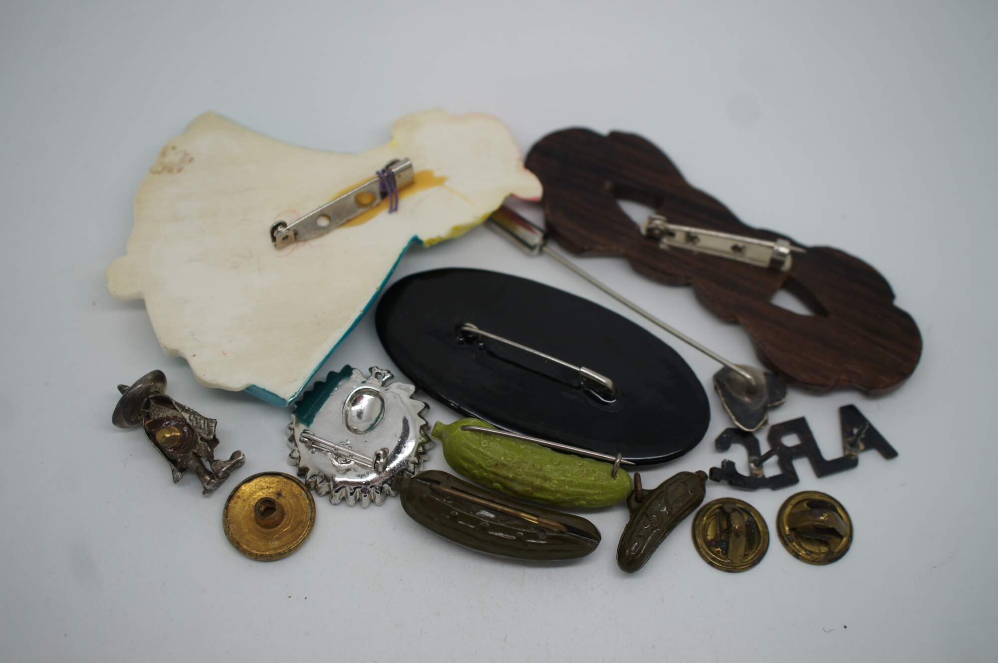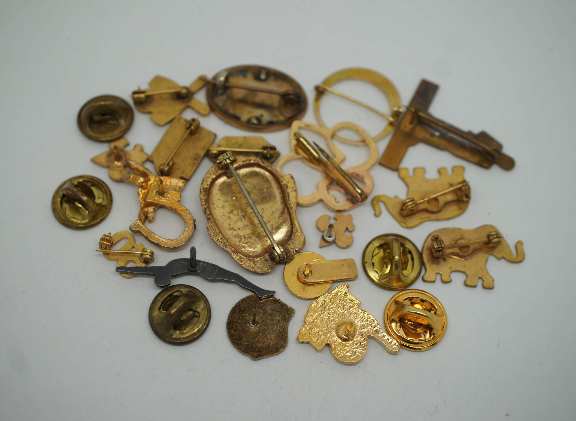 Assorted lot of 39 vintage pins and brooches in a variety of styles, materials and themes including Girl Scouts and Boy Scouts, the G.O.P. Indian painted lacquer, carved wood, pickles, Westinghouse, Donkey, Fleur De Lis, Turkey, Elephant, Diving, Bowling, Eagles, future pilot, American Red Cross ARC, equestrian / horse / horseshoe and Hummel Festival commemorate pin.