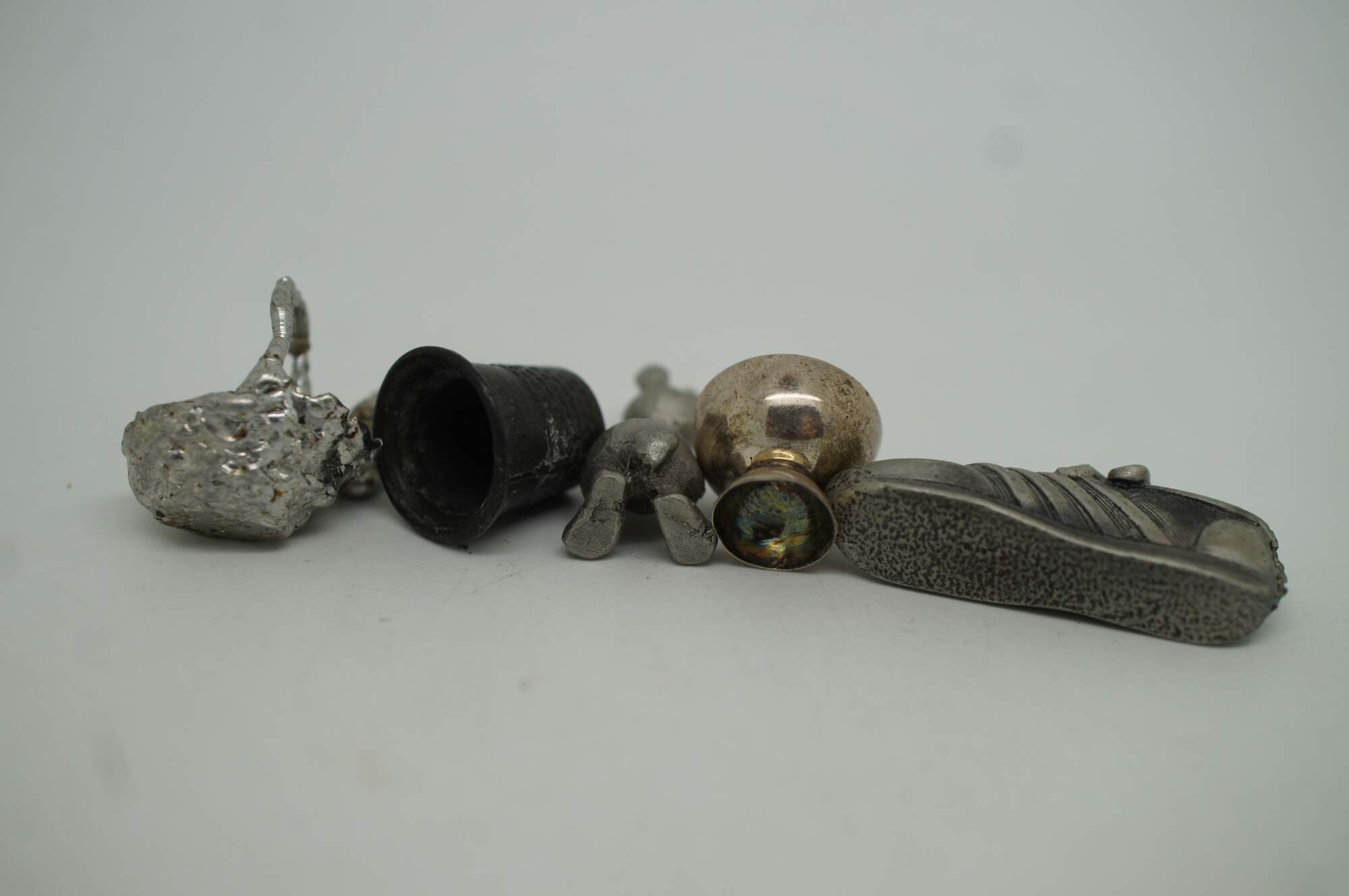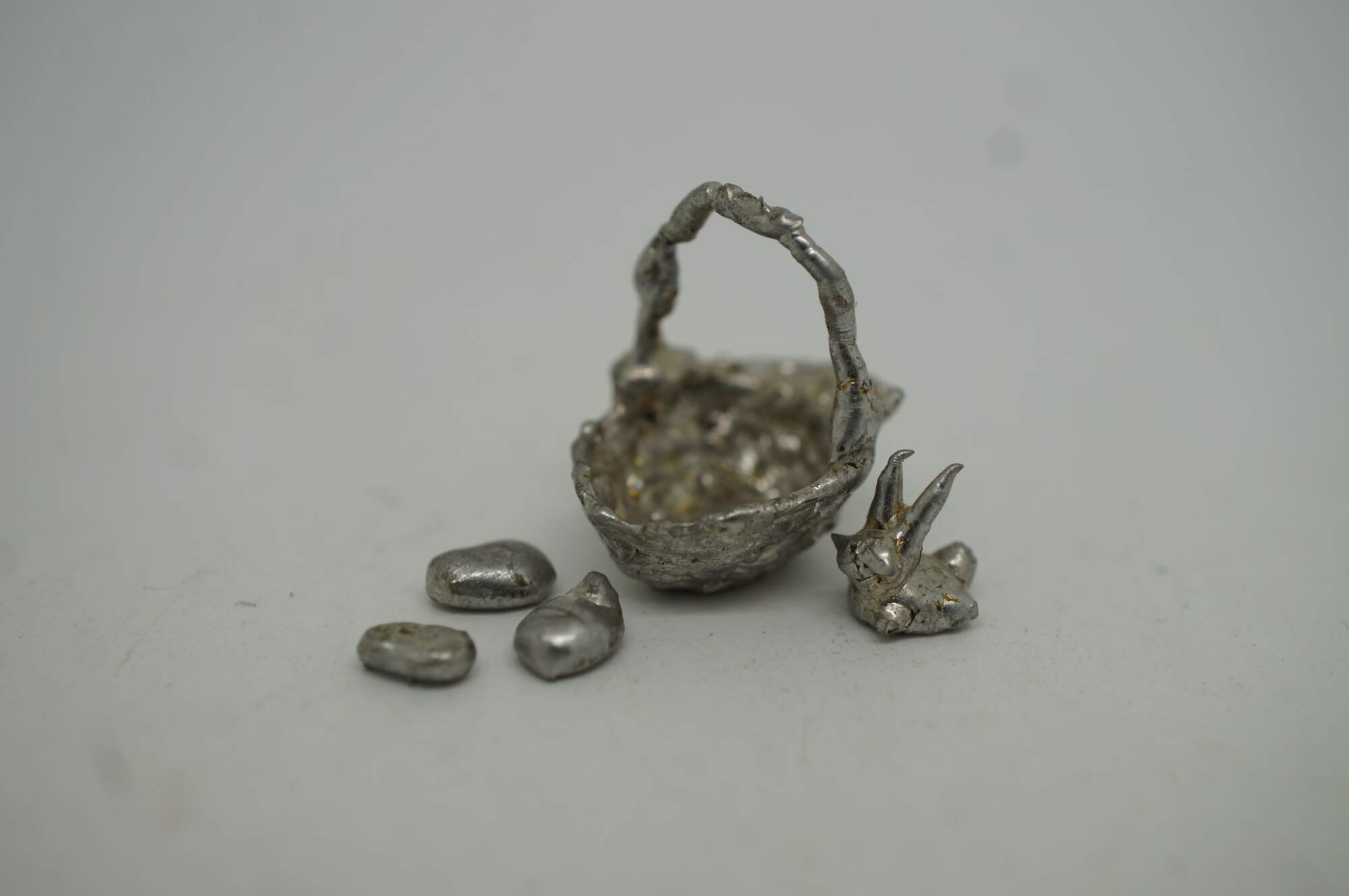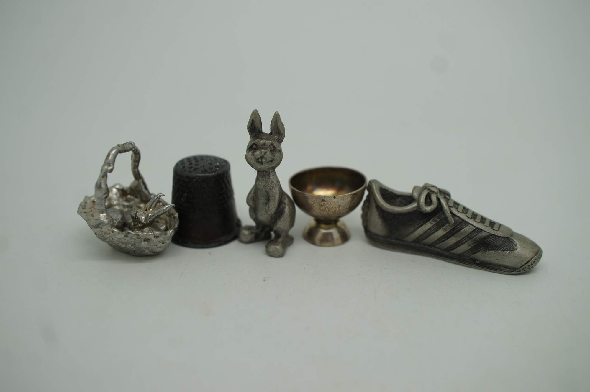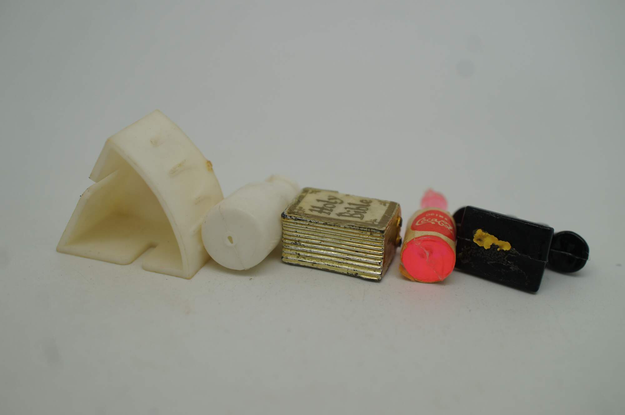 Lot of 27 vintage miniature dollhouse accessories / figurines in plastic and metal / pewter. Includes, tennis shoe, holy bible, bunny / rabbit, easter basket w eggs, camus cognac bottle and goblets, combs, planes, tray, candlestick, challis, telephone / phone, cannon, cake, milk and coca cola.