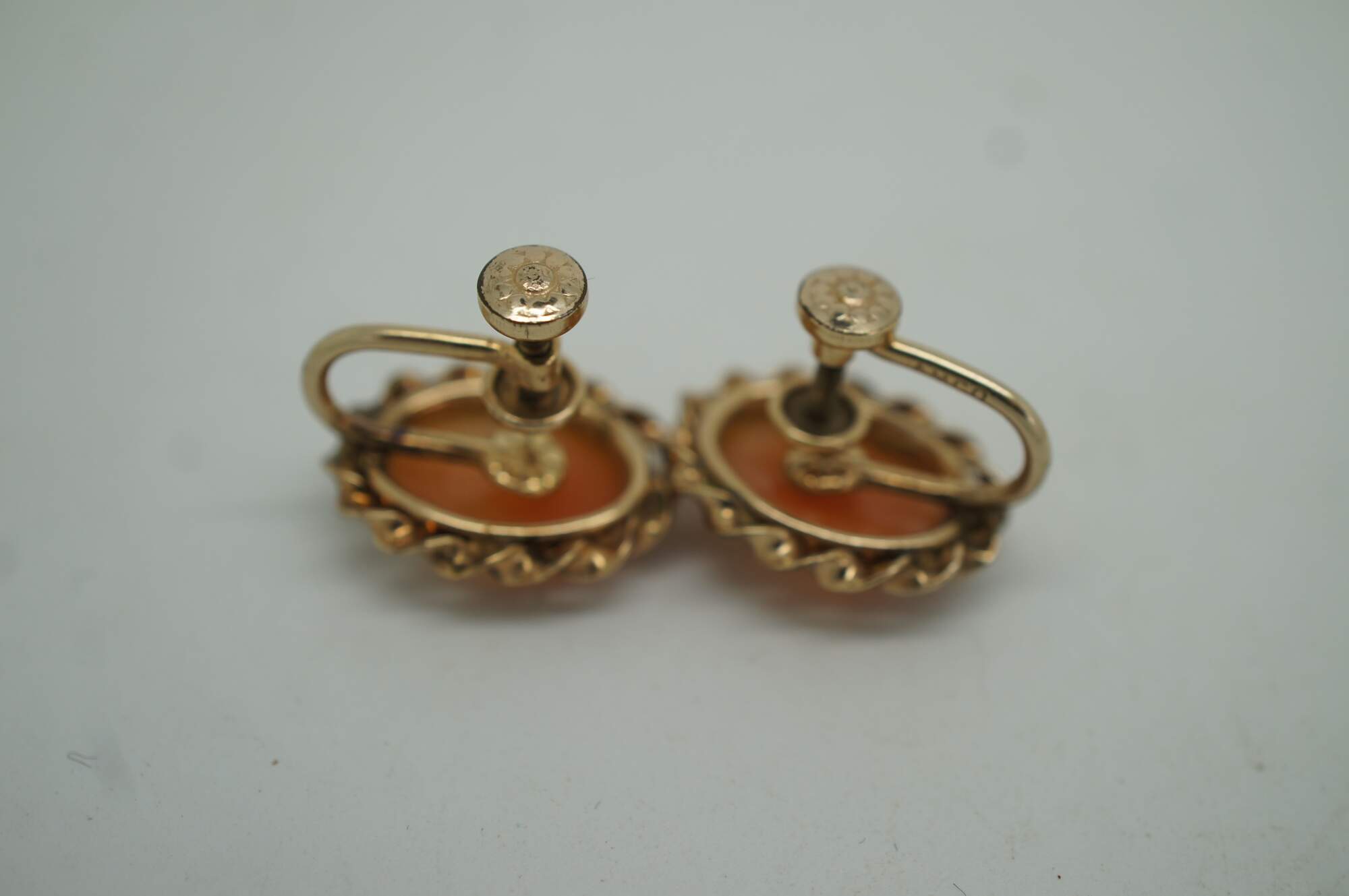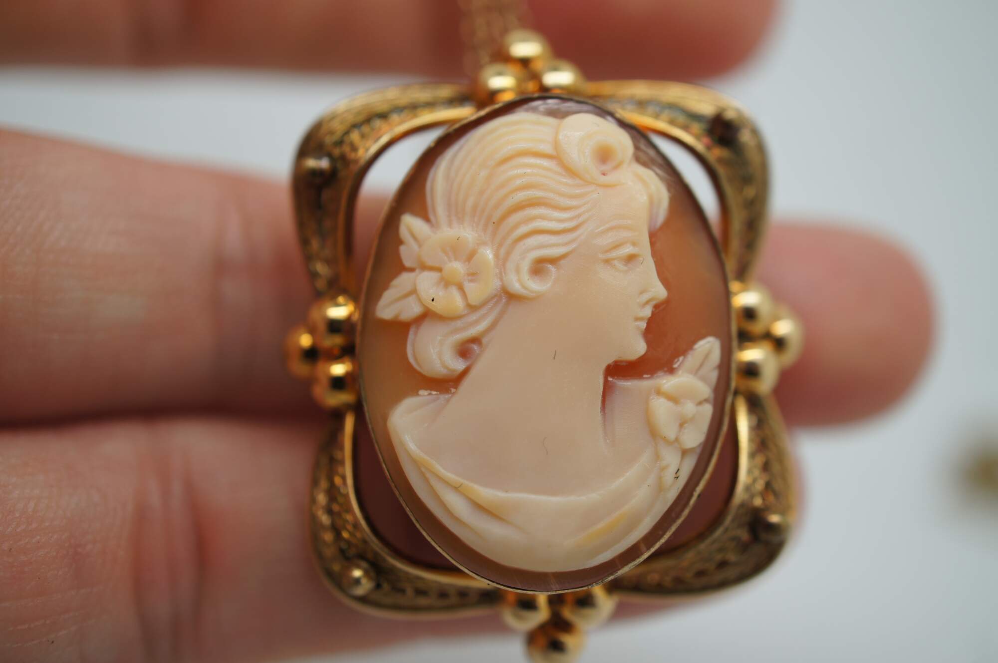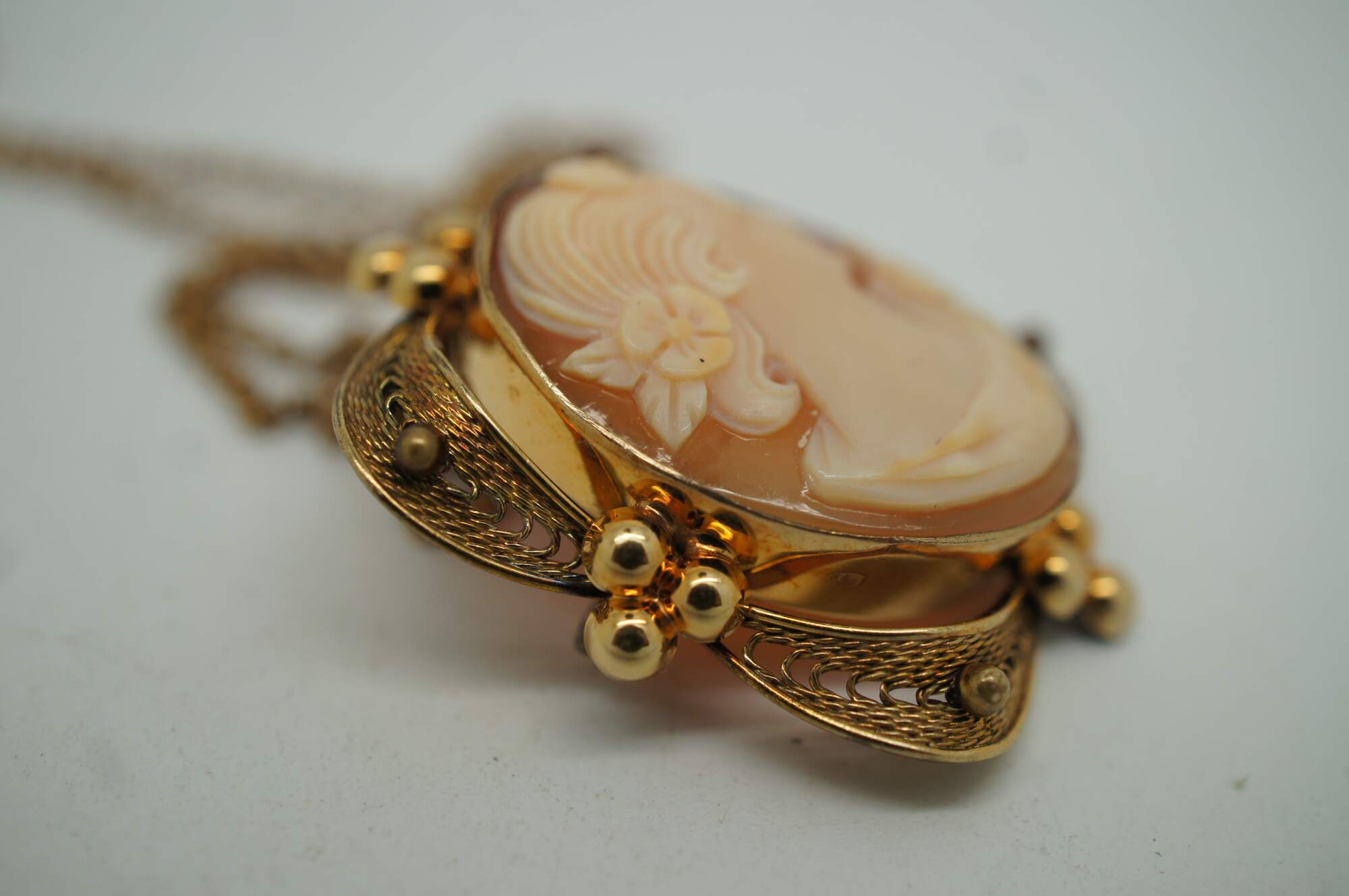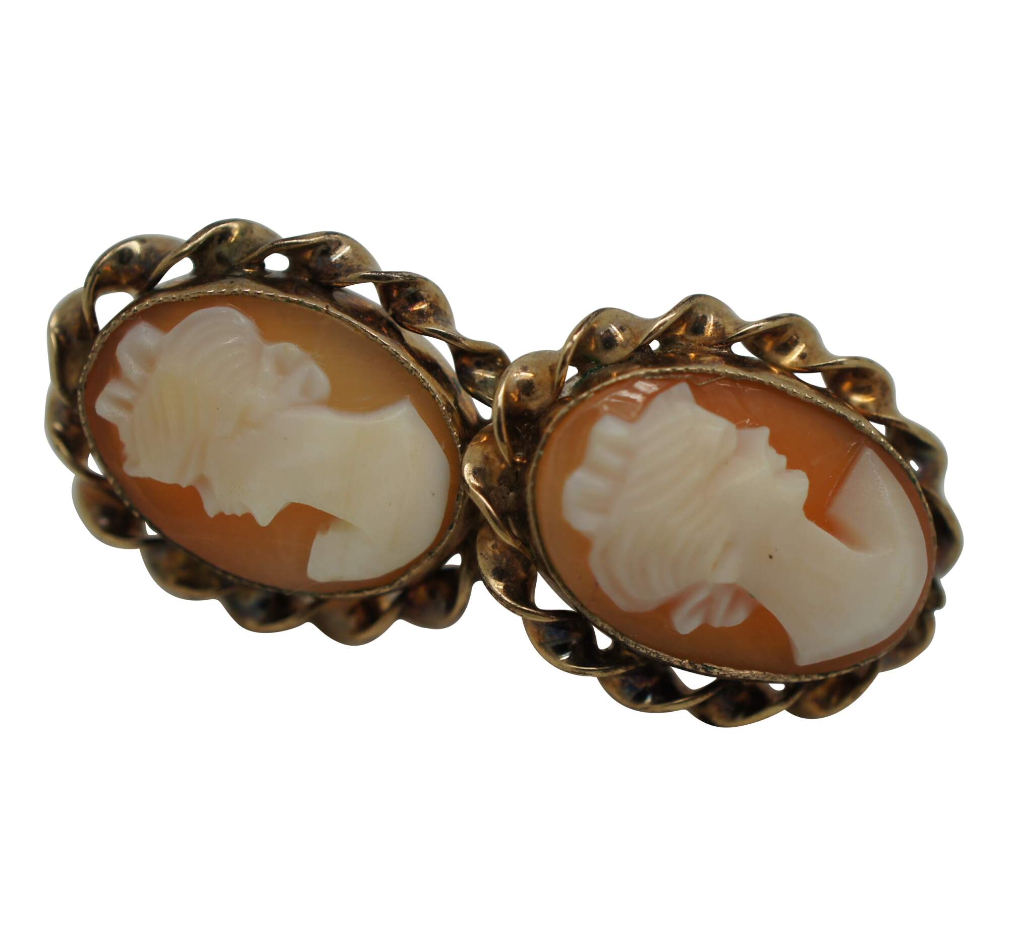 Early to mid 20th century lot of 12K yellow gold filled carved shell cameo jewelry including a pair of Amco screw back earrings with twisted edge, a small oval pendant with beaded edge and cable chain, and a larger oval brooch pin / pendant showing a more detailed female bust with flowers on her hair and dress, in a rectangular filigree frame and cable chain.
