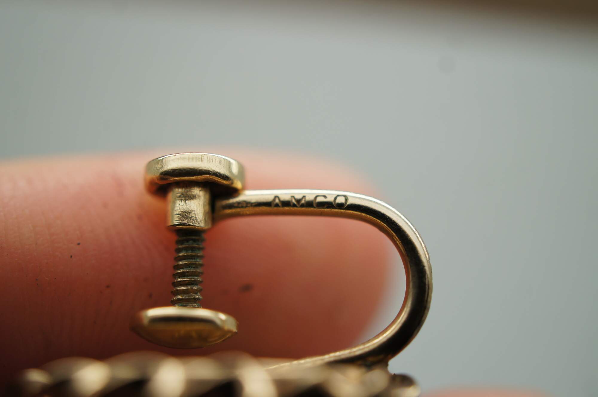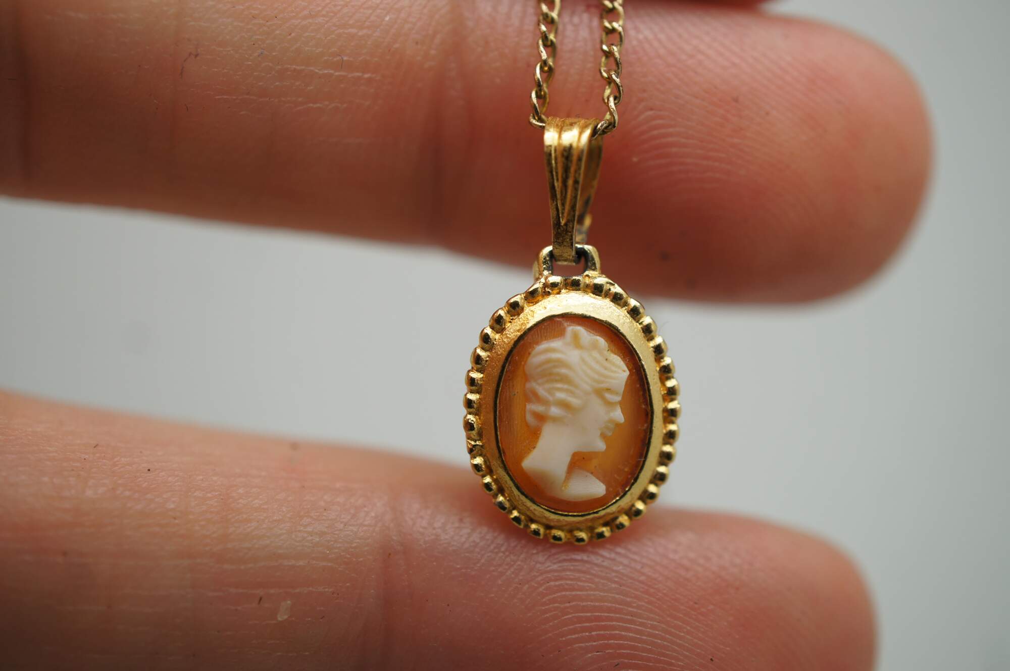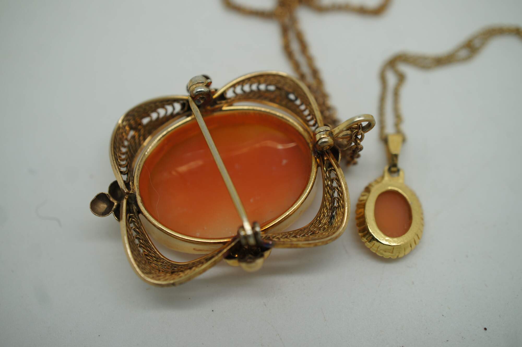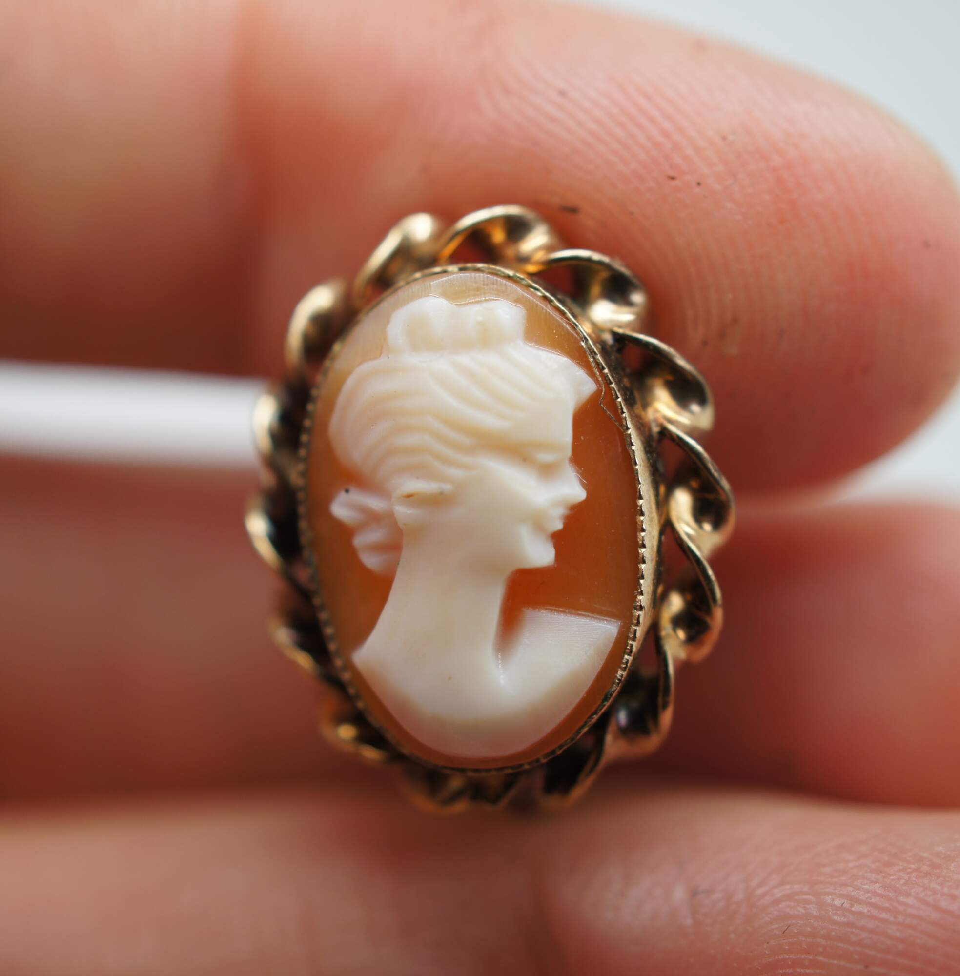 Early to mid 20th century lot of 12K yellow gold filled carved shell cameo jewelry including a pair of Amco screw back earrings with twisted edge, a small oval pendant with beaded edge and cable chain, and a larger oval brooch pin / pendant showing a more detailed female bust with flowers on her hair and dress, in a rectangular filigree frame and cable chain.