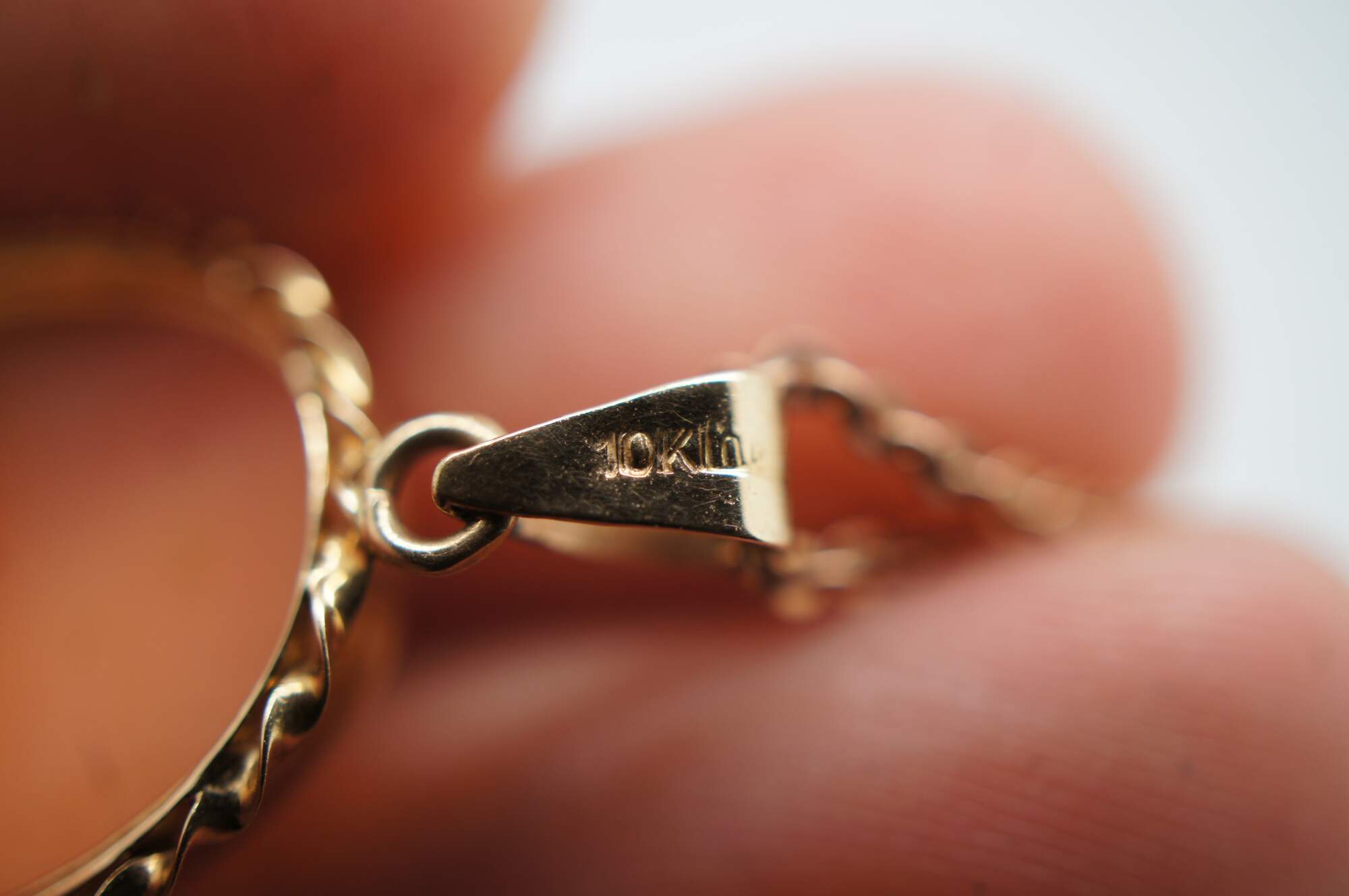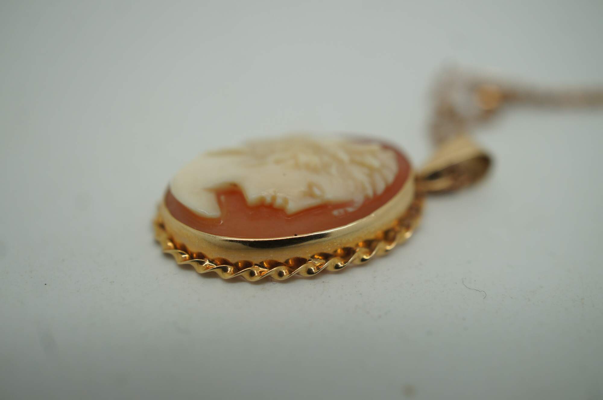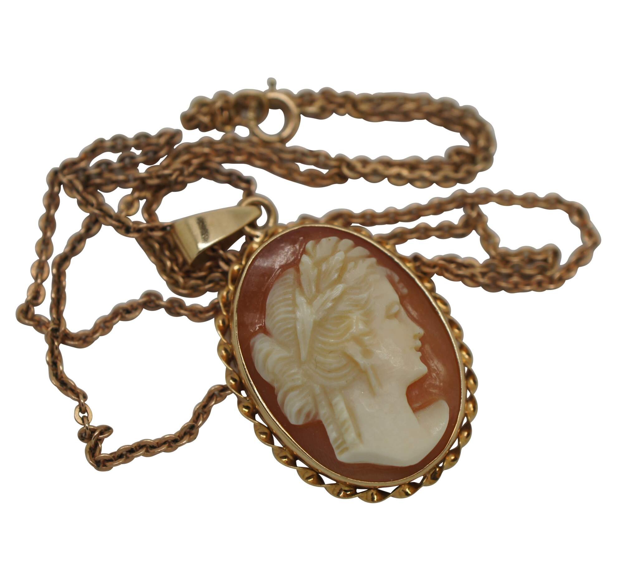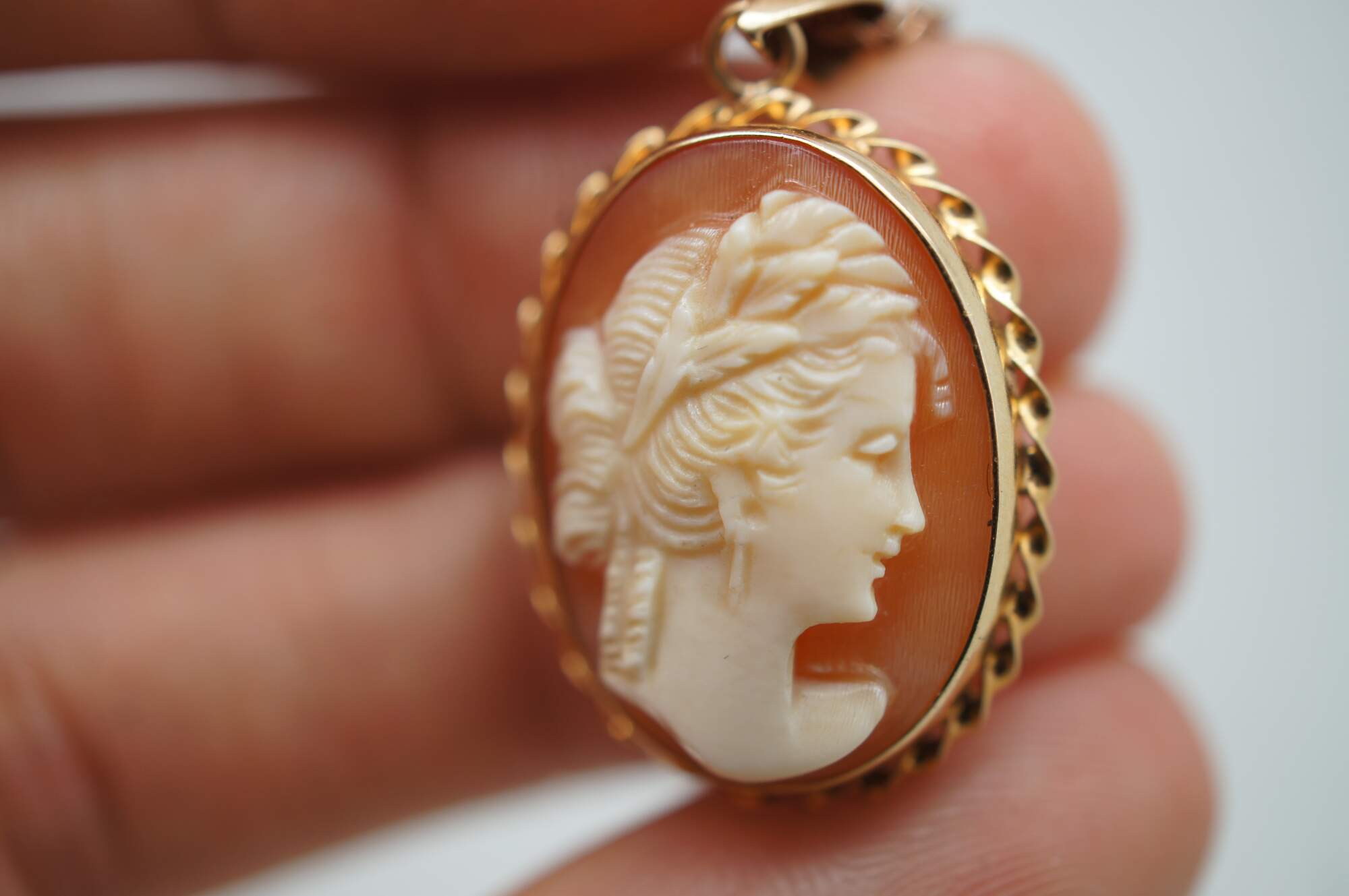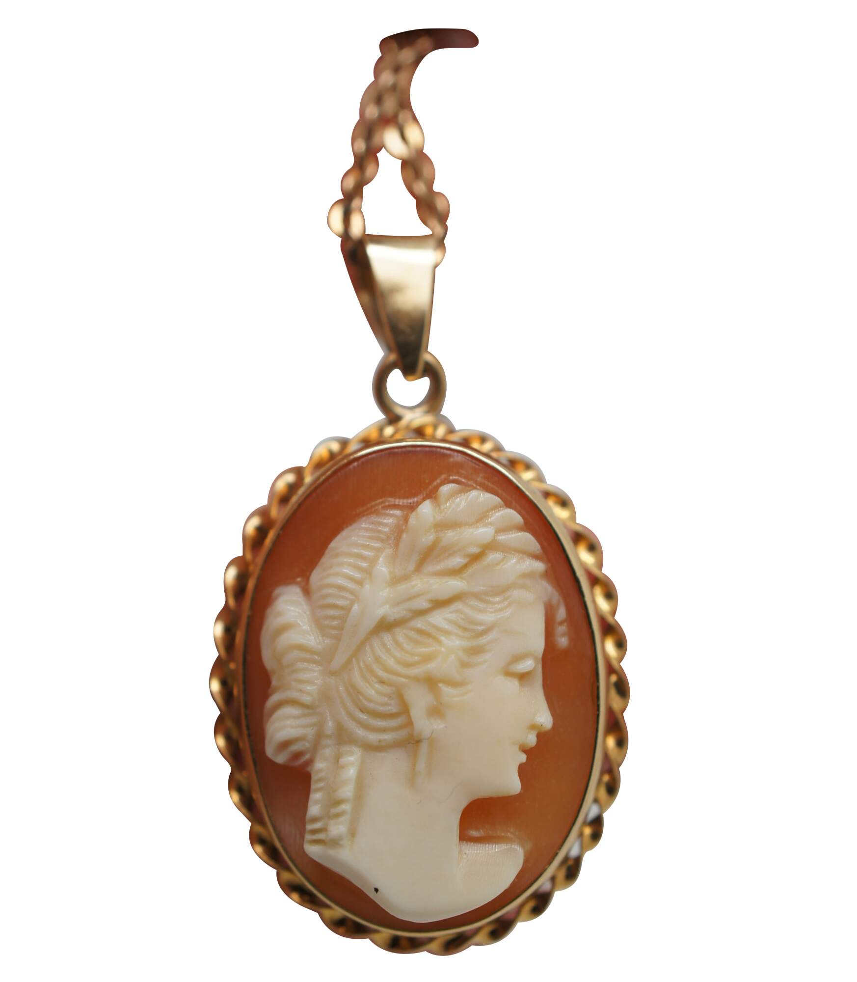 Early 20th century carved shell cameo pendant showing the bust / silhouette of a Neoclassical woman in a laurel wreath crown, framed in a 10k gold twisted frame and chain.