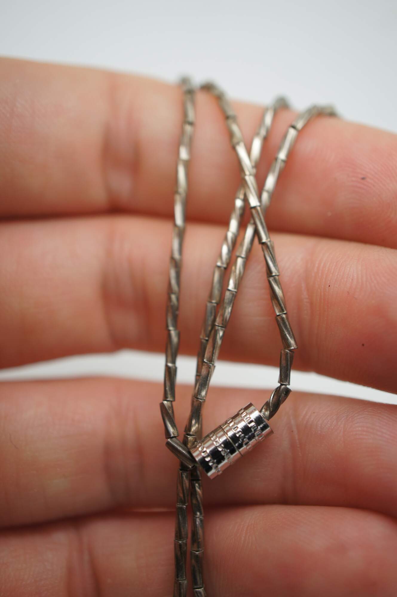 Assorted set of three vintage costume jewelry necklaces – one gold and brown cord bolo tie with white and brown stone slide, triple strand painted faux pearls, and silver beaded pendant with a small turquoise stone.