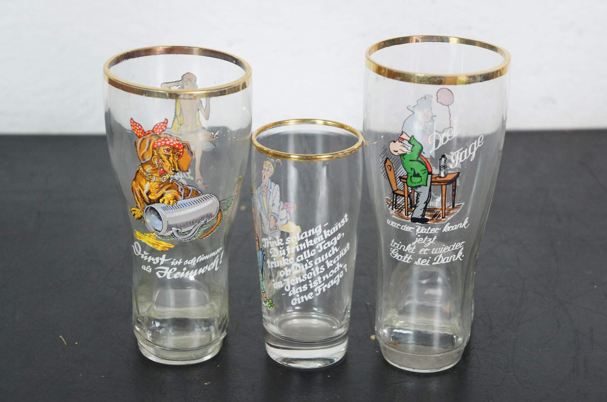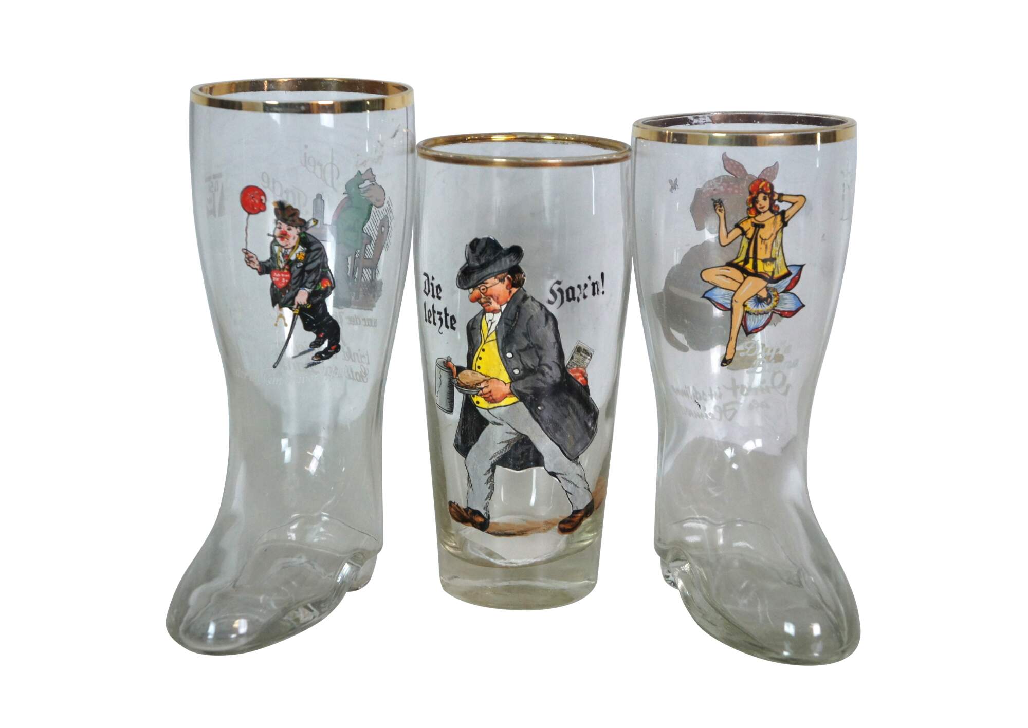 Lot of 23 circa mid-20th century German beer glasses featuring novelty / humorous / risque scenes and figures. Includes 5 boots, 1 goblet and 1 bottle flask.