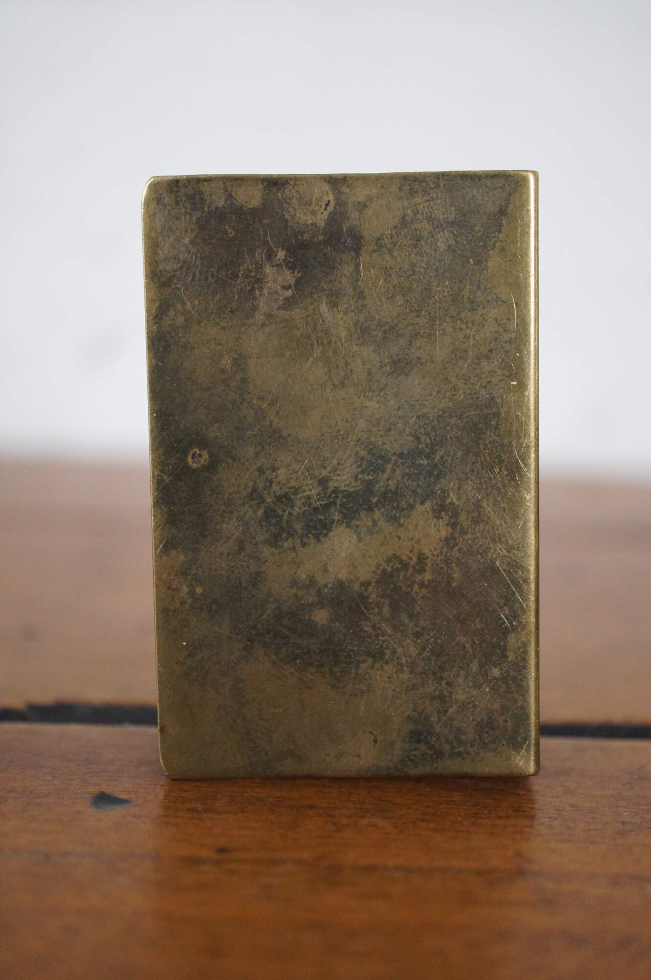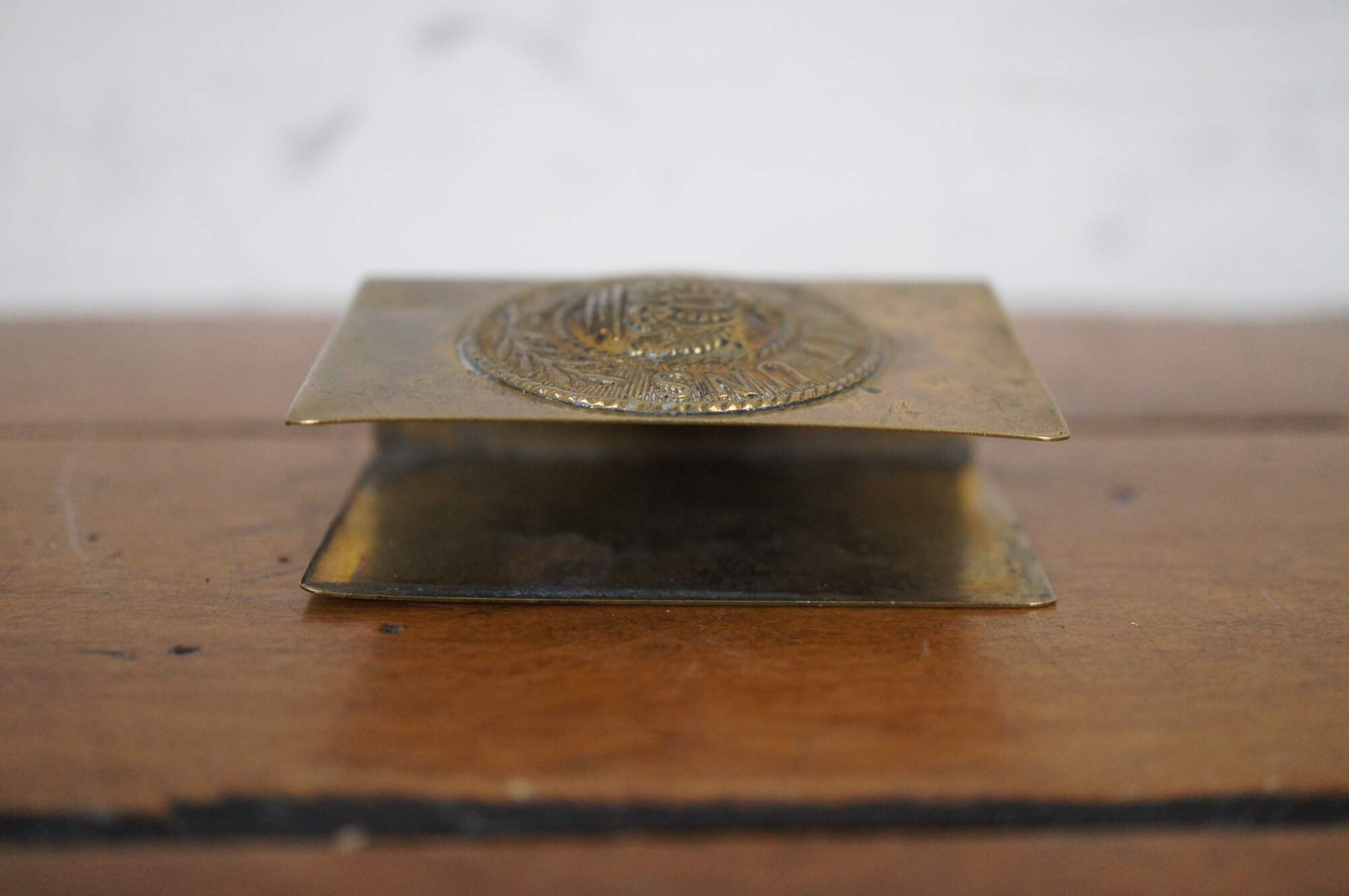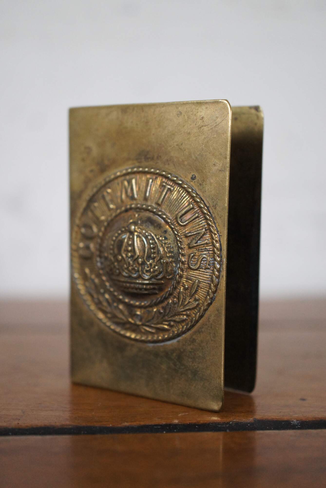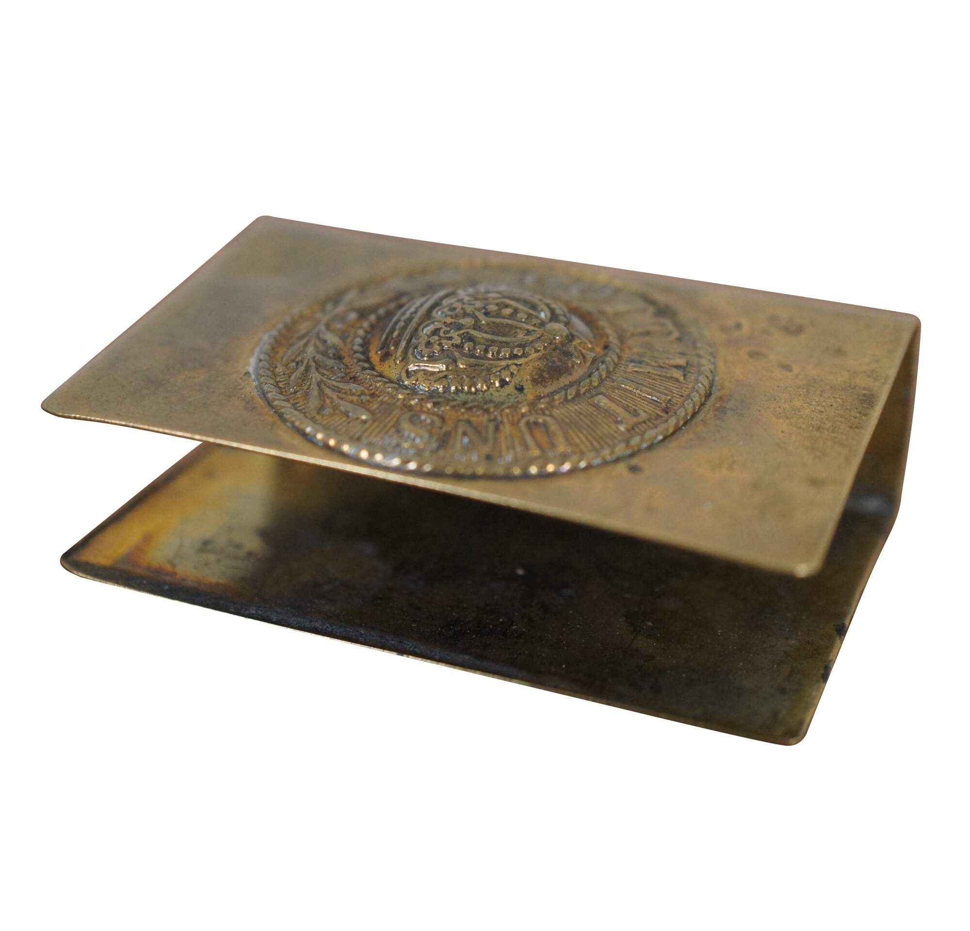 Antique World War I Prussian / German trench art matchbox holder, crafted from the Imperial Army brass belt buckle, featuring a medallion with rope twist edges and a crown at the center, ringed with the words Gott Mit Uns and olive branches.