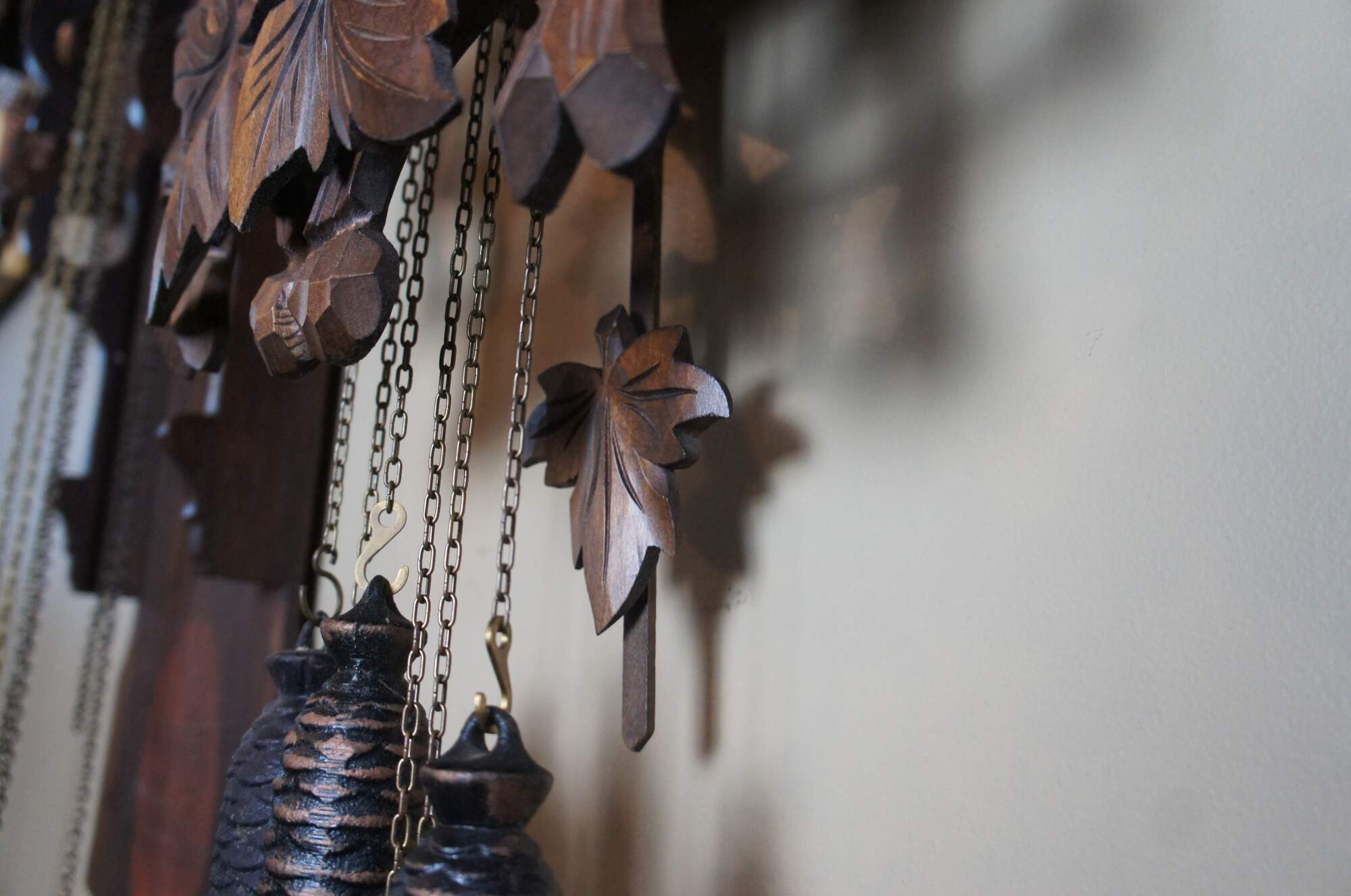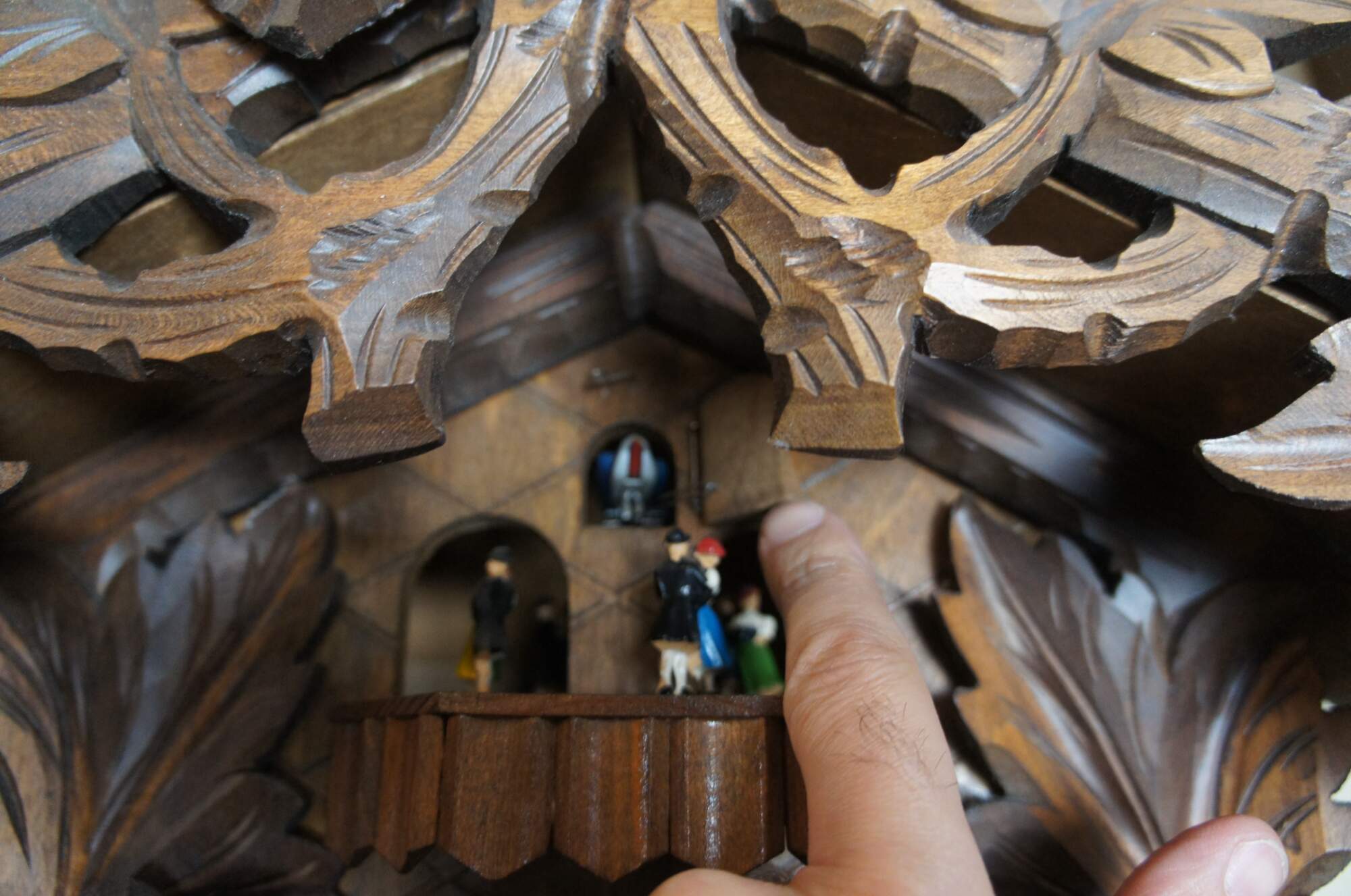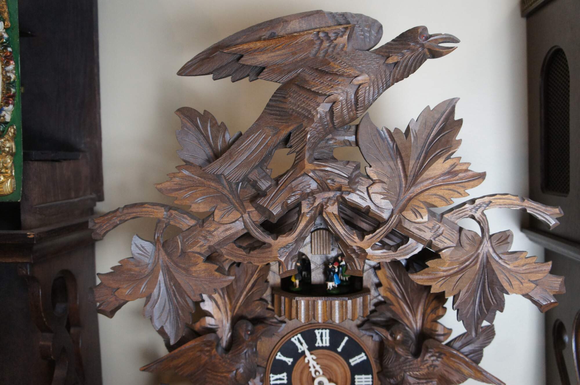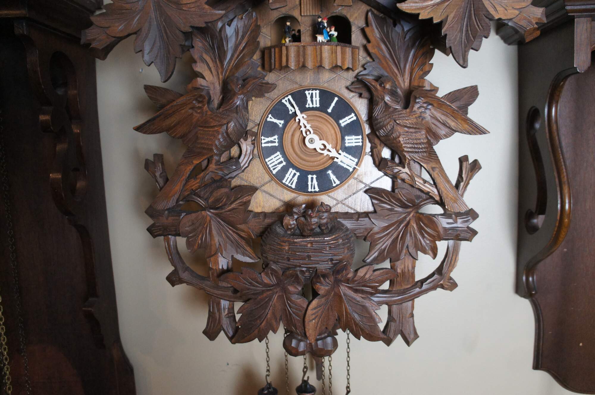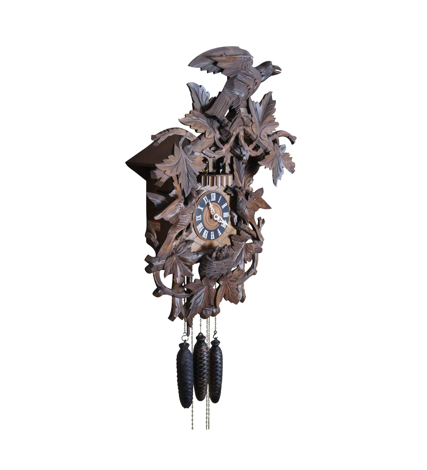 A large vintage black forest cuckoo wall clock, made in Germany. Features Regula-72 German 8 day movement with Cuendet Swiss musical movement playing Lara's Theme from Dr. Zhivago. The Roman numeral clock face has a lattice backing and is surrounded by carved birds, branches and leaves. Includes 3 pinecone weights and a leaf carved finial. A single cuckoo comes out along the top at the half hour and again at the full hour. The dancers rotate and spin at the top of each hour as music is playing.