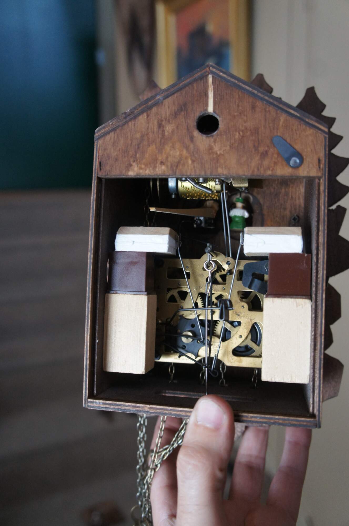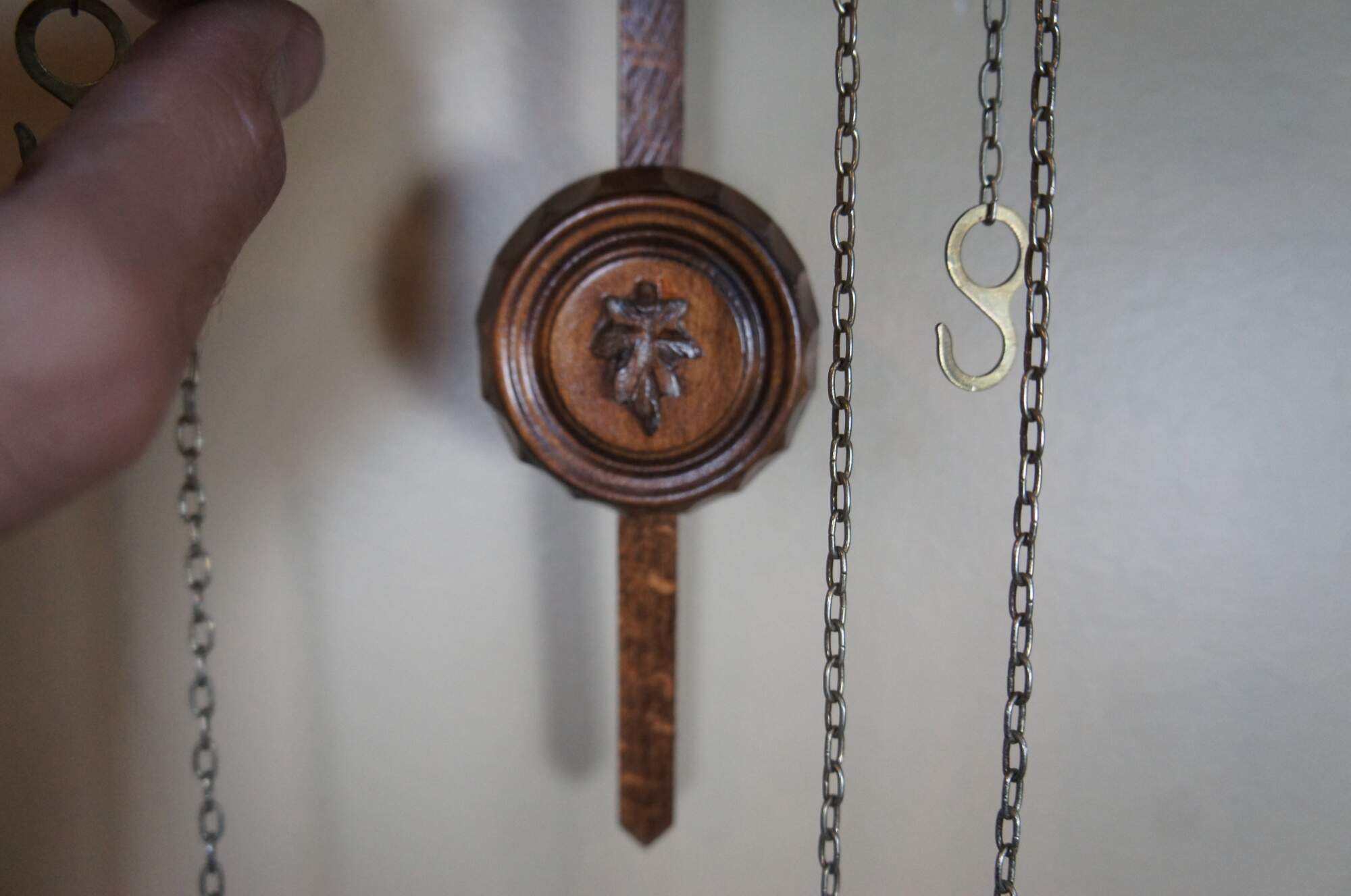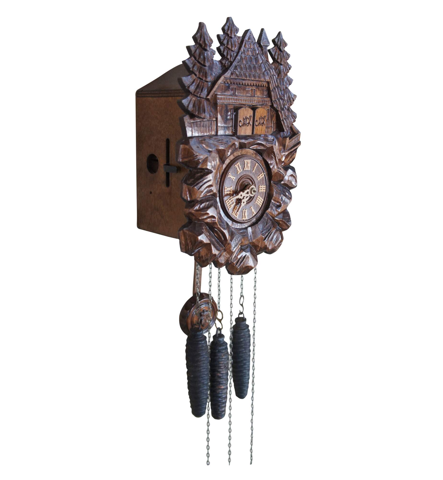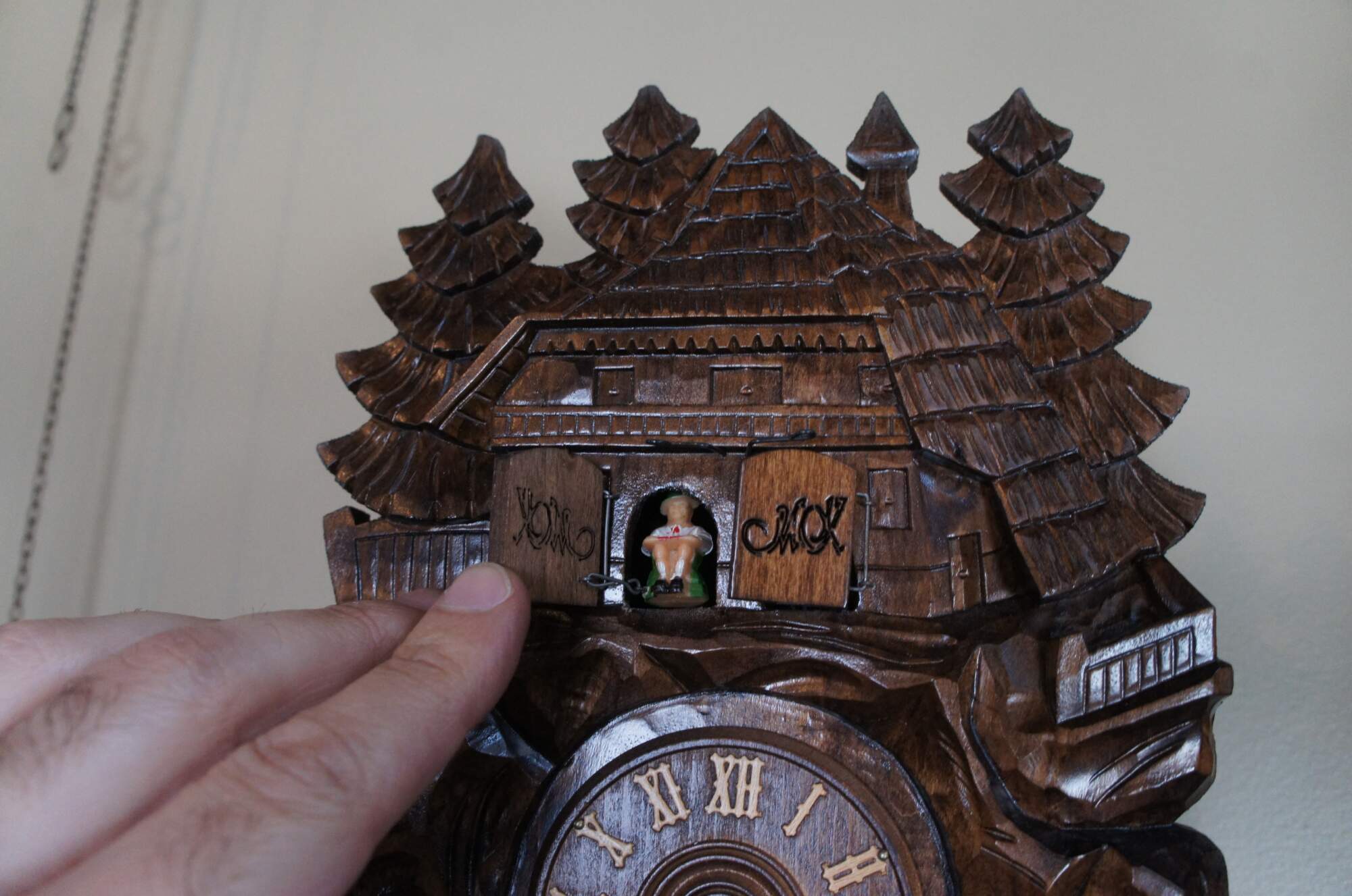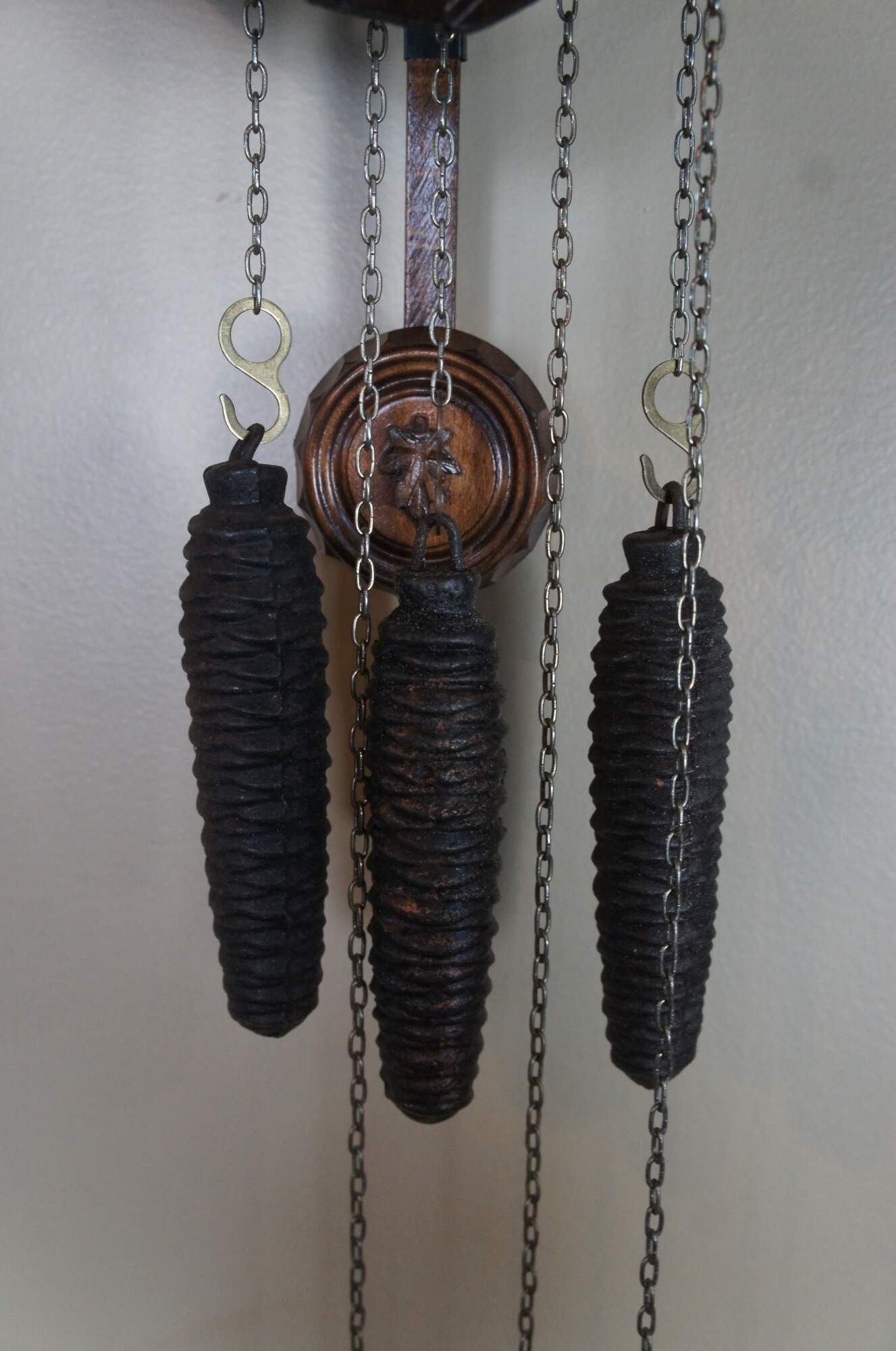 Vintage Black Forest style Cuckoo Clock with German works and Swiss Musical Chime Der Frohliche Wanderer Edelweiss R Rodgers 2708. Features carved house with trees along the top, roman numeral face, pinecone weights and rounded finial with leaf. Features two doors at the top. A cuckoo on the right and man along the left.