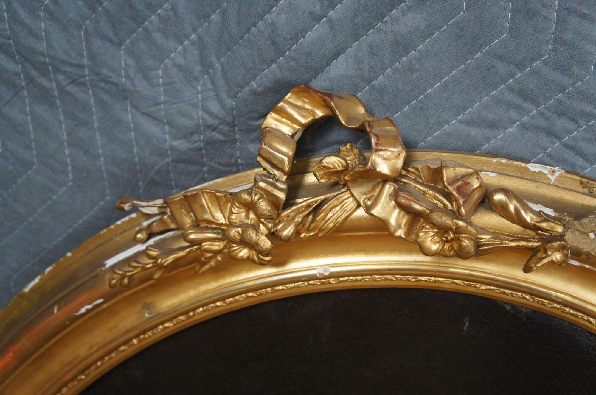 Good antique condition with general use related wear. The frame is heavily bowed with wear the gilding and a split to one of the ribboned accents along the top. The canvas is in mostly good cood condition with light crazing. Some heavier crazing by the arms and a few blemishes.