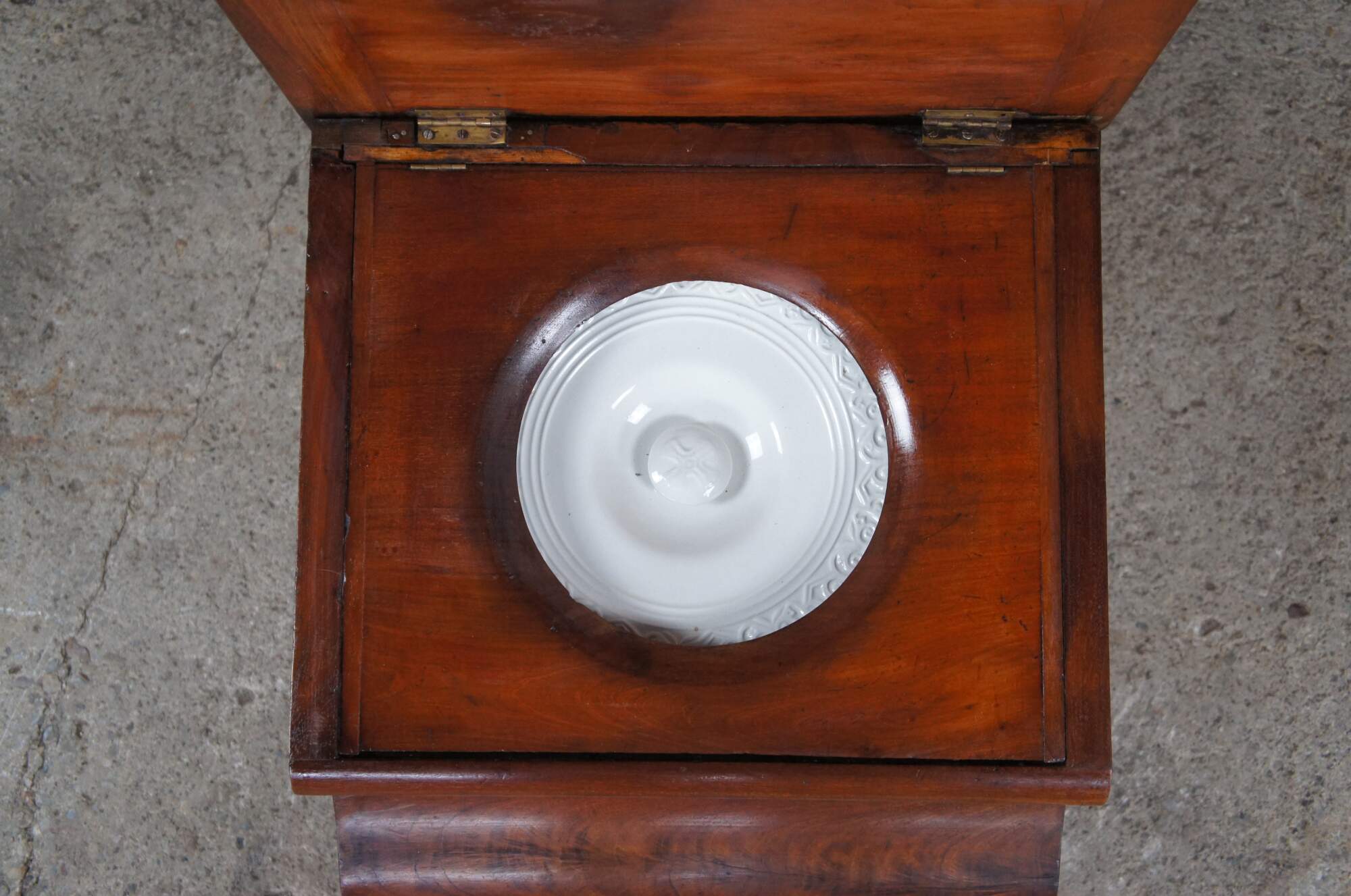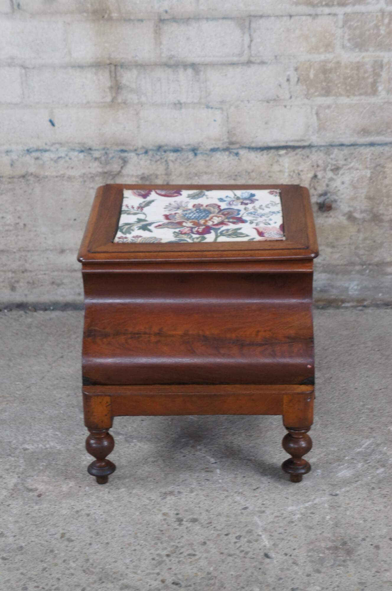 Mid 19th century chamber pot or commode. Made from mahogany with a crotch mahogany contoured front. Features a pull out needelepoint steep stool and matching embroidered top. The top opens to a porcelain chamber with lid. The case is supported by ornately turned feet.