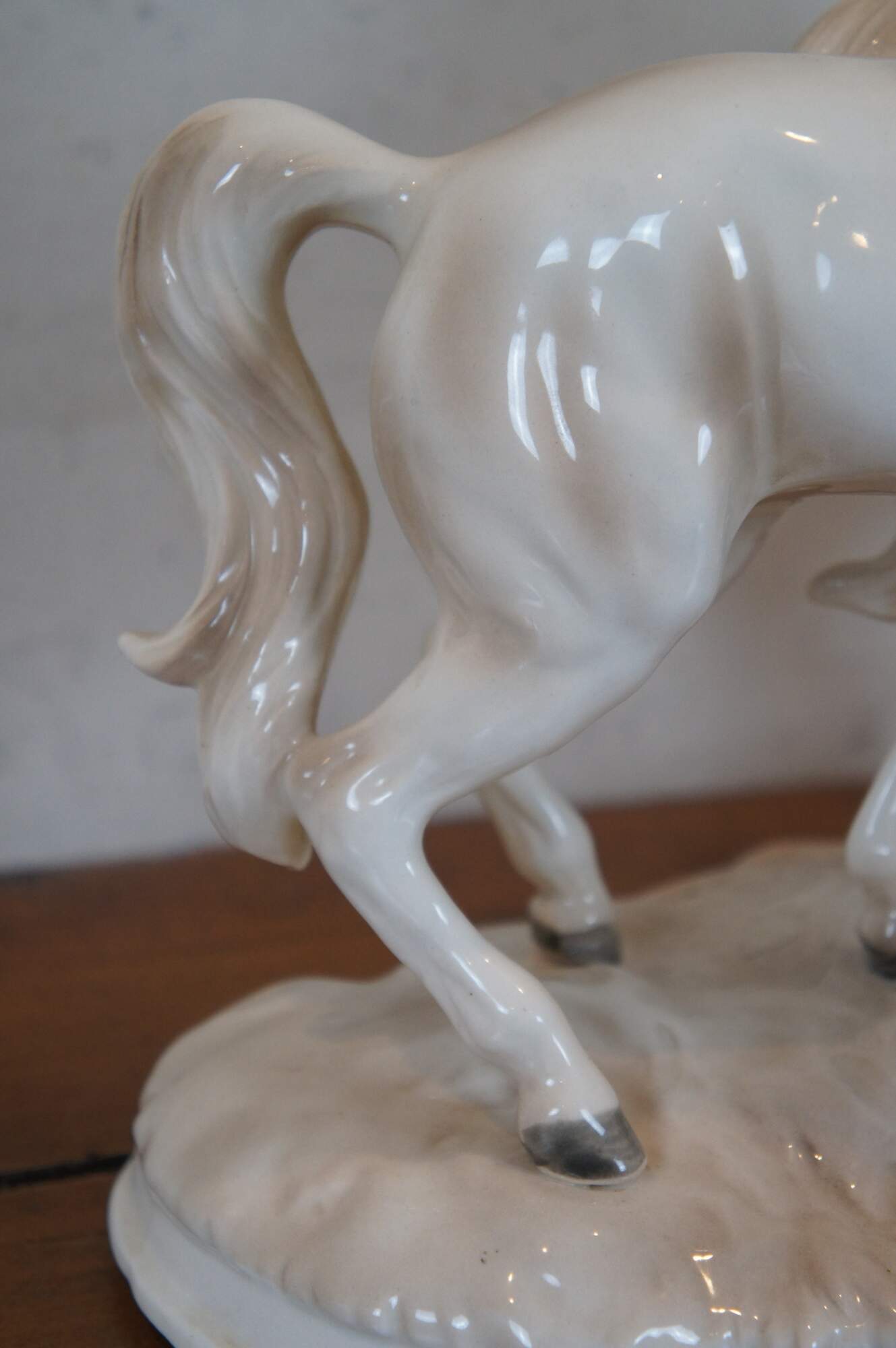 Large vintage porcelain sculpture showing a group of three horses / stallions running together, marked J. Stewarle on the bask side. Base shows the remains of the black triangular Czech Republic / Czechoslovakia stamp, attributed to Royal Dux, post WWII.