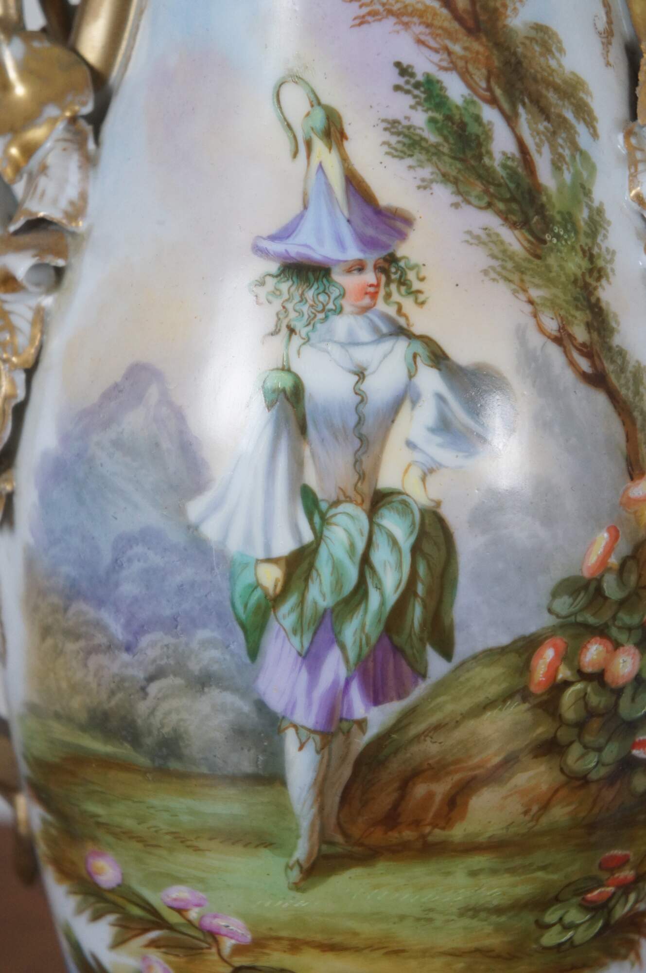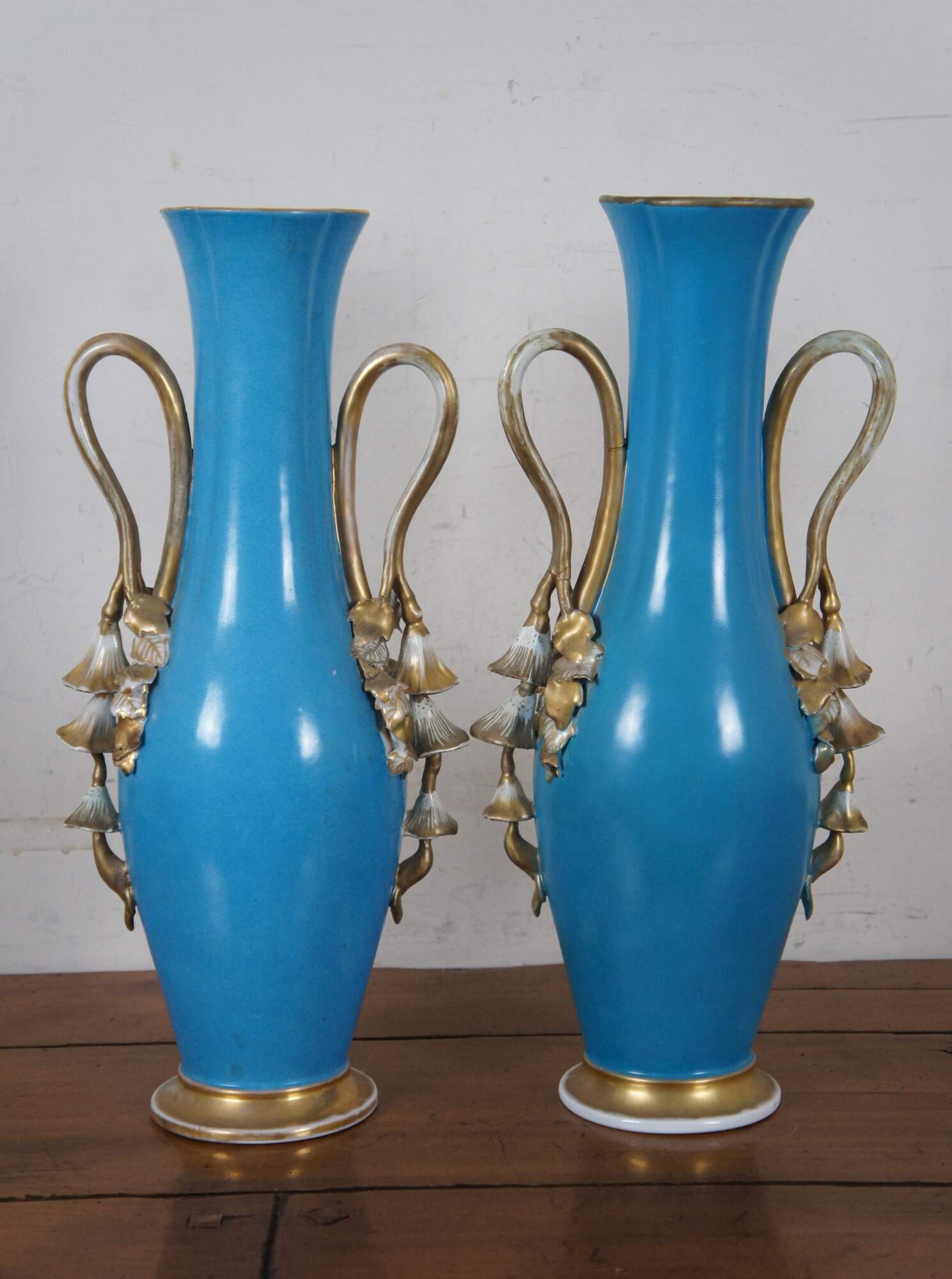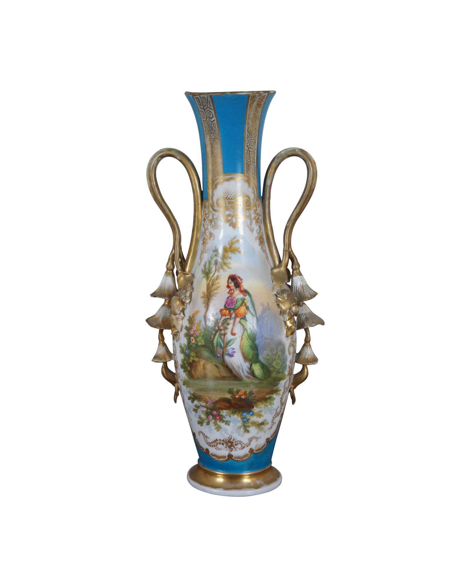 Pair of antique French Sevres style porcelain mantel vases in turquoise blue and gold, the double handles molded in a cascade of bell shaped flowers, hand painted with fey figures dressed in gowns of flower petals and leaves.