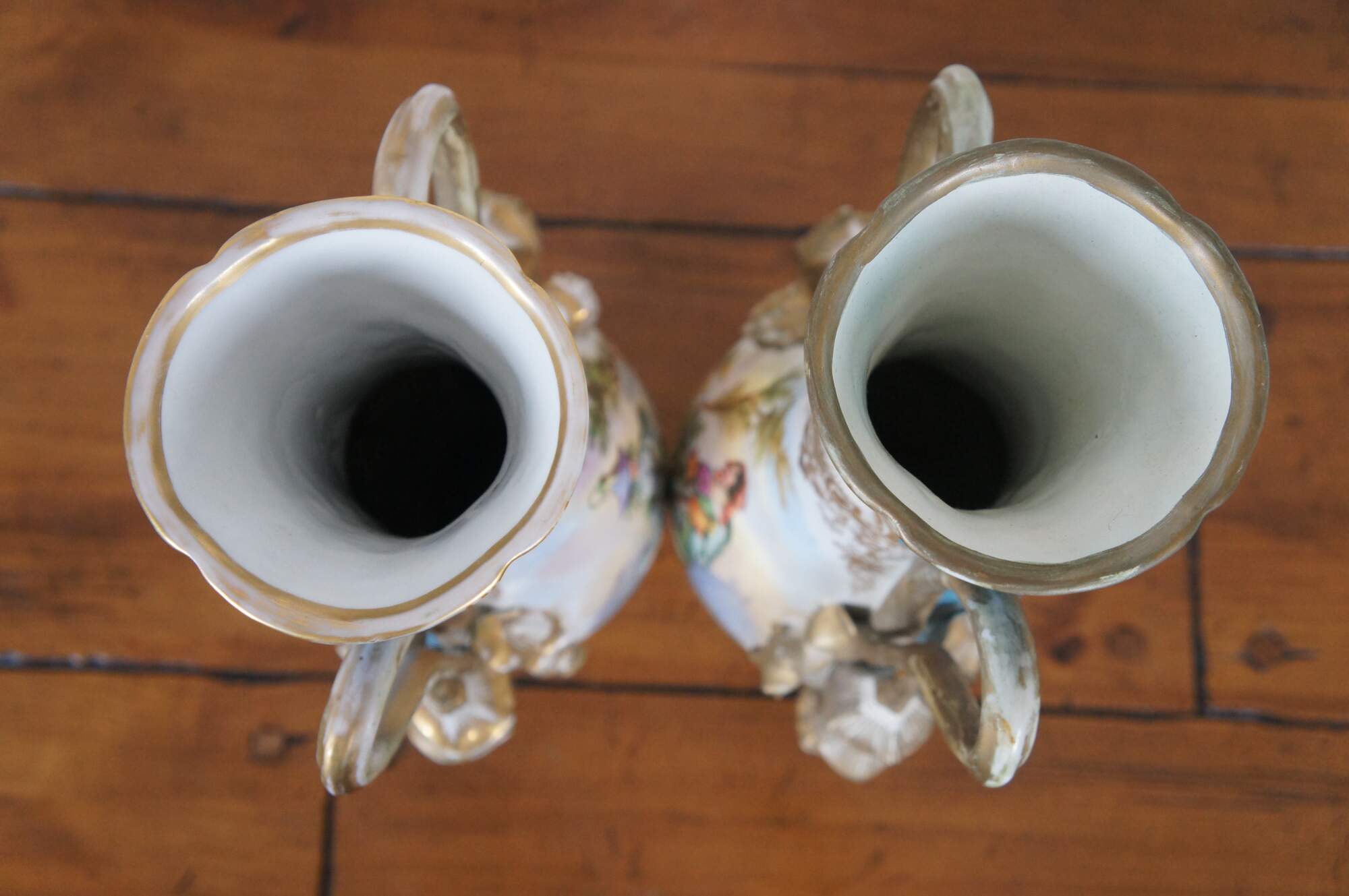 Fair condition, wear and distressing to paint, one has past repair to handle and mouth