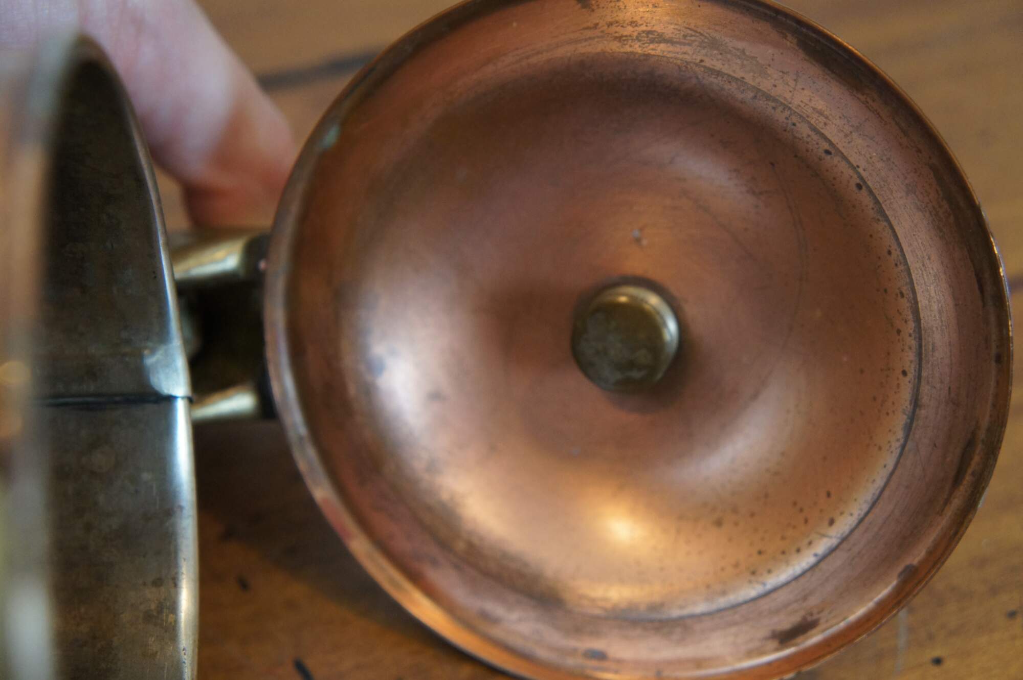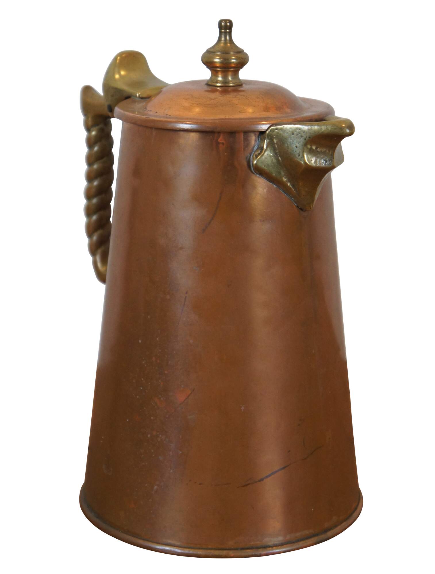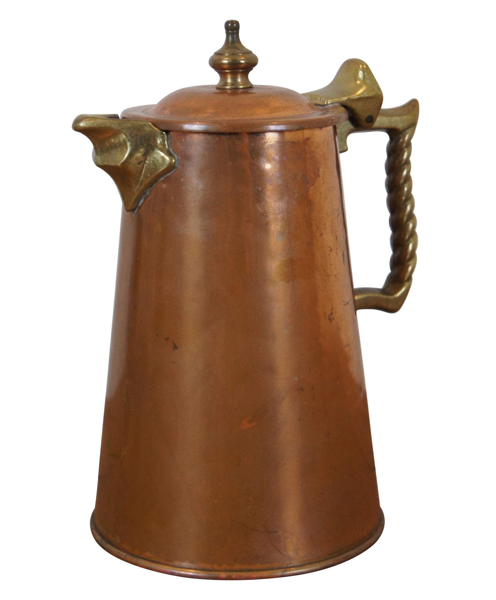 Vintage Colonial style, lightly hammered copper farmhouse kettle / water pitcher with brass spout, finial, and twist handle. Hand made by Colonial Virgina of Hampton VA.