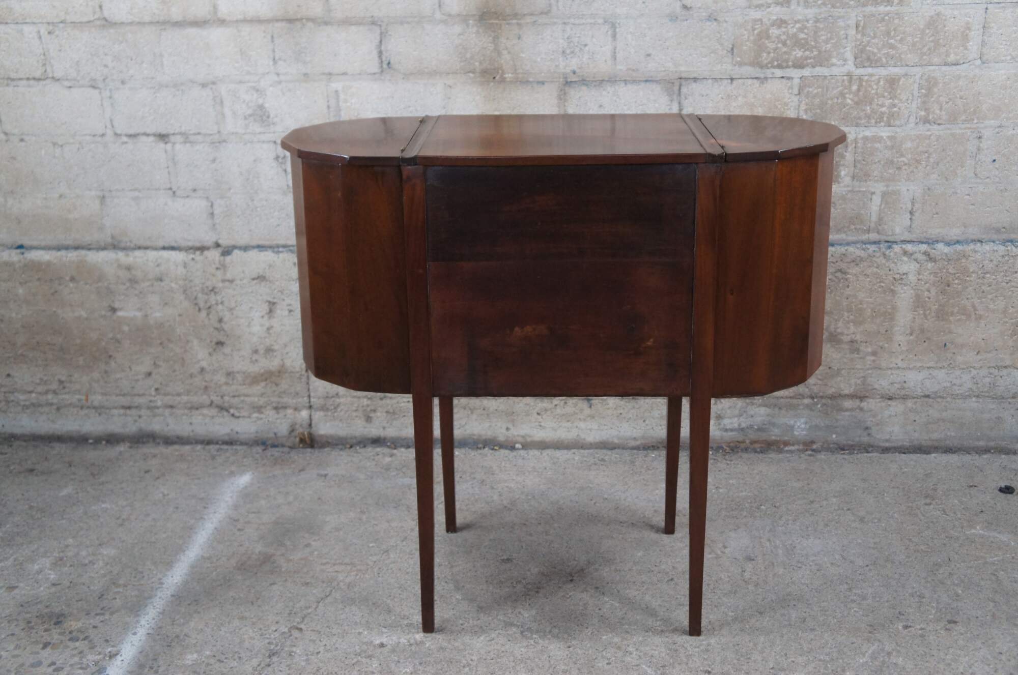 An eye catching turn of the 20th century Martha Washington sewing table. Made from mahogany with three dovetailed drawers having crotched veneer fronts and faceted glass pulls. Features demilune hinged side pockets and square tapered legs.