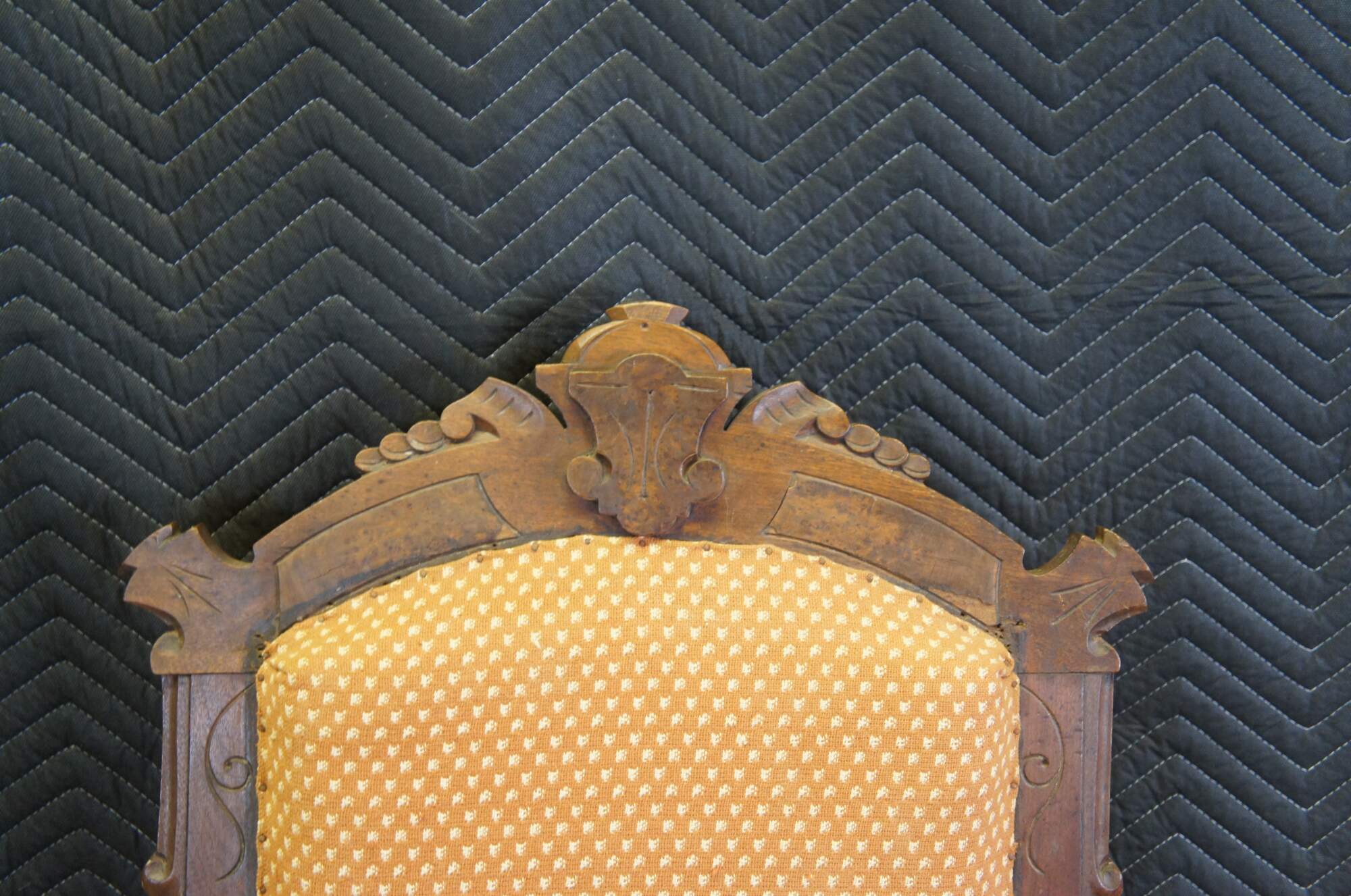 Antique Victorian parlor armchair. Made of walnut featuring Eastlake styling with carved frame, fauteuil arms and turned legs with castors.